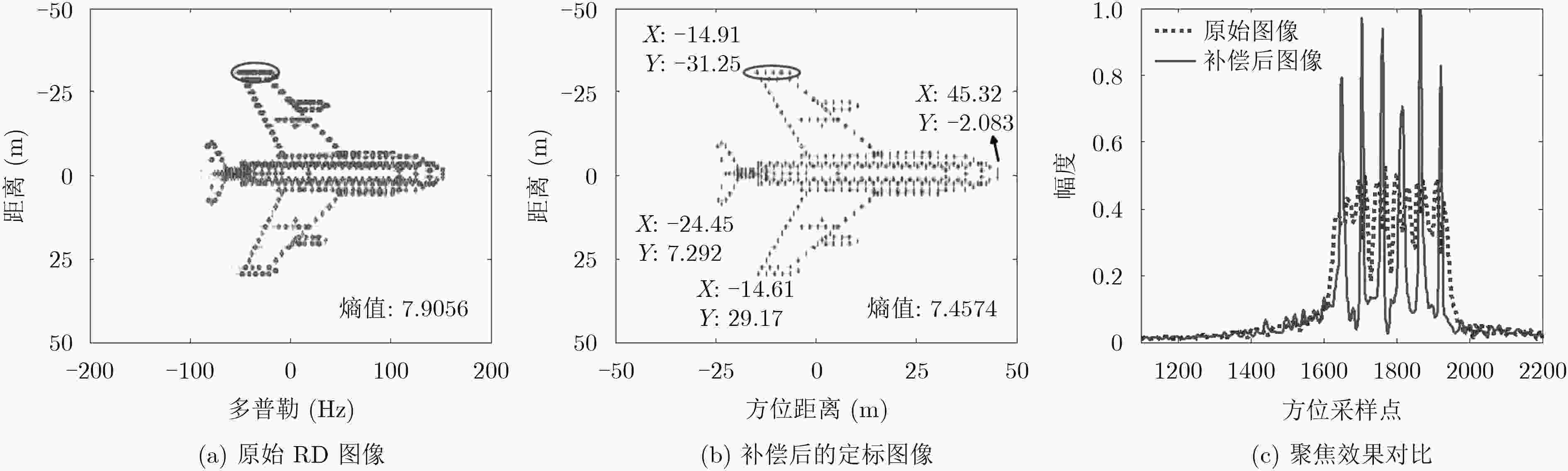带宽 240 MHz 距离采样点数 349 中心频率 10 GHz 方位采样点数 512 采样频率 216 MHz 距离分辨率 0.625 m 脉冲重复频率 500 Hz 方位分辨率 0.3 m 表 1 仿真参数设置