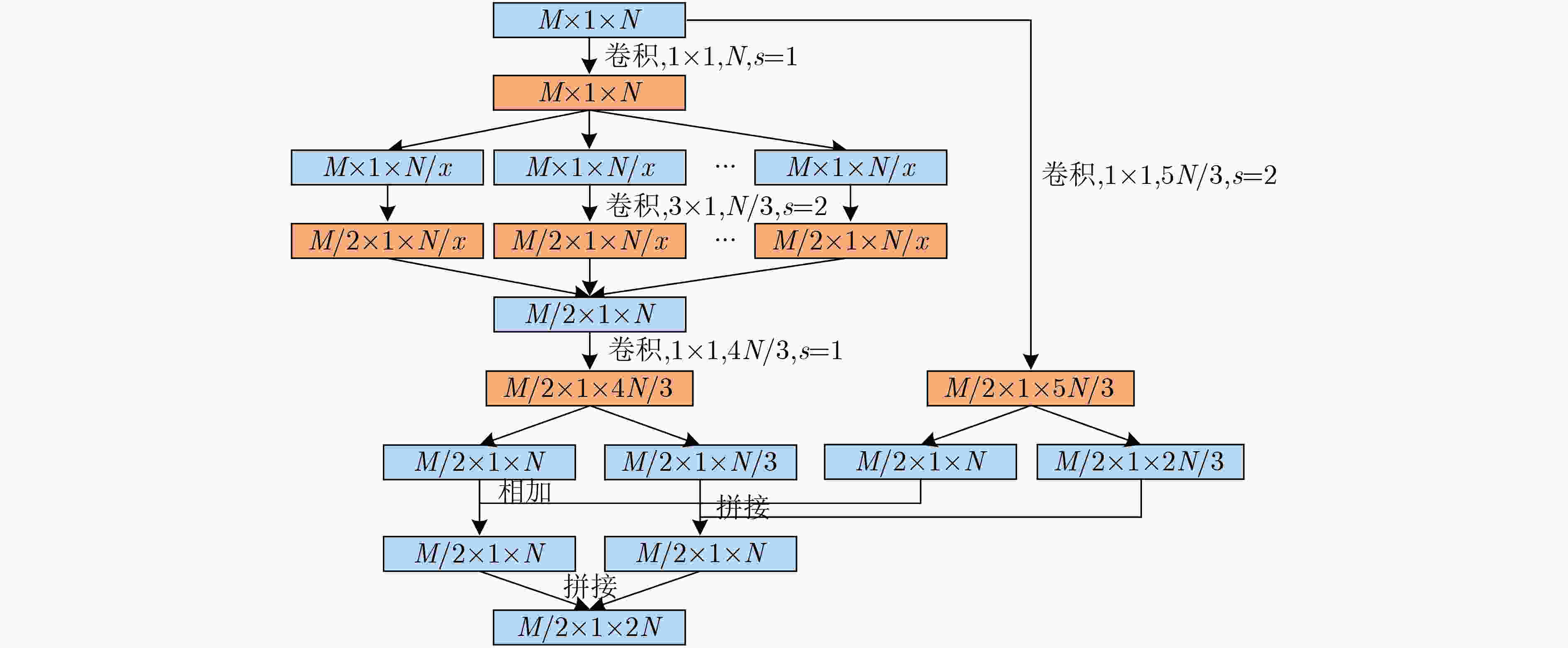 阶段 输出 结构 参数个数 初始卷积层 128×1×9 7×1, 9, s=2 99 左侧支路 右侧支路 卷积模块1 64×1×18 1×1, 9