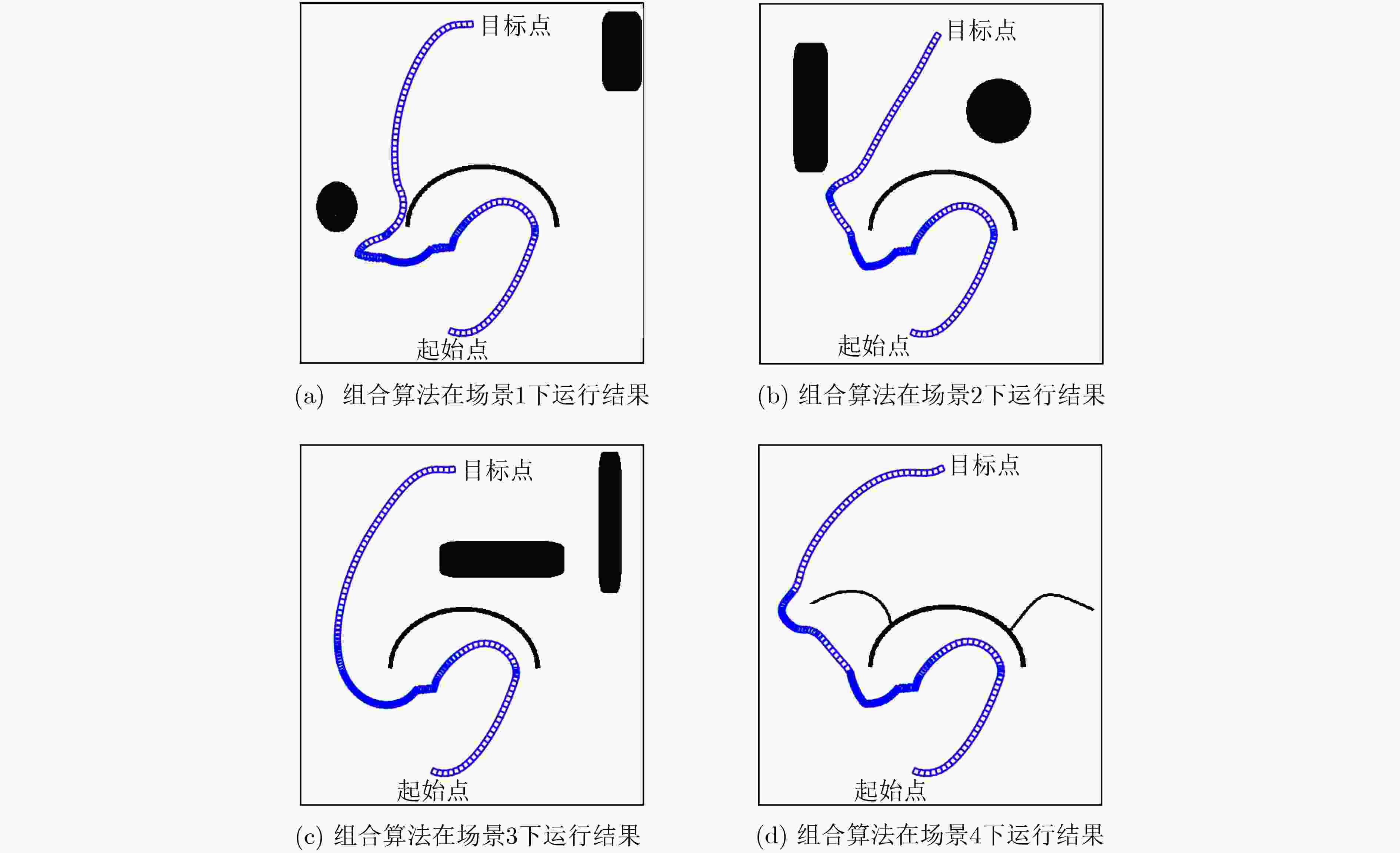 算法 时间(s) 路径长度(m) A*算法 22.40 1040.69 改进人工势场法[15] 无穷大 无穷大 本文组合算法 10.62 707.09 表 4 算法性能比较