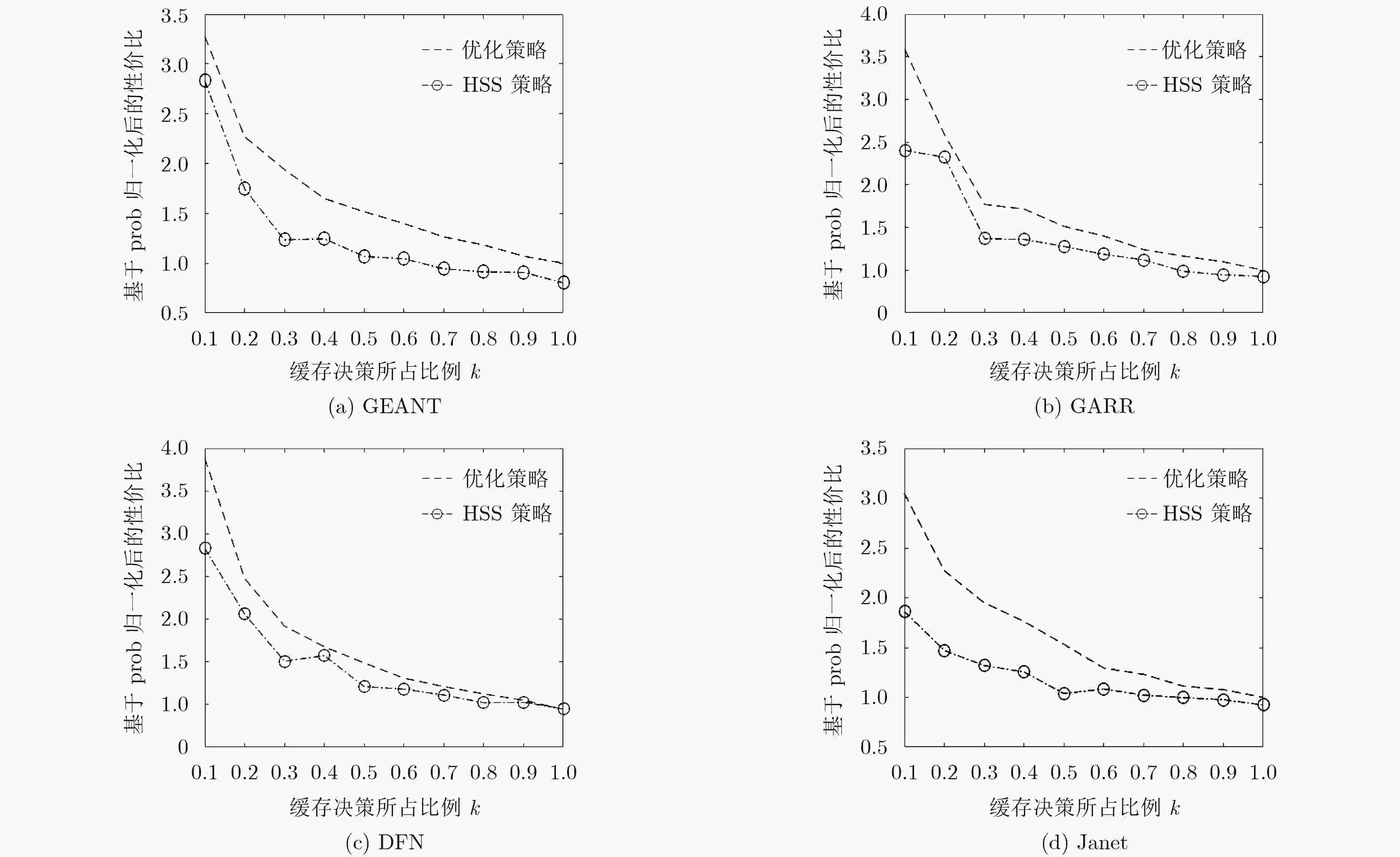 for all ${v_j} \in V$\; do 计算经过 ${v_j}$的路径数 ${m_j}$ 更新最大路径数M ${v_i}$收到内容 在[0, 1]区间生成均匀分布的随机数 ------------------------if (num< $k{m_i}/M$) then cache f 表 4 基于DC的HSS策略实现伪代码