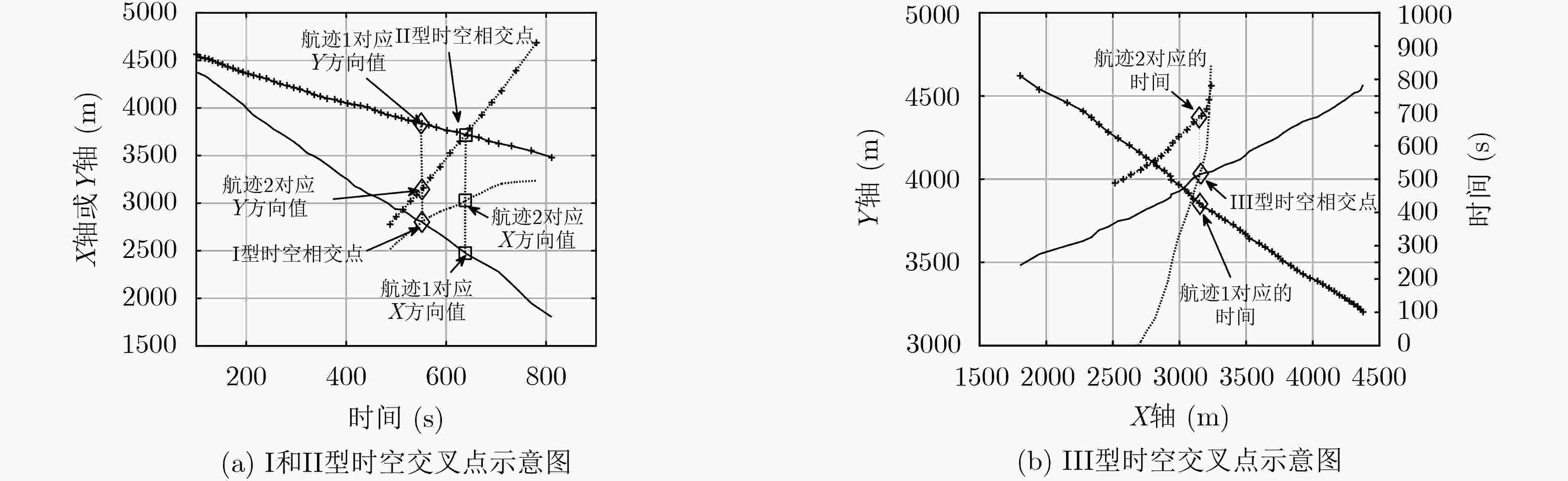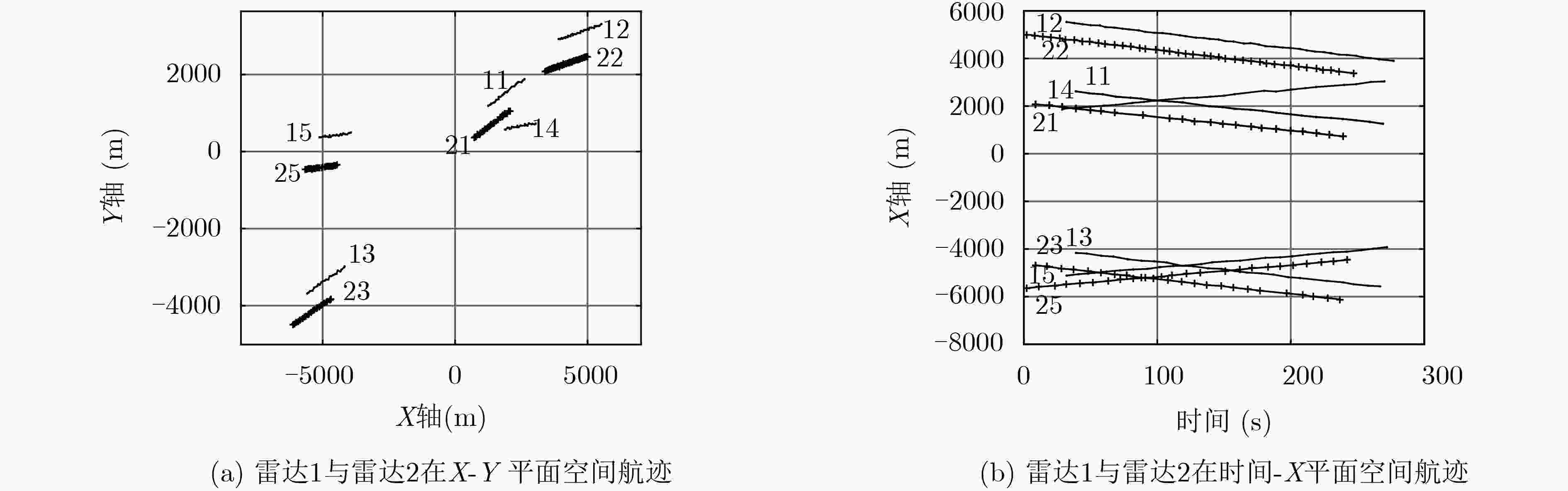 雷达1批号 15 13 11 12 雷达2批号 25 23 21 22 关联系数 0.657 0.657 0.648 0.503 时间误差估计(s) 30.31 30.31 25.42 29.57 空间误差估计(m) 525.22 819.61 525.22 819.61 571.18 813.87 468.00 825.56 表 2 测试数据1下交叉点算法关联结果