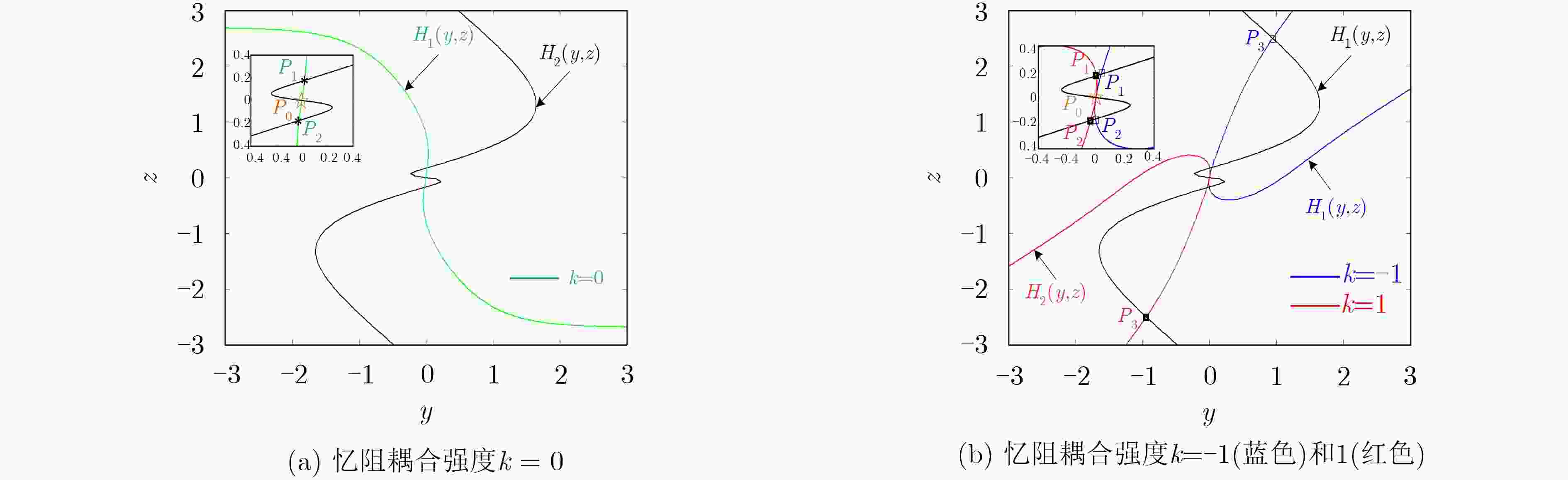 图 2 不同忆阻耦合强度时H1(y, z)和H2(y, z)函数曲线及交点平衡点