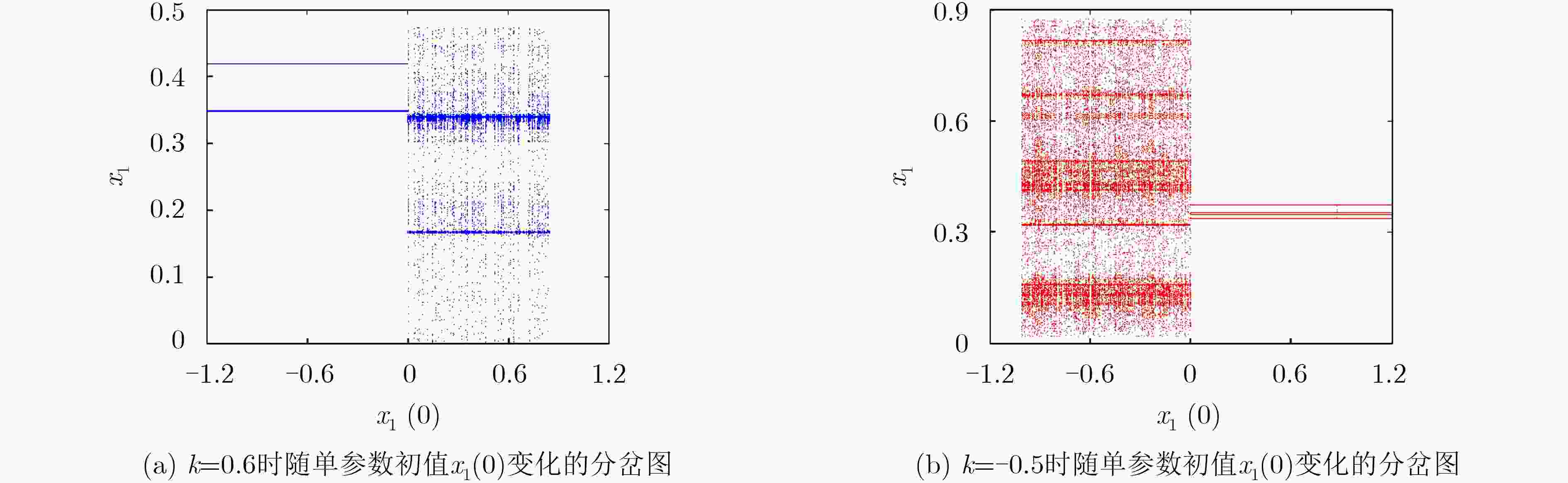 k 平衡点 特征值 稳定性 –1 P0: (0, 0, 0, 0) 1.6062, –0.9531±j2.3986, –1 不稳定指数1鞍焦 P1: (–0.0019, –0.1689, 3.3462, 0.1670) 0.0981±j2.0026, –0.8763, –0.9875 不稳定指数2鞍焦 P2: (0.0369, 0.1814, –3.5887, –0.1445) 0.5146±j2.0051, –0.9923, –1.0882 不稳定指数2鞍焦 P3: (0.9448, 2.5018, –19.7332, –1.5570) 3.4659, –0.9464, –1, –1.6894 不稳定鞍点 0 P0: (0, 0, 0, 0) 1.6062, –0.9531±j2.3986, –1 不稳定指数1鞍焦 P1: (0.0220, 0.1761, –3.4860, –0.1541) 0.3267±j2.0074, –0.9906, –1 不稳定指数2鞍焦 P2: (–0.0220, –0.1761, 3.4860, 0.1541) 0.3267±j2.0074, –0.9906, –1 不稳定指数2鞍焦 1 P0: (0, 0, 0, 0) 1.6062, –0.9531±j2.3986, –1 不稳定指数1鞍焦 P1: (–0.9448, –2.5018, 19.7332, 1.5570) 3.4659, –0.9464, –1, –1.6894 不稳定鞍点 P2: (–0.0369, –0.1814, 3.5887, 0.1445) 0.5146±j2.0051, –0.9923, –1.0882 不稳定指数2鞍焦 P3: (0.0019, 0.1689, –3.3462, –0.1670) 0.0981±j2.0026, –0.8763, –0.9875 不稳定指数2鞍焦 表 1 k=–1, 0和1时的平衡点及其特征值和稳定性