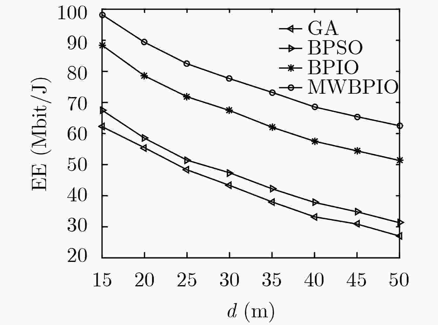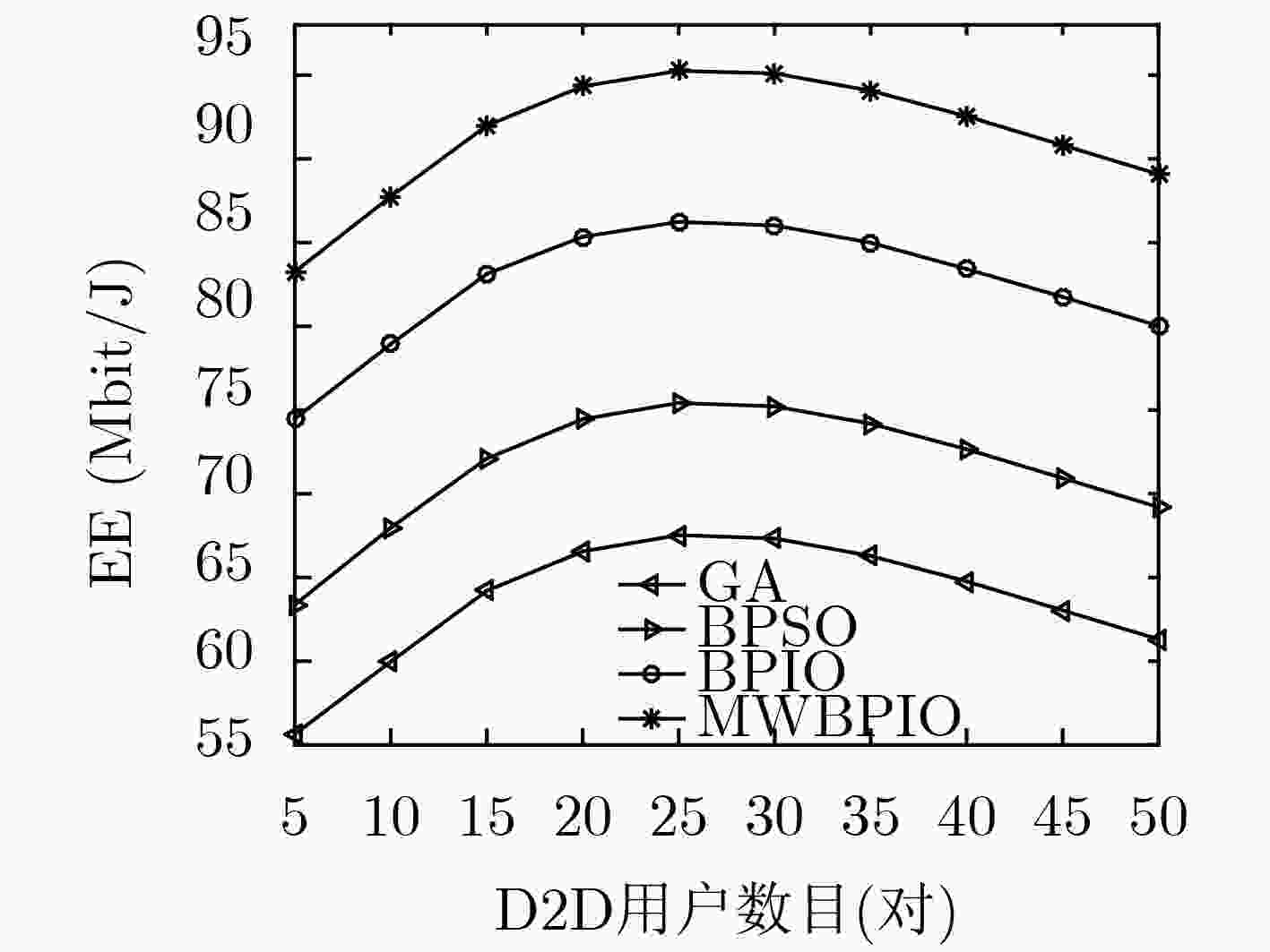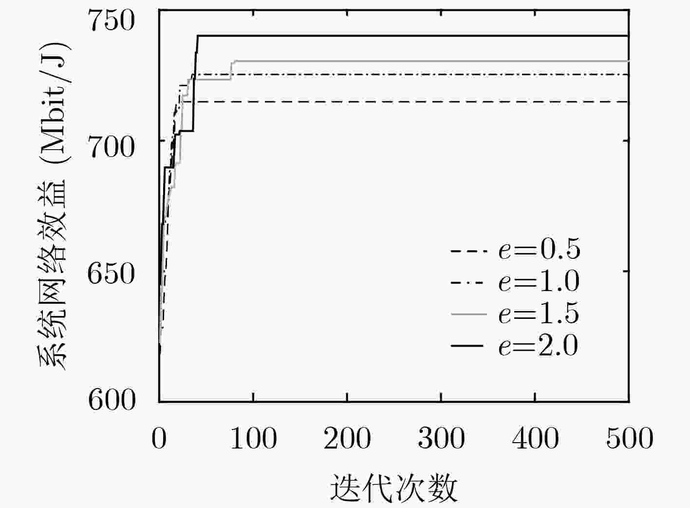 参数 数值 小区半径${R_{\rm cell} }$ 500 m 宏蜂窝用户数 50个 微蜂窝用户数 5个 D2D用户对数 25对 中继节点数 25个 蜂窝用户最大发射功率 24 dBm D2D用户最大发射功率 15 dBm 热噪声功率 –174 dBm/Hz 表 3 系统仿真参数
