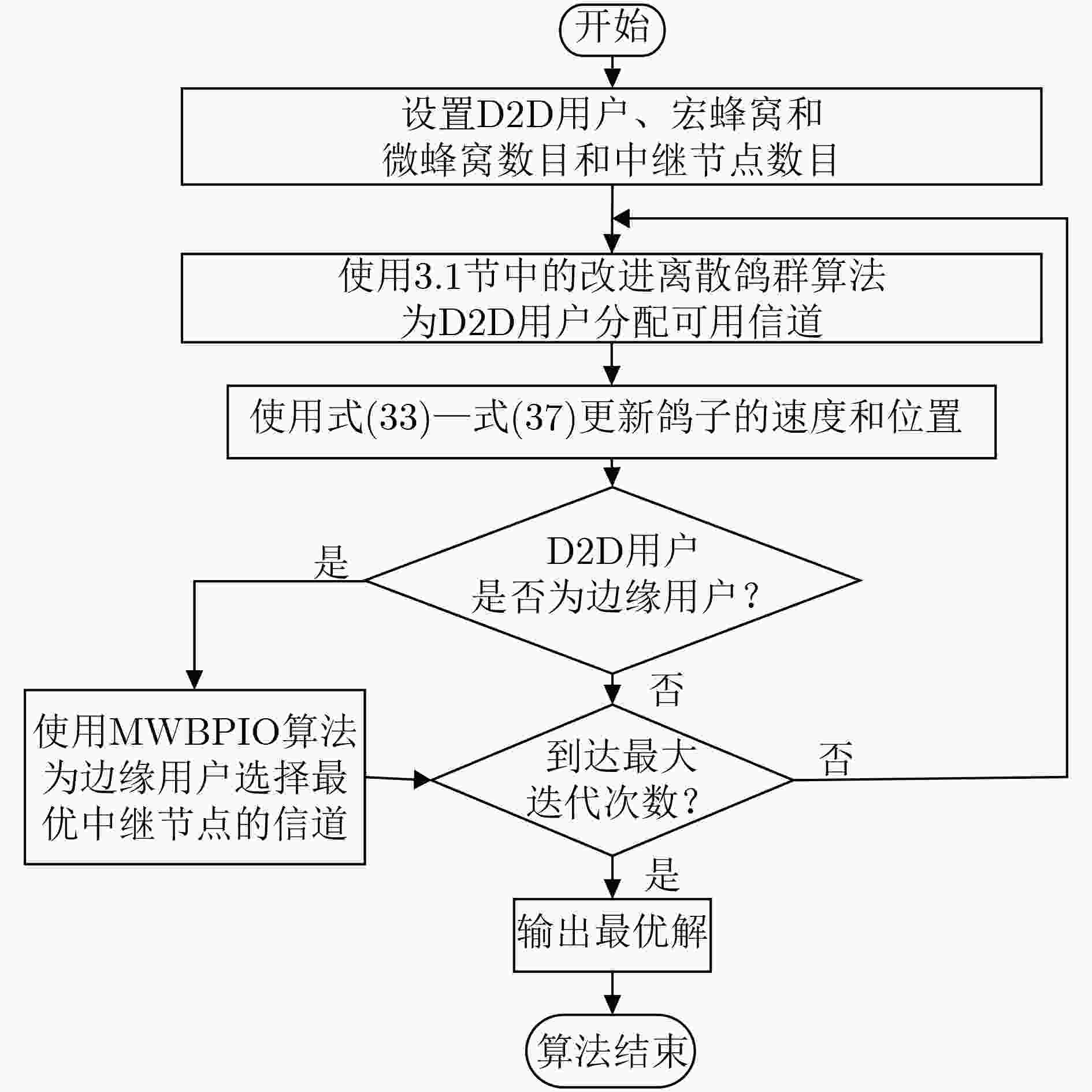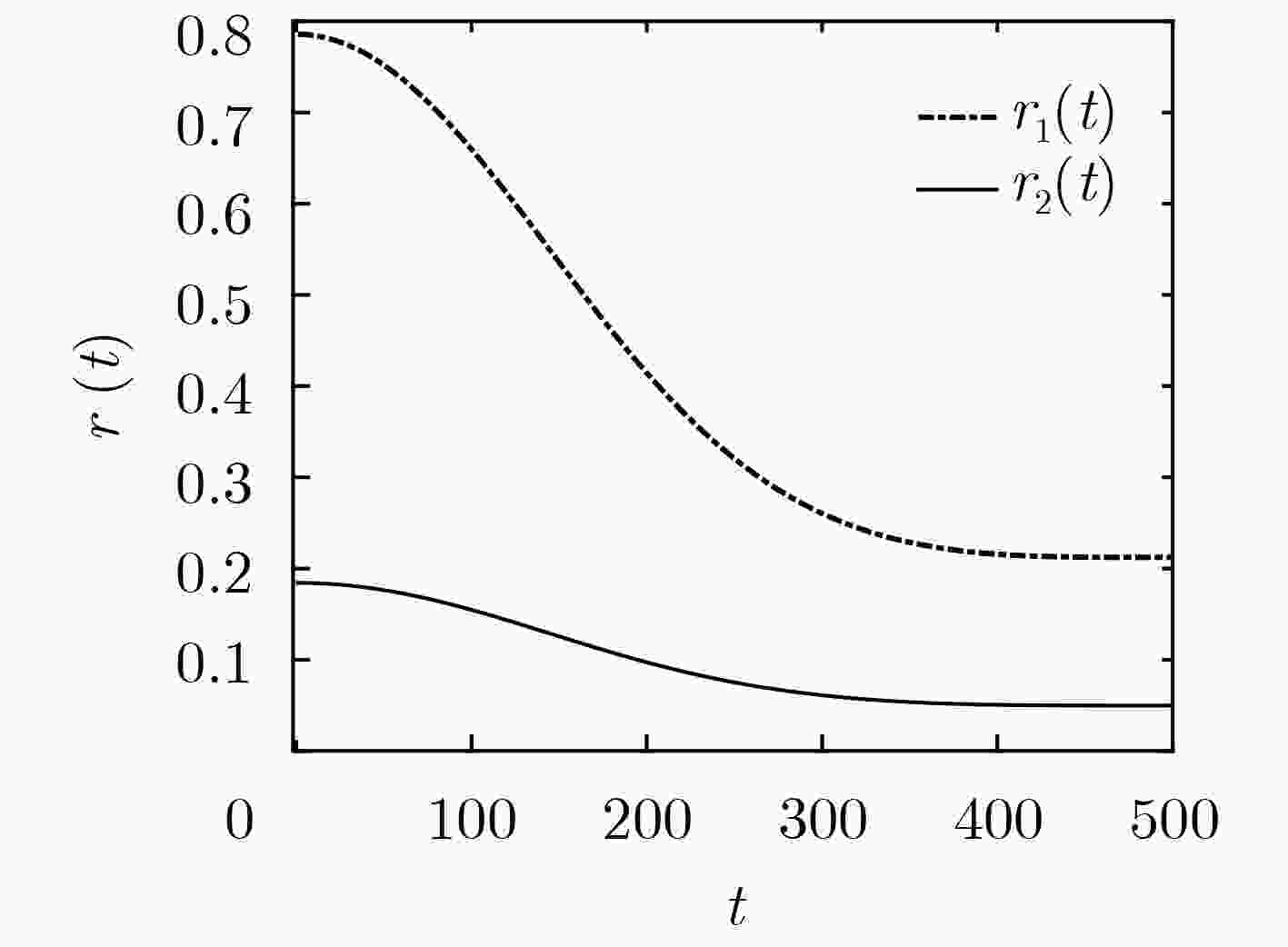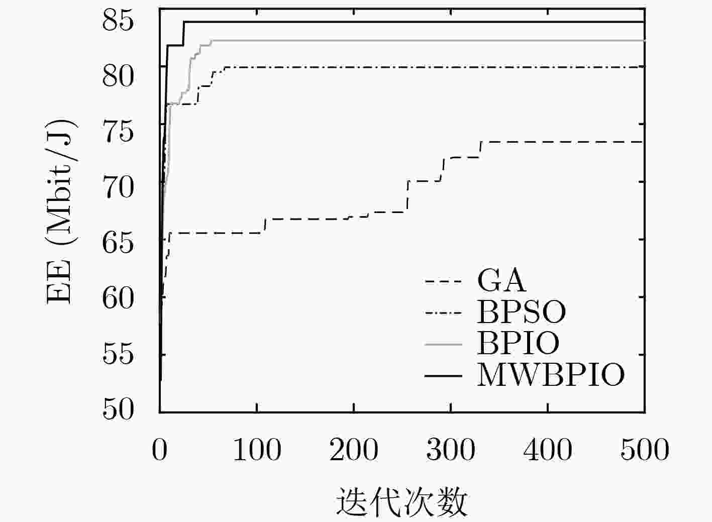 参数 数值 小区半径${R_{\rm cell} }$ 500 m 宏蜂窝用户数 50个 微蜂窝用户数 5个 D2D用户对数 25对 中继节点数 25个 蜂窝用户最大发射功率 24 dBm D2D用户最大发射功率 15 dBm 热噪声功率 –174 dBm/Hz 表 3 系统仿真参数