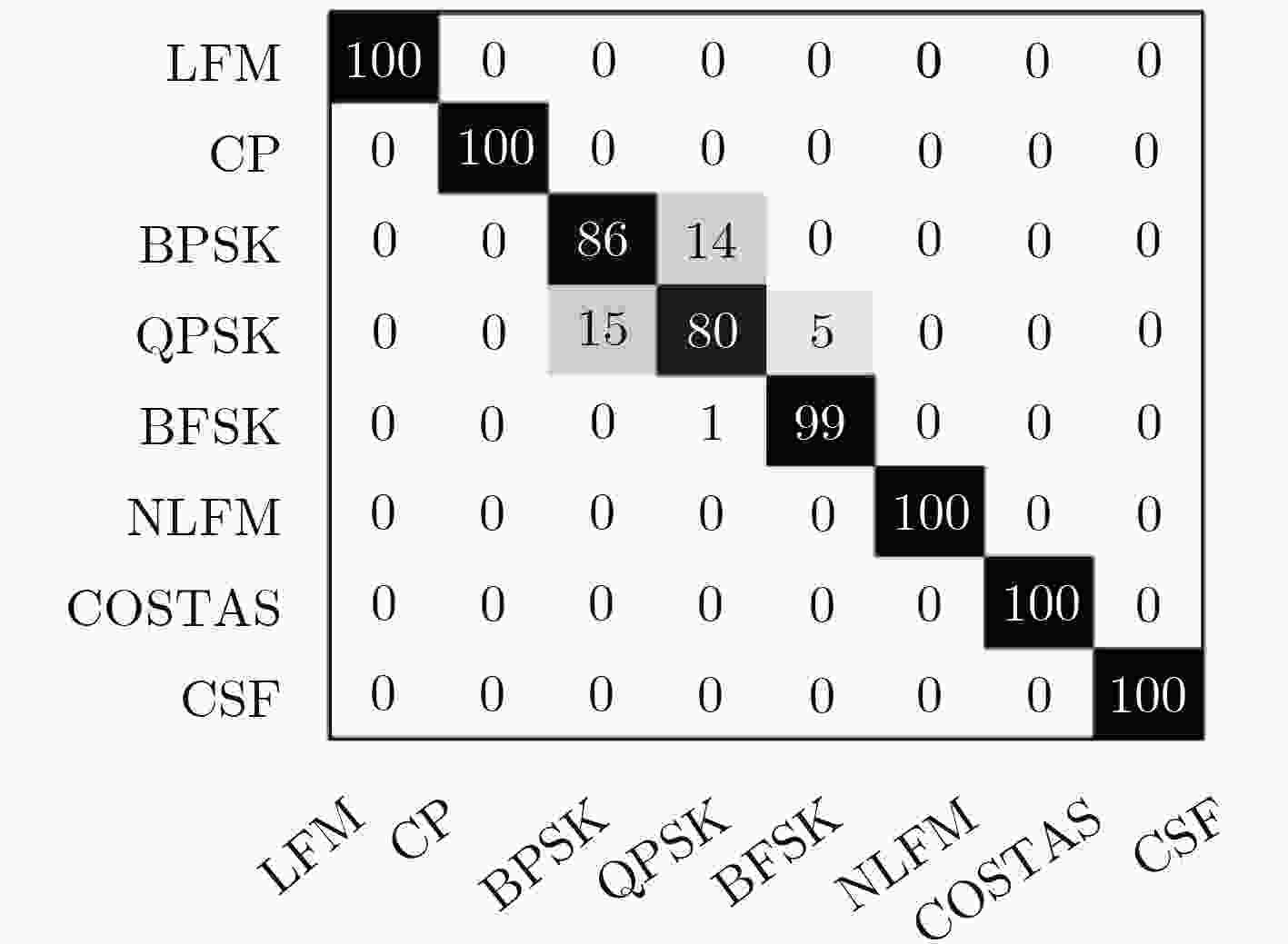 雷达信号 信噪比SNR (dB) 20 15 10 5 LFM 1.000 1.000 1.000 0.985 CP 1.000 1.000 1.000 1.000 BPSK 0.975 0.990 0.990 1.000 BFSK 0.930 0.910 0.800 0.700 NLFM 1.000 1.000 1.000 1.000 COSTAS 1.000 1.000 1.000 1.000 表 2 不同SNR下6种雷达信号的识别率