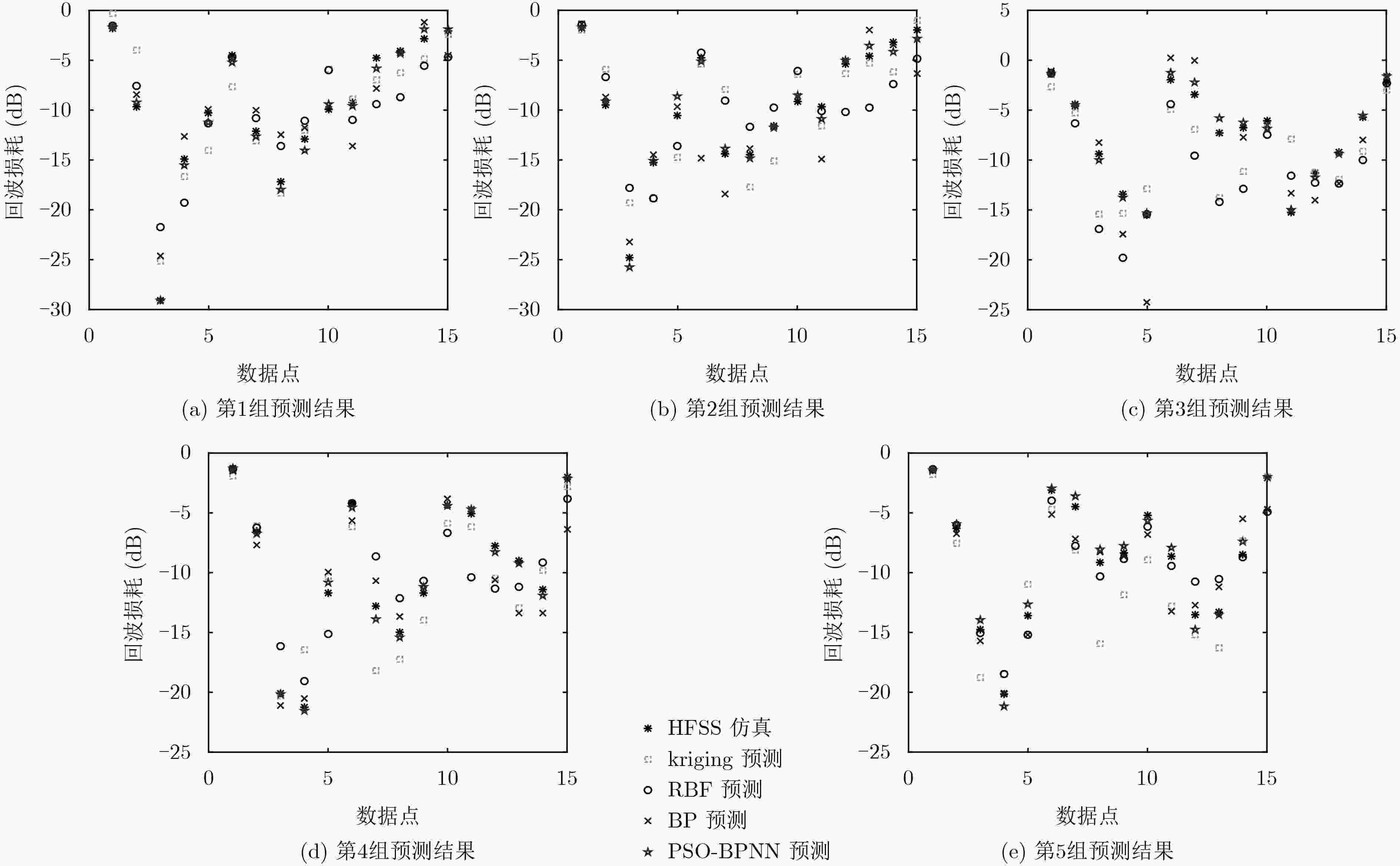 代理模型 ${{{x}}^{(1)}}$ ${{{x}}^{(2)}}$ ${{{x}}^{(3)}}$ ${{{x}}^{(4)}}$ ${{{x}}^{(5)}}$ ${{{x}}^{(6)}}$ HFSS –17.46 –15.75 –15.01 –14.69 –13.50 –12.53 BPNN –19.19 –17.90 –16.97 –16.04 –15.13 –14.36 PSO-BPNN –17.57 –16.18 –15.19 –14.19 –13.27 –12.35 误差率1(%) 9.91 13.65 13.06 9.19 12.07 14.60 误差率2(%) 0.63 2.73 1.20 3.40 1.70 1.44 表 5 代理模型与HFSS所获得的Pareto最优解集的目标值F1比较