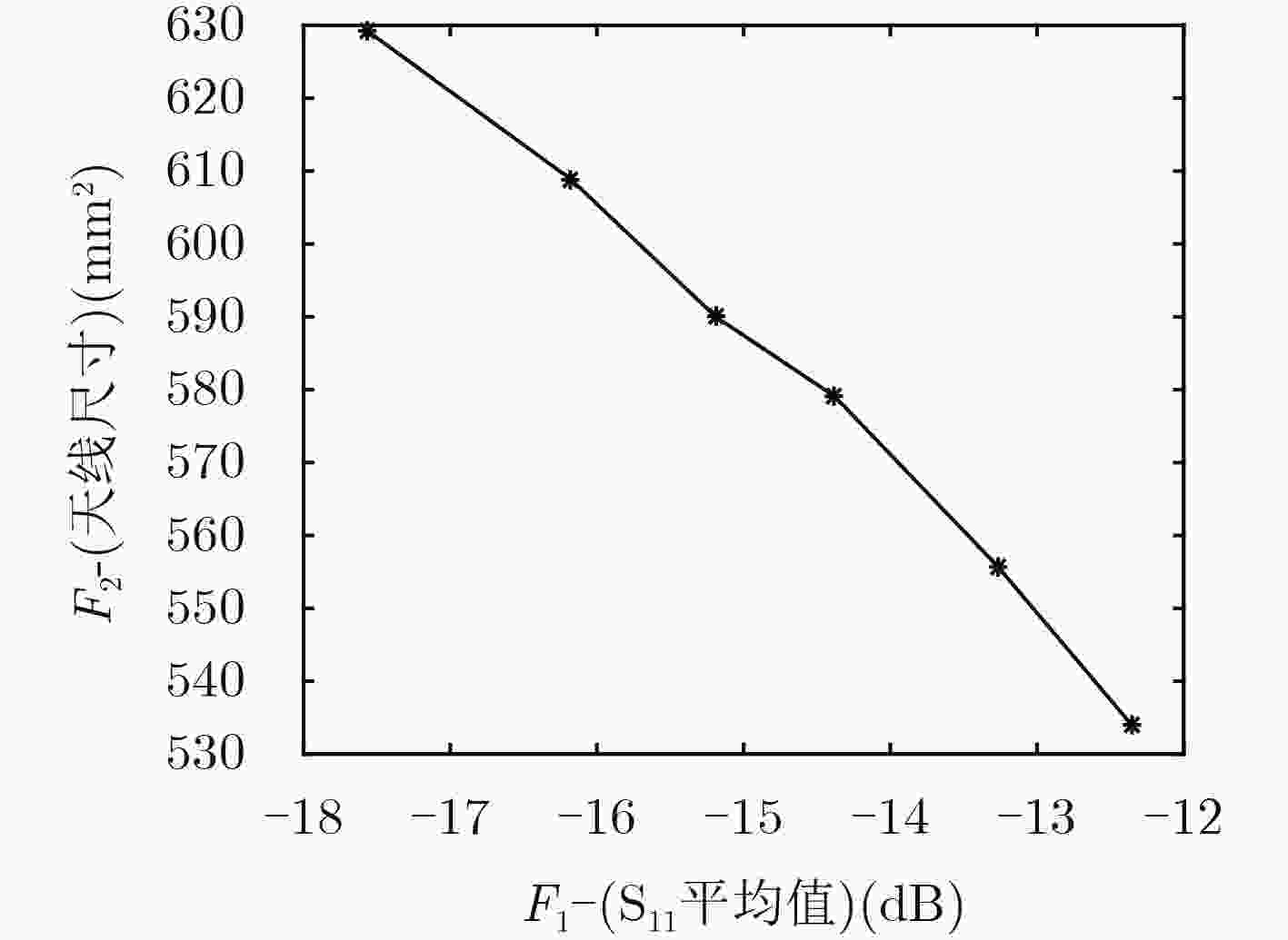 设计 ${{{x}}^{(1)}}$ ${{{x}}^{(2)}}$ ${{{x}}^{(3)}}$ ${{{x}}^{(4)}}$ ${{{x}}^{(5)}}$ ${{{x}}^{(6)}}$ F1(dB) –17.57 –16.18 –15.19 –14.19 –13.27 –12.35 F2(mm2) 629.28 608.94 590.00 580.14 555.84 533.90 d 8.7 8.8 8.4 8.6 8.3 9.4 l 30.4 30.6 29.5 29.3 28.8 28.1 l1 11.8 12.9 12.8 12.4 10.9 11.2 l2 9.0 8.8 9.0 9.2 8.8 9.7 l3 6.4 6.8 6.8 6.8 7.0 6.6 l4 11.5 11.5 11.1 12.3 10.9 11.0 w 20.7 19.9 20.0 19.8 19.3 19.0 w1 3.1 3.3 3.2 3.4 3.0 2.9 w2 3.0 3.1 3.8 3.4 3.2 3.4 w3 1.0 1.0 0.9 0.8 1.1 1.2 表 4 平面3频带天线的的Pareto最优设计