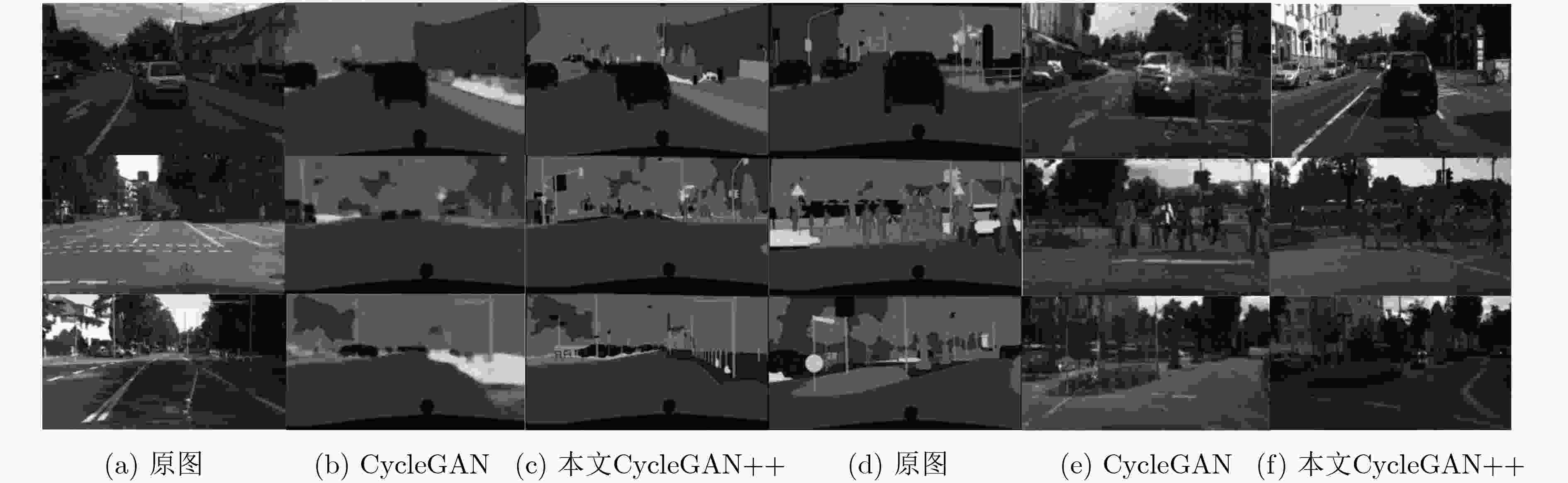 方法 每像素精度 每类精度 IoU分类 CycleGAN+ 0.60 0.21 0.16 本文CycleGAN++ 0.69 0.27 0.23 表 4 CycleGAN++与CycleGAN+的FCN得分结果对比