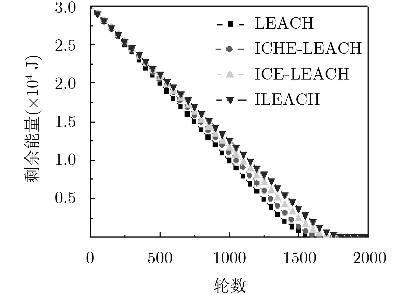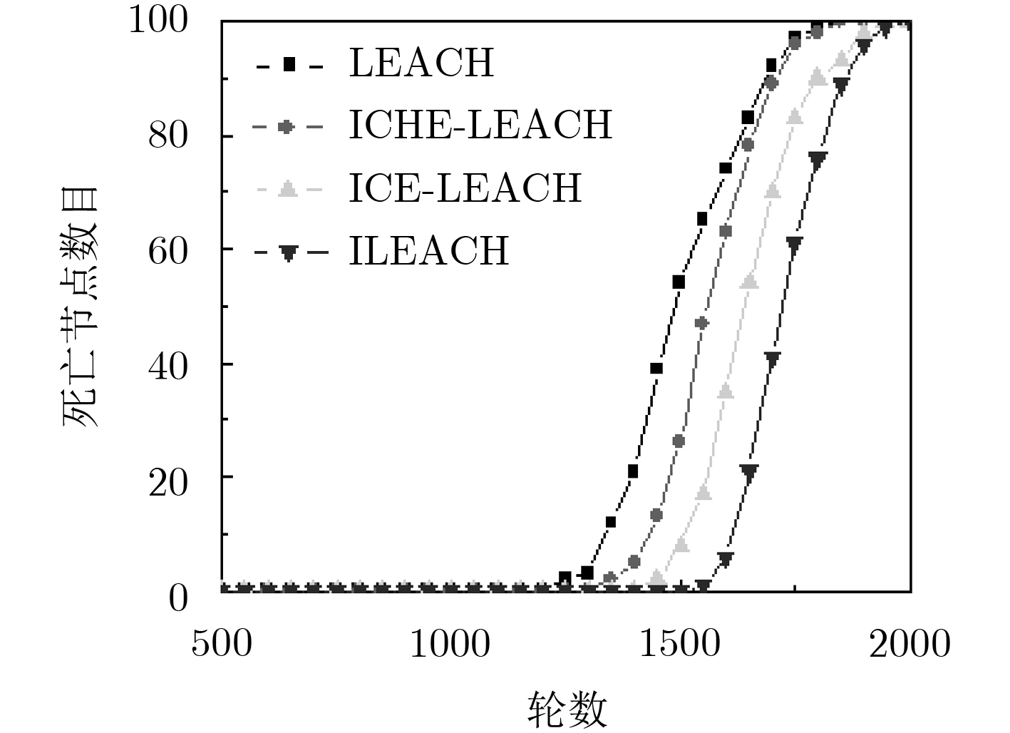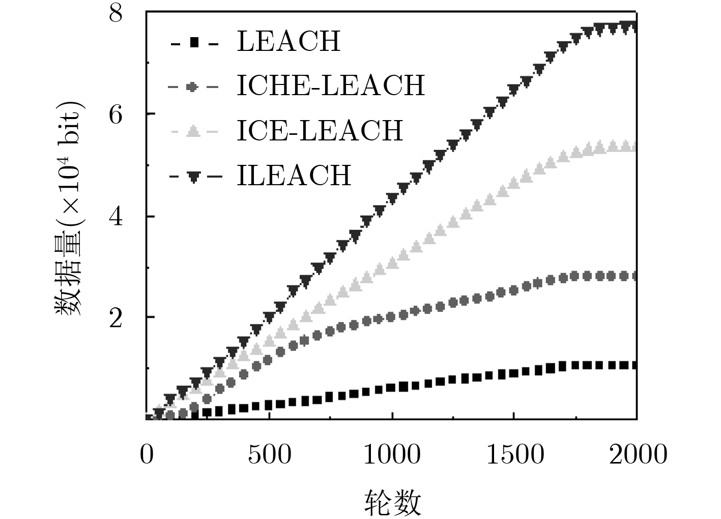 参数 取值 节点数 100 节点通信能量 300 J ${E_T}$ 8.0 μJ ${E_R}$ 8.0 μJ ${E_{{\rm{DA}}}}$ 0.8 μJ 波长$\lambda $ 266 nm 吸收系数${k_a}$ $0.740 \times {10^{ - 3}}$ m–1 散射系数${k_s}$ $0.515 \times {10^{ - 3}}$ m–1 接收孔径面积${A_r}$ 1.92 cm2 瑞利散射相函数参数$\gamma $ 0.017 斜发收${\beta _t}$, ${\beta _r}$ 60° 斜发收${\theta _t}$, ${\theta _r}$ 15° -