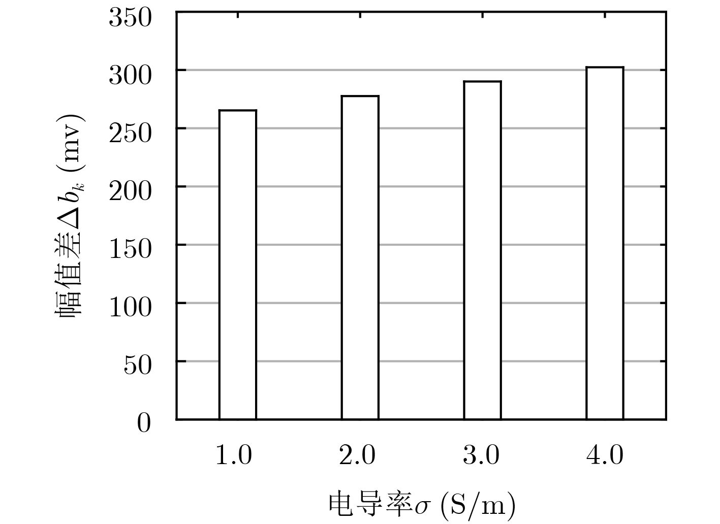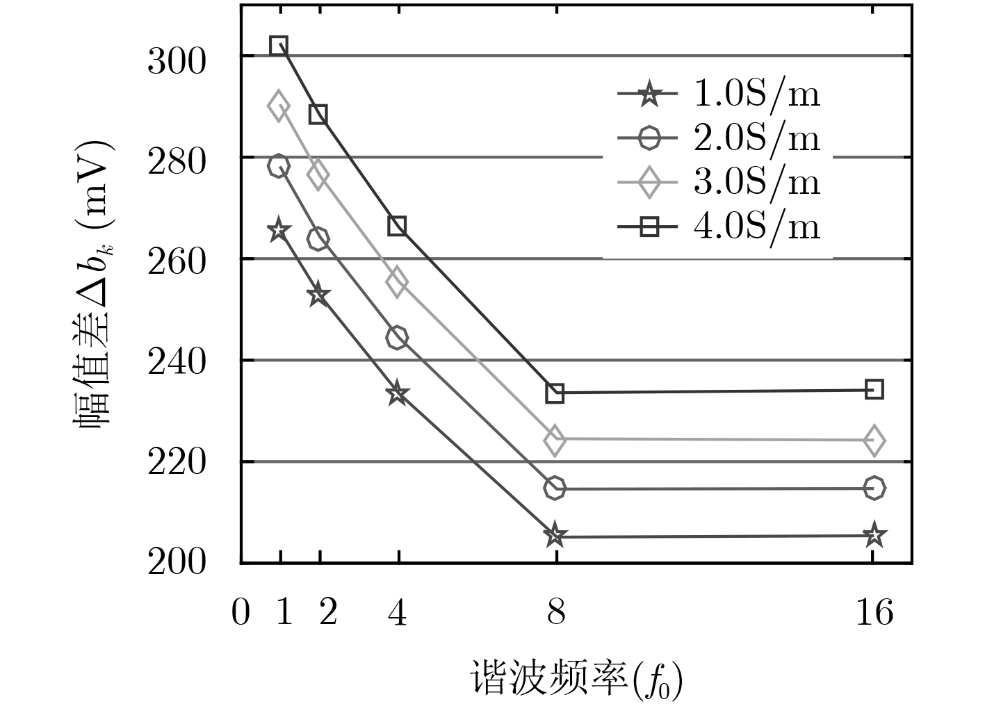 $\Delta {b_k}$(mV) f0 2f0 4f0 8f0 16f0 平均值 1.0 S/m 265.355 265.269 265.160 265.210 265.560 265.311 2.0 S/m 277.931 277.377 277.677 277.454 277.579 277.603 3.0 S/m 290.190 290.016 290.190 290.279 289.939 290.123 4.0 S/m 302.210 302.487 302.356 301.993 302.653 302.340 -
