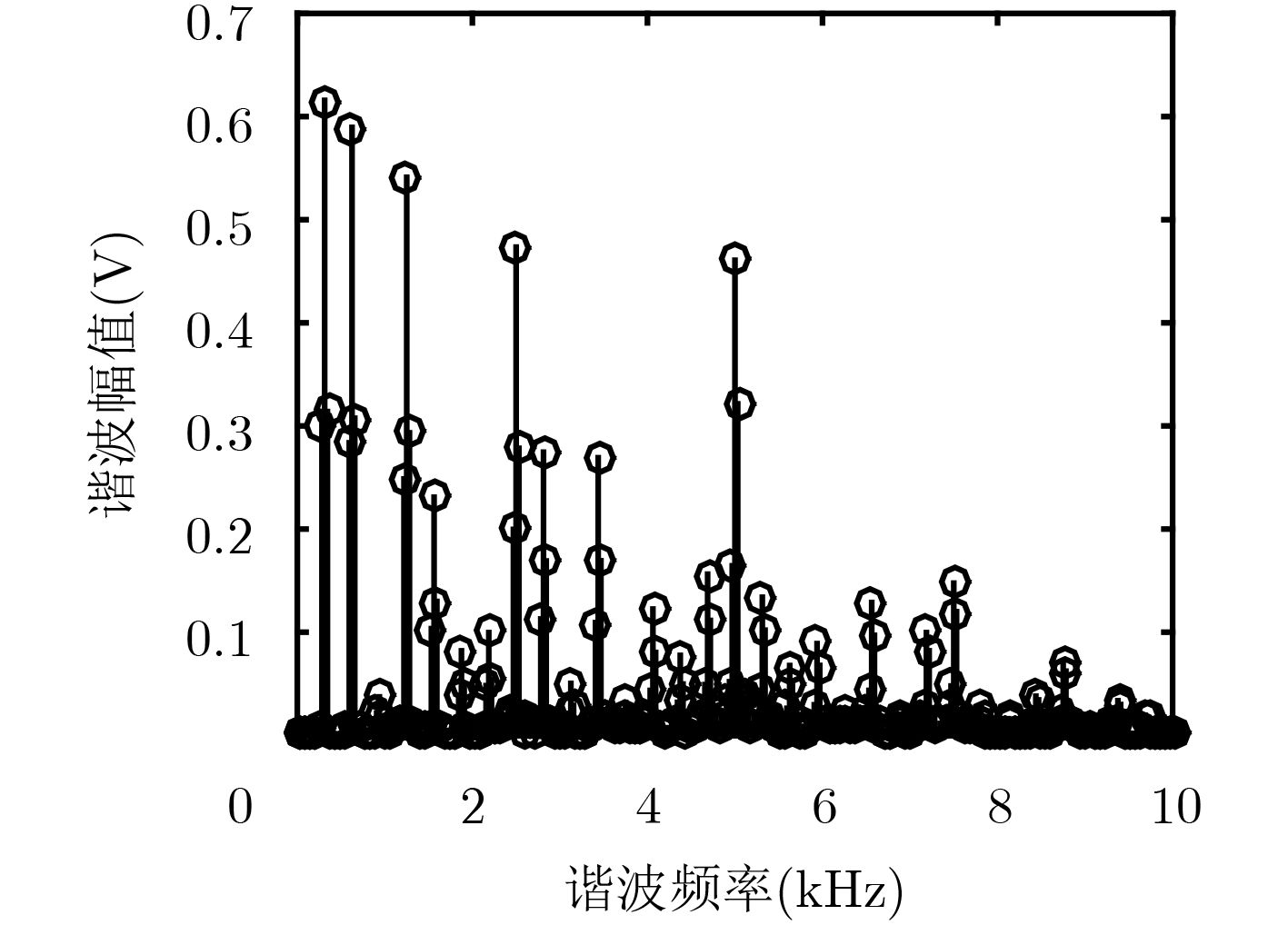 Hk f0 2f0 4f0 8f0 16f0 总和 bk(V) 0.6173 0.5882 0.5443 0.4775 0.4775 Pk(%) 19.05 17.30 14.76 11.40 11.40 73.91 表 2 合成5频率激励信号f(5, t)的主谐波Hk频率值