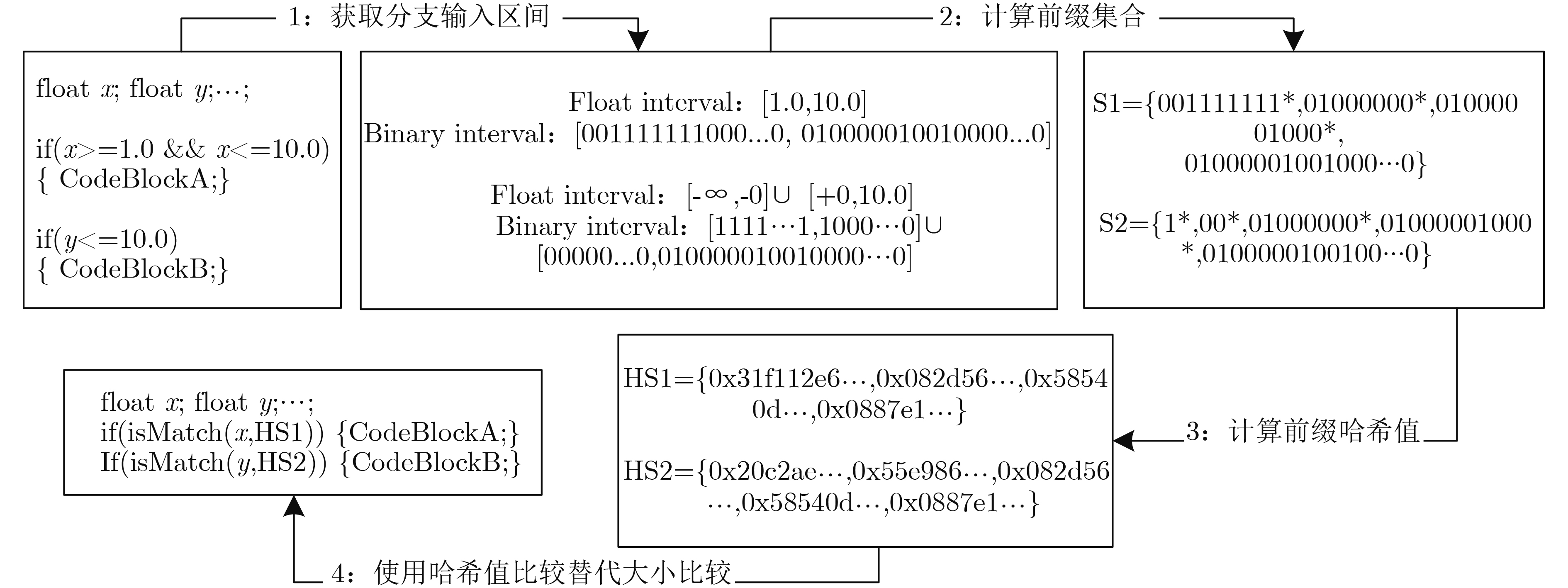 算法1 前缀算法 输入:a1a2···an//起始值a的二进制表示 b1b2···bn//结束值b的二进制表示 输出:PrefixSet//区间的前缀集合 PrefixSet Get_Prefix(a1a2···an,b1b2···bn) { for (int k=1; (k<=n) && (ak==bk); k++) { if (k==(n+1)) return { a1a2···an}; } if ((akak+1···an == 00···0) && (bkbk+1···bn == 11···1)) { if (k== 1) return {*}; else return {a1a2···ak-1}; } PrefixSet1 = Get_Prefix(ak+1ak+2···an, 11···1); PrefixSet2 = Get_Prefix(00···0, bk+1bk+2···bn); Return {a1a2···ak-10+PrefixSet1, a1a2···ak-11+PrefixSet2}; } 算法2:isMatch(x, HS) //判断输入为x时,分支条件的取值,算