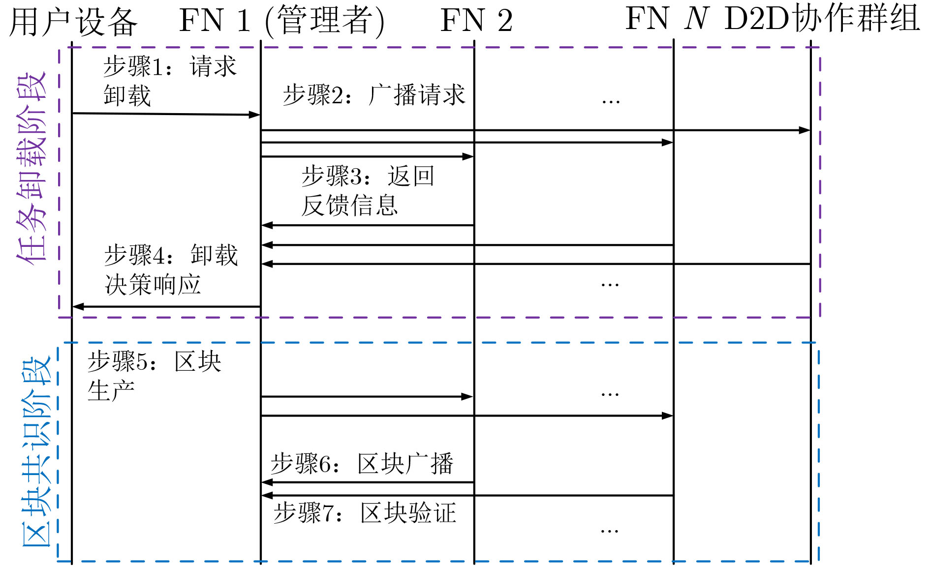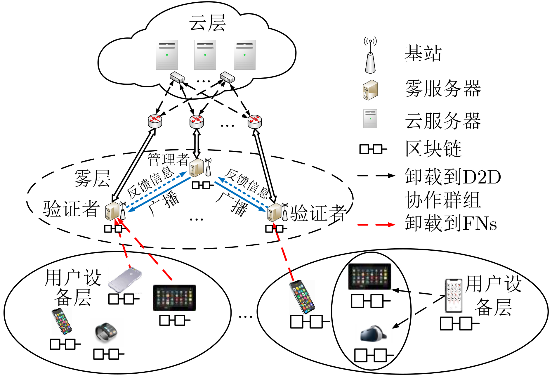 摘要: 当前物联网(IoT)应用的快速增长对用户设备的计算能力是一个巨大的挑战。雾计算(FC)网络可为用户设备提供近距离、快速的计算服务,为资源紧张,计算能力有限的用户设备提供了解决方案。该文提出一个基于区块链的雾网络模型,该模型中用户设备可以将计算密集型任务卸载到计算能力强的节点处理。为最小化任务处理时延和能耗,引入两种任务卸载模型,即设备到设备(D2D)协作群组任务卸载和雾节点(FNs)任务卸载。此外,针对雾计算网络任务卸载过程的数据安全问题,引入区块链技术构建去中心化分布式账本,防止恶意节点修改交易信息,实现数据安全可靠传输。为降低共识机制时延和能耗,提出了改进的基于投票的委托权益证明(DPoS)共识机制,得票数超过阈值的FNs组成验证集,验证集中的FN轮流作为管理者生成新区块。最后,以最小化网络成本为目标,联合优化任务卸载决策、传输速率分配和计算资源分配,提出任务卸载决策和资源分配(TODRA)算法进行求解,并通过仿真实验验证了该算法的有效性。Abstract: The current rapid growth of Internet of Things (IoT) applications is a huge challenge to the computing power of user equipment. The Fog Computing (FC) network can provide short-distance and fast computing services for user equipment, and provides a solution for user equipment with limited resources and limited computing capabilities. A blockchain-enabled fog network model is proposed, in which user equipment can offload computationally intensive tasks to nodes with strong computational capabilities. In order to minimize task processing delay and energy consumption, two task offloading models are introduced, namely Device-to-Device (D2D) collaboration group task offloading and Fog Nodes (FNs) task offloading. In addition, in view of the data security problem of the fog computing network task offloading process, blockchain technology is introduced to build a decentralized distributed ledger to prevent malicious nodes from modifying transaction information and achieve safe and reliable data transmission. In order to reduce the delay and energy consumption of the consensus mechanism, an improved voting-based Delegated-Proof-of-Stake (DPoS) consensus mechanism is proposed. FNs with votes exceeding the threshold form a verification set, and the FNs in the verification set take turns as the manager to generate new blocks. Finally, with the goal of minimizing the network cost, the task offloading decision, transmission rate allocation and computing resource allocation are jointly optimized, and the Task Offloading Decision and Resource Allocation (TODRA) algorithm is proposed to solve the problem. The effectiveness of the algorithm is verified by simulation experiments.