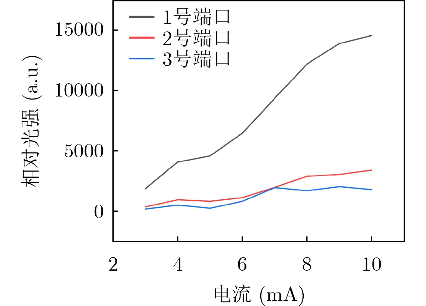 电流(mA) 3 4 5 6 7 8 9 10 1号端口光强(a.u.) 1854.1 4065.9 4580.9 6455.0 9363.0 12213.1 13929.8 14582.0 2号端口光强(a.u.) 330.1 922.0 797.9 1102.0 1964.0 2873.0 3021.0 3383.0 3号端口光强(a.u.) 147.1 481.0 215.1 795.9 1944.0 1684.0 2025.0 1776.0 -