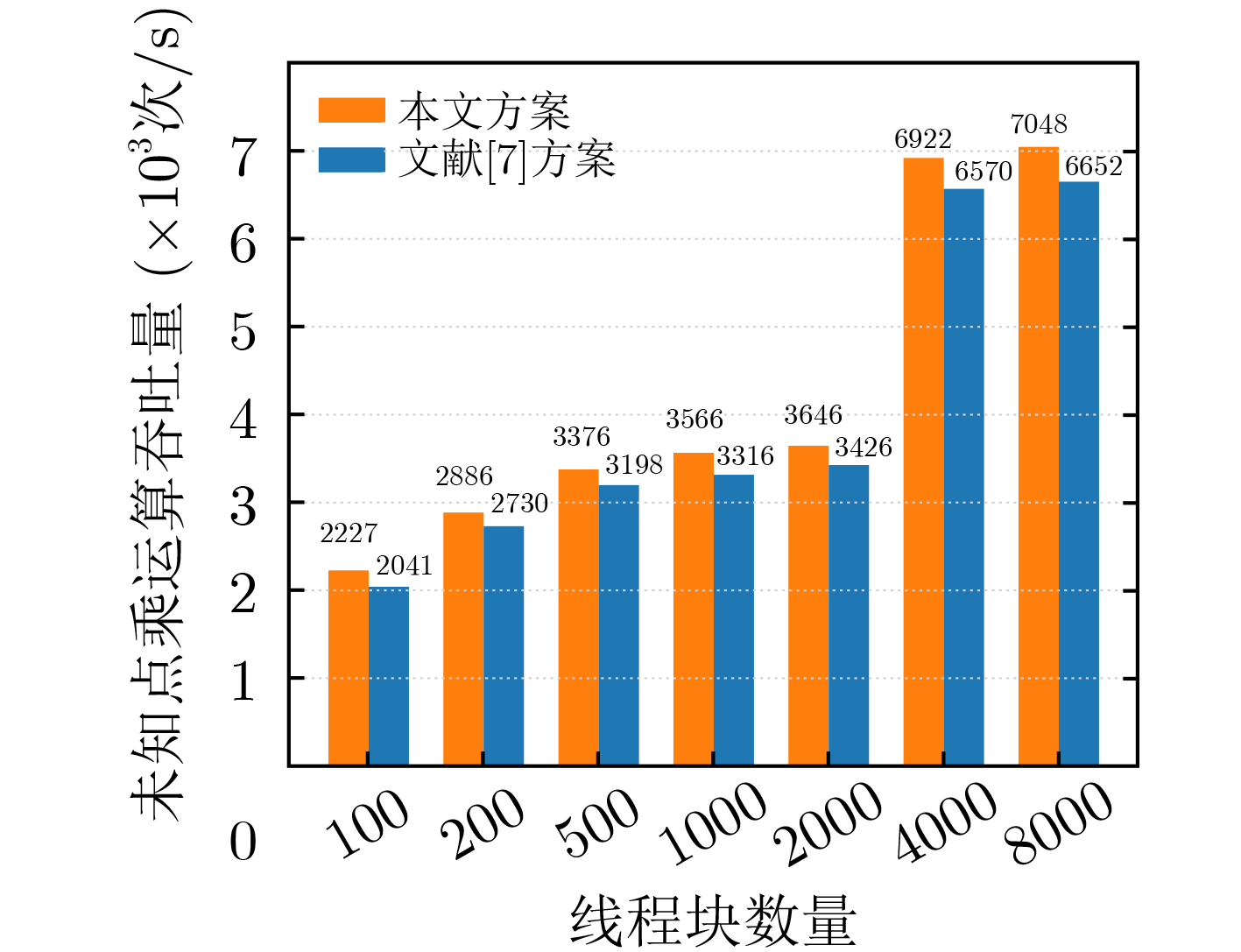 算法 总线程数 最优线程块大小 吞吐量(次/s) 时延(ms) 本文所提模逆优化算法 5120000 128 19400301 265 基于扩展欧几里得的模逆算法 51200 128 235921 873 本文所提未知点乘优化算法 102400 256 390154 263 文献[7]所提未知点乘算法 102400 256 367293 281 签名算法 1024000 128 6348632 162 验签算法 51200 128 345248 157 -