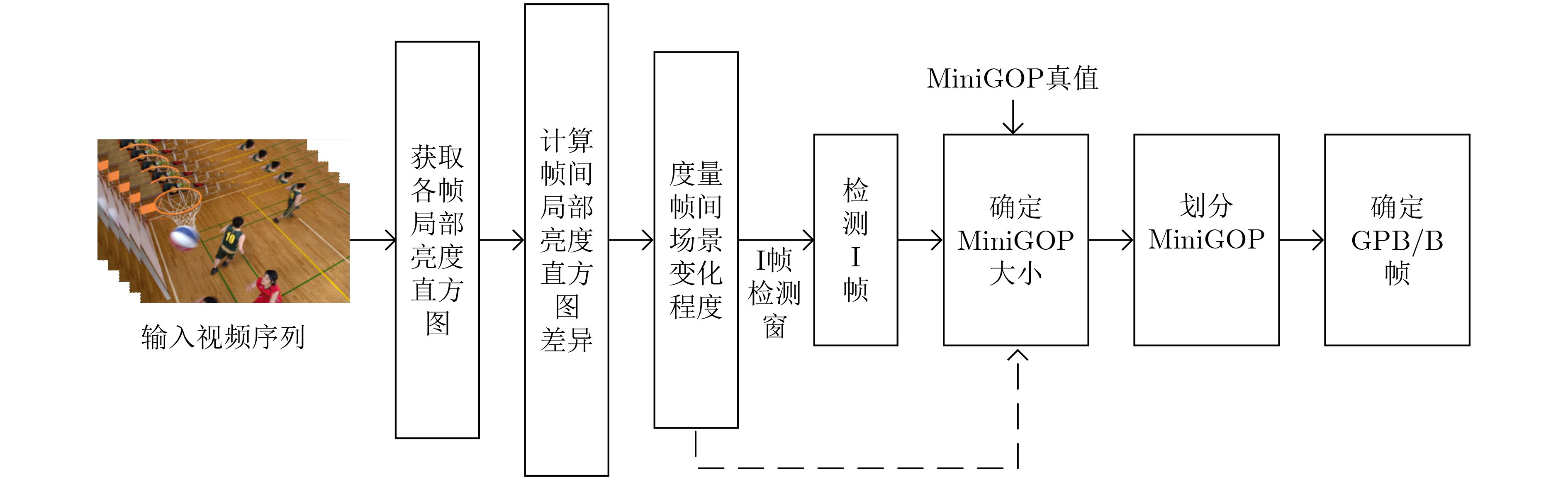 摘要: 视频帧类型决策是影响视频编码效率的关键因素之一。为提升x265视频编码器的编码性能,该文提出基于局部亮度直方图的自适应视频帧类型决策算法。首先,在64×64大小的编码树单元(CTU)级别上统计各帧局部亮度直方图,用帧间局部亮度直方图差异表征帧间场景变换程度;其次,引入帧内编码帧(I帧)检测窗,在检测窗内通过比较帧间场景变换程度自适应确定I帧;最后,根据帧间场景变换程度与迷你图像组(MiniGOP)大小之间的相关性确定MiniGOP大小,从而自适应确定普通P和B帧(GPB帧)及双向预测编码帧(B帧)。实验结果表明,与x265标准中的相关算法相比,所提算法能够有效降低x265的编码复杂度,可在减少近5%编码时间的前提下,实现视频I帧、GPB帧和B帧的高效自适应决策。Abstract: The video frame type decision is one of the key factors affecting the efficiency of video coding. This paper proposes an adaptive video frame type decision algorithm based on local luminance histogram to improve the x265 encoding performance. Firstly, the local luminance histograms of frames are calculated at the level of 64×64 Coding Tree Unit (CTU), and the difference of local luminance histogram between frames is used to represent the degree of scene variation between frames. Secondly, Intra-coded picture (I-frame) detection window is introduced. I-frame is determined by comparing the degree of scene variation between frames. Finally, the Mini Group Of Picture (MiniGOP) size is determined according to the correlation between the degree of scene variation and MiniGOP size, so as to determine adaptively Generalized P and B picture (GPB-frame) and Bidirectionally predicted picture (B-frame). Experimental results show that compared with the relevant algorithms in x265, the proposed algorithm can effectively reduce the coding complexity of x265, and decide I/GPB/B-frame efficiently and adaptively with nearly 5% less coding time.