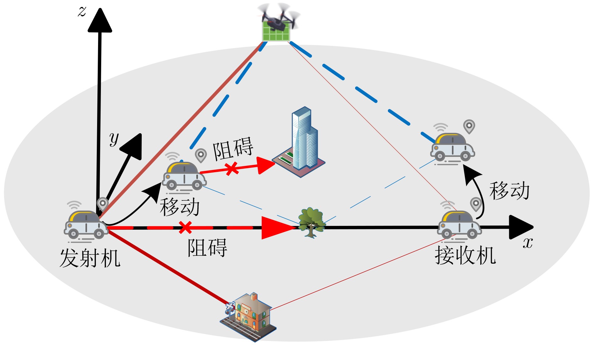 Objective The Internet of Vehicles (IoV) is a global innovation focus, enabling ubiquitous interconnection among vehicles, roads, and people, thereby reducing traffic congestion and improving traffic safety. Vehicle-to-Vehicle (V2V) communication represents one of the most prominent application scenarios in IoV. This study addresses the reduced efficiency of V2V communication caused by environmental obstacles such as buildings and trees. It proposes the deployment of Reconfigurable Intelligent Surfaces (RIS) on Unmanned Aerial Vehicles (UAVs), leveraging their high mobility and on-demand deployment capability to enhance V2V communication under 6G networks. The model improves communication link quality and stability by utilizing the reflective properties of aerial RIS to mitigate signal attenuation and interference. This research develops a geometry-based Three-Dimensional (3D) dynamic channel model that incorporates the effects of UAV rotation, trajectory movement, and attitude changes on channel characteristics, enabling adaptation to dynamic and non-stationary communication scenarios. The findings provide a theoretical foundation for designing and optimizing RIS-assisted wireless communication systems through statistical analyses in the temporal, spatial, and frequency domains. Methods RIS can regulate incident electromagnetic waves to optimize communication system performance and are regarded as a crucial innovation in Sixth Generation (6G) wireless communication technology. Deploying RIS on UAVs effectively addresses reduced information transmission efficiency caused by obstacles such as trees and buildings, leveraging UAVs’ flexible trajectories and on-demand deployment capabilities. This study proposes a geometry-based 3D dynamic channel model, considering the UAV’s trajectory, three degrees of rotational freedom (pitch, yaw, and roll angles), and attitude changes. Channel propagation components are divided into aerial RIS array components and Non-Line-of-Sight (NLoS) components. Each RIS unit is modeled as an independent reflector capable of altering the propagation path by adjusting its phase and amplitude. The model incorporates time-varying spatial phases and Doppler frequency shifts, capturing the characteristics of dynamic propagation environments. Mathematical expressions for the Complex Impulse Responses (CIRs) are derived, along with analytical formulas for spatial Cross-Correlation Functions (CCFs), temporal Auto-Correlation Functions (ACFs), Frequency Correlation Functions (FCFs), and channel capacity. Various V2V communication scenarios are simulated by adjusting the velocity, direction, and acceleration of transmitters, receivers, and UAVs. Numerical simulations validate the proposed model’s effectiveness by defining four UAV trajectories and various vehicle motion states. Additionally, the temporal, spatial, and frequency correlation characteristics under different motion states are investigated. Finally, the effects of RIS physical attributes, such as the number and size of units, and UAV altitude on channel capacity are analyzed, along with dynamic variations in the power delay profile. Results and Discussions Simulation results demonstrate that the proposed channel model accurately captures channel characteristics. Specifically, the model presents various UAV flight trajectories ( Fig. 5 ) and analyzes the temporal autocorrelation properties under different motion states of the transmitter and receiver (Fig. 6 ). It is observed that the temporal correlation exhibits significant non-stationarity across different motion states. However, the introduction of RIS significantly mitigates the decline in correlation. The model also compares the temporal autocorrelation properties corresponding to different UAV flight attitudes and altitudes (Fig. 7 ,Fig. 9 ). It is found that as the UAV’s initial altitude increases, multipath effects decrease, and the rate of decline in temporal autocorrelation function values gradually slows. Subsequently, the spatial cross-correlation of the proposed channel model is investigated for different propagation paths, revealing an increase in correlation with the Rician factor (Fig. 8 ). The frequency correlation function values are also examined under varying distances between the transmitter and receiver (Fig. 10 ), showing that while the correlation declines, it gradually stabilizes as the frequency interval increases. Finally, the impact of the RIS’s physical properties on channel capacity and the power delay profile is studied (Fig. 11 ,Fig. 12 ). It is observed that increasing the size and number of RIS array elements enhances channel capacity. Additionally, as delay increases, the power exhibits multiple smaller peaks before gradually decaying. These findings provide a valuable theoretical foundation for the future design and optimization of RIS-assisted wireless communication systems.Conclusions This paper presents a geometry-based 3D non-stationary channel model for V2V communications, innovatively incorporating aerial RIS implemented by UAVs equipped with RIS. The model accounts for the time-varying motion trajectories of ground vehicle terminals and UAVs, as well as the fading effects due to UAV attitude variations. Analytical expressions for spatiotemporal-frequency correlation functions and channel capacity are derived from the proposed model, ensuring the accuracy of channel transmission characteristics. By adjusting the model’s parameter configurations, it can accurately characterize the effects of various motion trajectories, dynamic states, UAV flight altitudes, and rotational angles on channel properties. These findings provide valuable insights for the design and performance analysis of RIS-assisted V2V communication systems. -