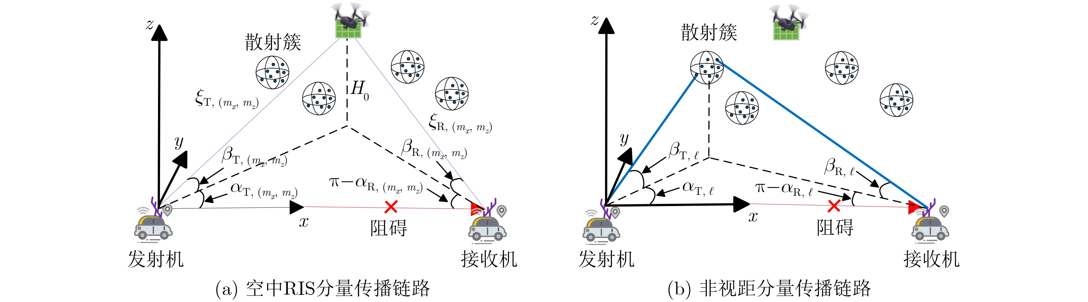 摘要: 可重构智能表面(RIS)能够调控入射电磁波以优化通信系统性能,是第6代(6G)无线通信技术的关键创新。将可重构智能表面部署于无人机(UAV)上,借助无人机的灵活运动轨迹和按需部署特性,可以有效解决因树木和建筑等障碍物遮挡所引起的信息传输效率下降的问题。针对空中可重构智能表面辅助的车对车(V2V)通信场景,该文提出了一种基于几何的3维信道模型,该模型综合考虑了无人机在3个自由度下的旋转和任意轨迹移动,以及无人姿态变化对于信道模型的影响,引入了时变空间相位。此外,还考虑了发射端、接收端和无人机的实时运动速度和方向,给出了复信道脉冲响应(CIRs)的表达式,并对空域互相关函数(CCFs)、时域自相关函数(ACFs)和信道容量等关键信道统计特性进行了详细分析。仿真结果表明,所提信道模型能够准确捕获信道特性,为未来可重构智能面辅助无线通信的系统设计和优化提供了有价值的理论参考。Abstract: