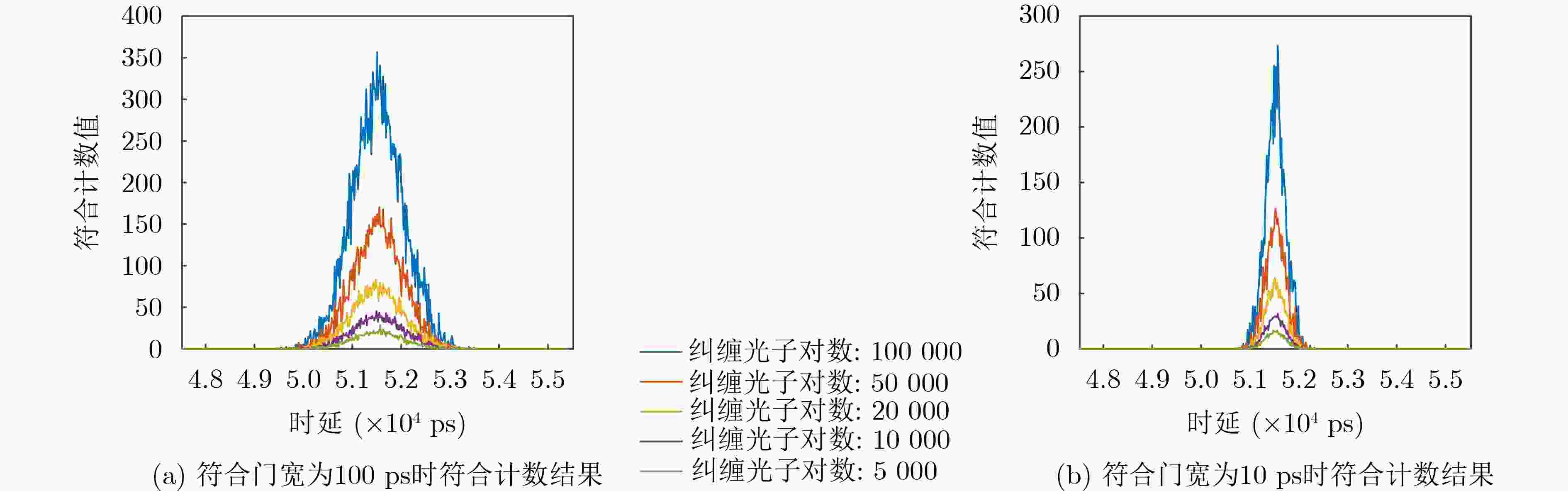 名称 取值 激光器功率(${\text{mw}}$) $40$ 非线性晶体尺寸(${\text{m}}{{\text{m}}^3}$) $1 \times 2 \times 20$ 温度控制器精度($^\circ {\text{C}}$) $0.01$ 同步与符合模块时间测量范围(${\text{ms}}$) $ \ge 1$ 单光子探测器死时间(${\text{ns}}$) $ \le 20$ 单光子探测器暗计数($ {\text{Hz}} $) $ \lt 500 $ 单光子探测器饱和计数(${\text{MHz}}$) $35$ 单光子探测器探测效率 $ \gt 60\% $ -