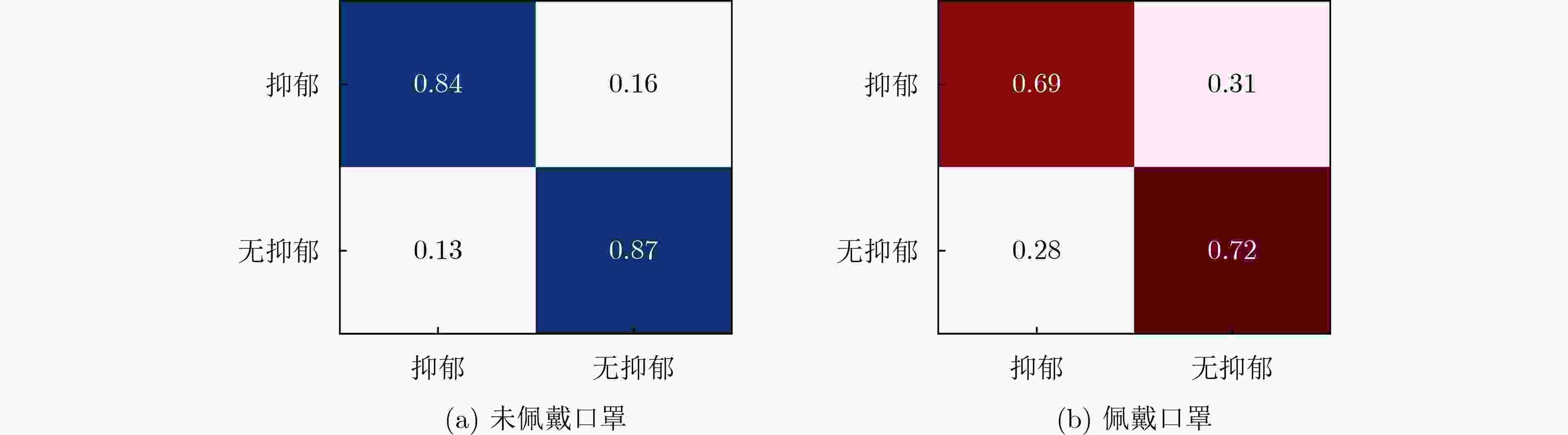 抑郁程度 不戴口罩样本数 戴口罩样本数 视频总时长(min) 轻度抑郁 5 49 366 中度抑郁 7 46 269 重度抑郁 7 30 346 表 2 抑郁症状自评问卷