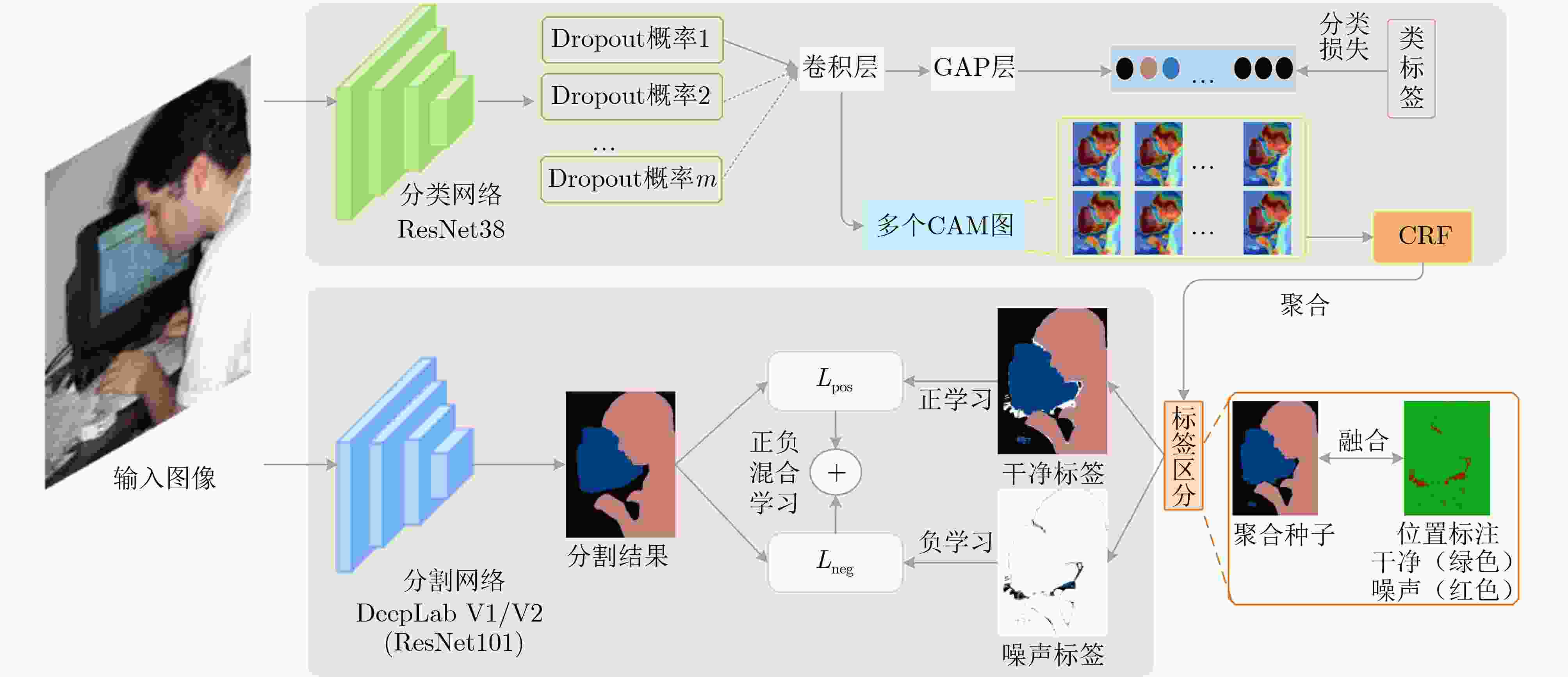 Objective The rapid development of deep learning techniques, particularly Convolutional Neural Networks (CNN), has led to notable advances in semantic segmentation, enabling applications in medical imaging, autonomous driving, and remote sensing. However, conventional semantic segmentation tasks typically rely on large numbers of pixel-level annotated images, which is both time-consuming and expensive. To address this limitation, Weakly Supervised Semantic Segmentation (WSSS) using image-level labels has emerged as a promising alternative. This approach aims to reduce annotation costs while maintaining or enhancing segmentation performance, thus supporting broader adoption of semantic segmentation techniques. Most existing methods focus on optimizing Class Activation Mapping (CAM) to generate high-quality seed regions, with further refinement through post-processing. However, the resulting seed labels often contain varying degrees of noise. To mitigate the effect of noisy labels on the segmentation network and to efficiently extract accurate information by leveraging multiple complementary seed sources, this study proposes a weakly supervised semantic segmentation method based on multi-seed information aggregation and positive-negative hybrid learning. The proposed approach improves segmentation performance by integrating complementary information from different seeds while reducing noise interference. Methods Building on the idea that combining multiple seeds can effectively extract accurate information, this study proposes a weakly supervised image semantic segmentation method based on multi-seed information aggregation and positive-negative hybrid learning. The approach employs a generalized classification network to generate diverse seed regions by varying the input image scale and modifying the Dropout layer to randomly deactivate neurons with different probabilities. This process enables the extraction of complementary information from multiple sources. Subsequently, a semantic segmentation network is trained using a hybrid positive-negative learning strategy based on the category labels assigned to each pixel across these seeds. Clean labels, identified with high confidence, guide the segmentation network through a positive learning process, where the model learns that “the input image belongs to its assigned labels.” Conversely, noisy labels are addressed using two complementary strategies. Labels determined as incorrect are trained under the principle that “the input image does not belong to its assigned labels,” representing a form of positive learning for error suppression. Additionally, an indirect negative learning strategy is applied, whereby the network learns that “the input image does not belong to its complementary labels,”further mitigating the influence of noisy labels. To reduce the adverse effects of noisy labels, particularly the tendency of conventional cross-entropy loss to assign higher prediction confidence to such labels, a prediction constraint loss is introduced. This loss function enhances the model’s predictive accuracy for reliable labels while reducing overfitting to incorrect labels. The overall framework effectively suppresses noise interference and improves the segmentation network’s performance. Results and Discussions The proposed weakly supervised image semantic segmentation method based on multi-seed information aggregation and positive-negative hybrid learning generates diverse seeds by randomly varying the Dropout probability and input image scale, with Conditional Random Field (CRF) optimization applied to further refine seed quality. To limit noise introduction while maintaining the effectiveness of positive-negative hybrid learning, six complementary seeds are selected ( Table 5 ). The integration of multi-source information from these seeds enhances segmentation performance, as demonstrated in (Table 7 ) . Pixel labels within these seeds are classified as clean or noisy based on a defined confidence threshold. The segmentation network is subsequently trained using a positive-negative hybrid learning strategy, which suppresses the influence of noisy labels and improves segmentation accuracy. Experimental results confirm that positive-negative hybrid learning effectively reduces label noise and enhances segmentation performance (Table 8 ). The proposed method was validated on the PASCAL VOC 2012 and MS COCO 2014 datasets. With a CNN-based segmentation network, the mean Intersection over Union (mIoU) reached 72.5% and 40.8%, respectively. When using a Transformer-based segmentation network, the mIoU improved to 76.8% and 46.7% (Table 1 ,Table 3 ). These results demonstrate that the proposed method effectively enhances segmentation accuracy while controlling the influence of noisy labels.Conclusions This study addresses the challenge of inaccurate seed labels in WSSS based on image-level annotations by proposing a multi-seed label differentiation strategy that leverages complementary information to improve seed quality. In addition, a positive-negative hybrid learning approach is introduced to enhance segmentation performance and mitigate the influence of erroneous pixel labels on the segmentation model. The proposed method achieves competitive results on the PASCAL VOC 2012 and MS COCO 2014 datasets. Specifically, the mIoU reaches 72.5% and 40.8%, respectively, using a CNN-based segmentation network. With a Transformer-based segmentation network, the mIoU further improves to 76.8% and 46.7%. These results demonstrate the effectiveness of the proposed method in improving segmentation accuracy while reducing noise interference. Although the method does not yet achieve ideal label precision, label differentiation combined with positive-negative hybrid learning effectively suppresses misinformation propagation and outperforms approaches based on single-seed generation and positive learning alone. -