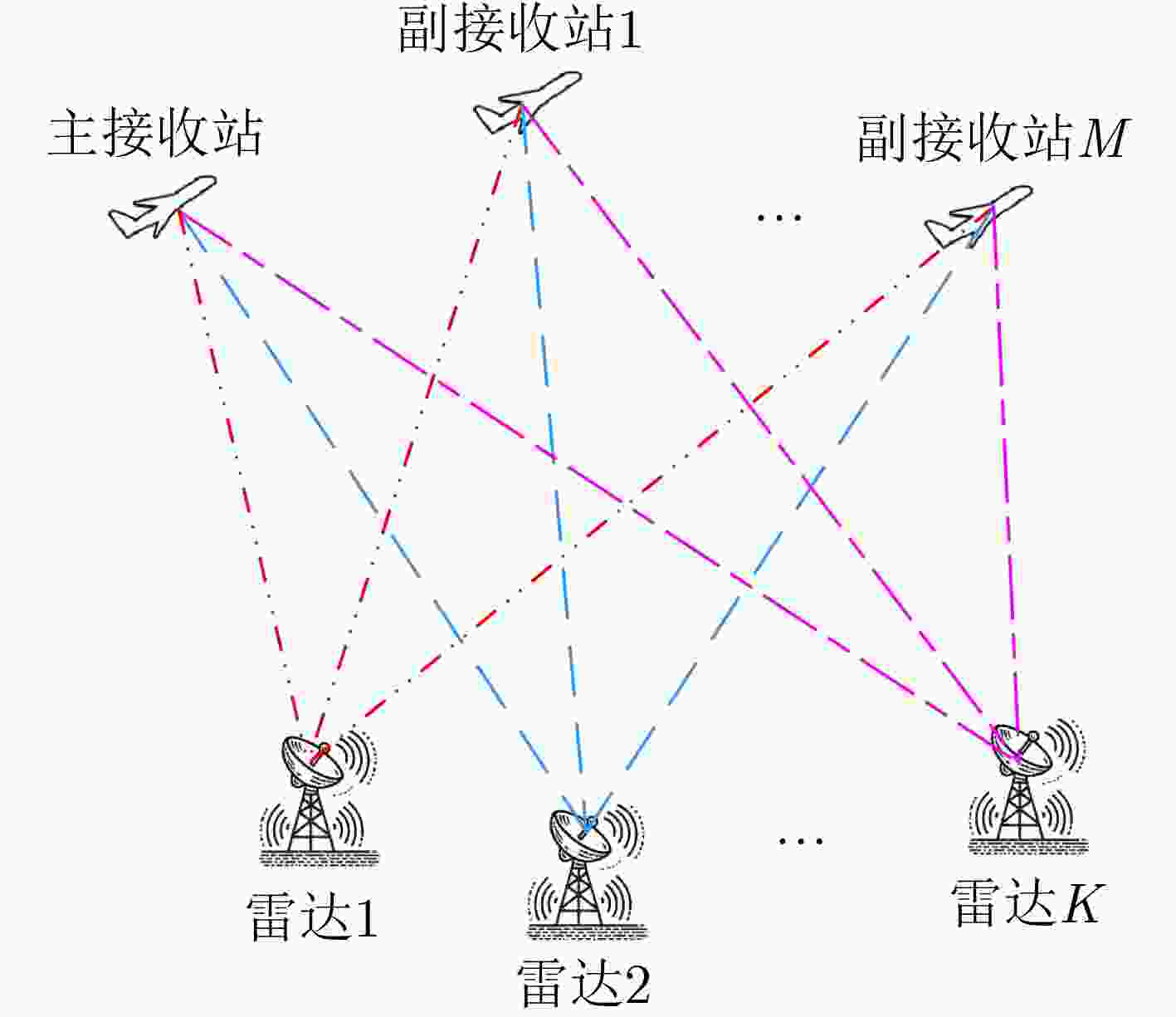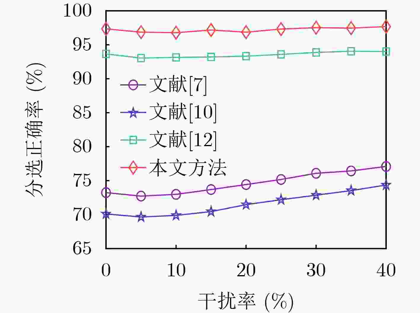 雷达序号 位置坐标(km) PRI(μs) PW(μs) CF(MHz) BW(MHz) 发射脉冲数 E1 ($ - $6.0, 0) 580固定 10.3固定 2 200~2 600滑变 6~8滑变 175 E2 ($ - $4.8, 1.8) 400/600参差 10/10.5跳变 2 400~2 500滑变 8.5固定 156 E3 ($ - $3.5, 3.5) 1 000~1 200滑变 10.1固定 2 250/2 500跳变 7/7.8跳变 103 E4 ($ - $2.4, 4.5) 1 240~1 300滑变 9~9.5滑变 1 800固定 6.5/7.5跳变 94 E5 ($ - $1.3, 5.5) 1 500固定 9.2固定 1 500~2 000滑变 7固定 75 E6 (3.5, $ - $4.5) 1 800/2 000/2 200参差 7.8/8/9.2跳变 700固定 4.8~5.4滑变 60 E7 (2.5, $ - $4.0) 3 000抖动 8.1固定 600/750跳变 4.5/5跳变 58 E8 (4.6, $ - $1.5) 5 000抖动 8~8.5滑变 2 150固定 4.5固定 42 E9 (0, $ - $6.0) 6 000固定 7.5固定 2 100~2 200滑变 5~5.6滑变 30 总数 793 表 5 场景3中雷达参数表