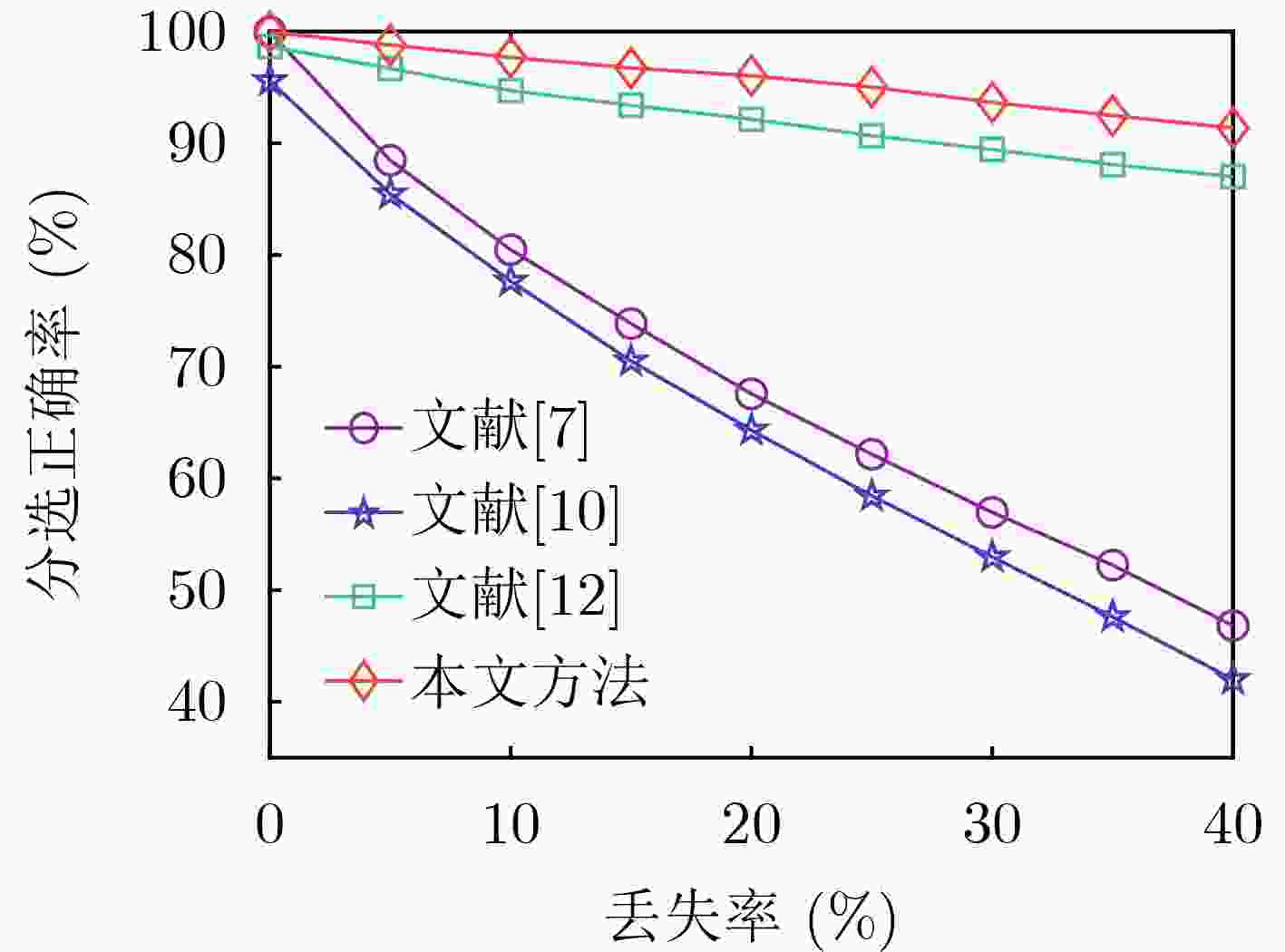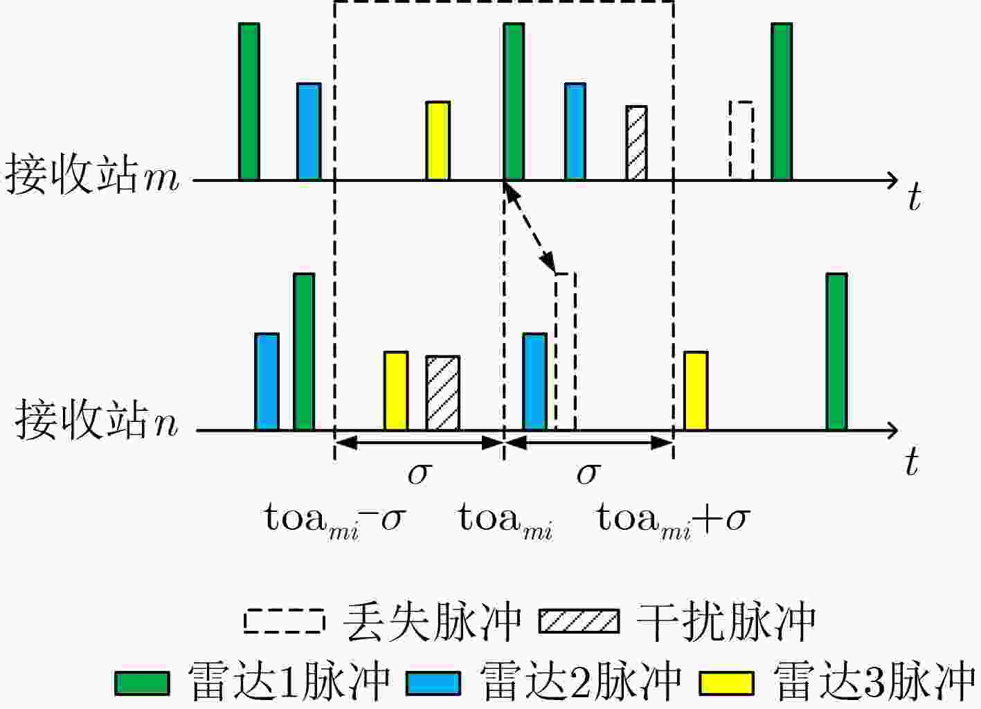 雷达序号 位置坐标(km) PRI(μs) PW(μs) CF(MHz) BW(MHz) 发射脉冲数 E1 ($ - $6.0, 0) 350抖动 11固定 2 500固定 7.8/7.9跳变 185 E2 ($ - $4.7, 1.7) 420/610参差 10/10.5跳变 2 400固定 7固定 164 E3 ($ - $3.8, 3.2) 550固定 10.3固定 2 200/2 600跳变 6/8跳变 100 E4 ($ - $2.5, 4.3) 1 240~1 300滑变 12.3固定 1 800固定 7.8/6.5跳变 90 E5 ($ - $0.9, 5.5) 1 630固定 10固定 2 450~2 550滑变 8.5固定 74 E6 (1.8, 4.5) 2 000/2 250/2 500参差 7.8/8/9.2跳变 2 800固定 5固定 61 E7 (2.5, $ - $4.0) 5 000抖动 9.7固定 600/750跳变 4.9/5.6跳变 56 E8 (4.6, $ - $1.8) 7 000抖动 9固定 1 500固定 3.2固定 42 E9 (6.0, 0) 10 000固定 7.5固定 2 100~2 200滑变 5.4固定 30 总数 802 表 2 接收站实际接收脉冲数