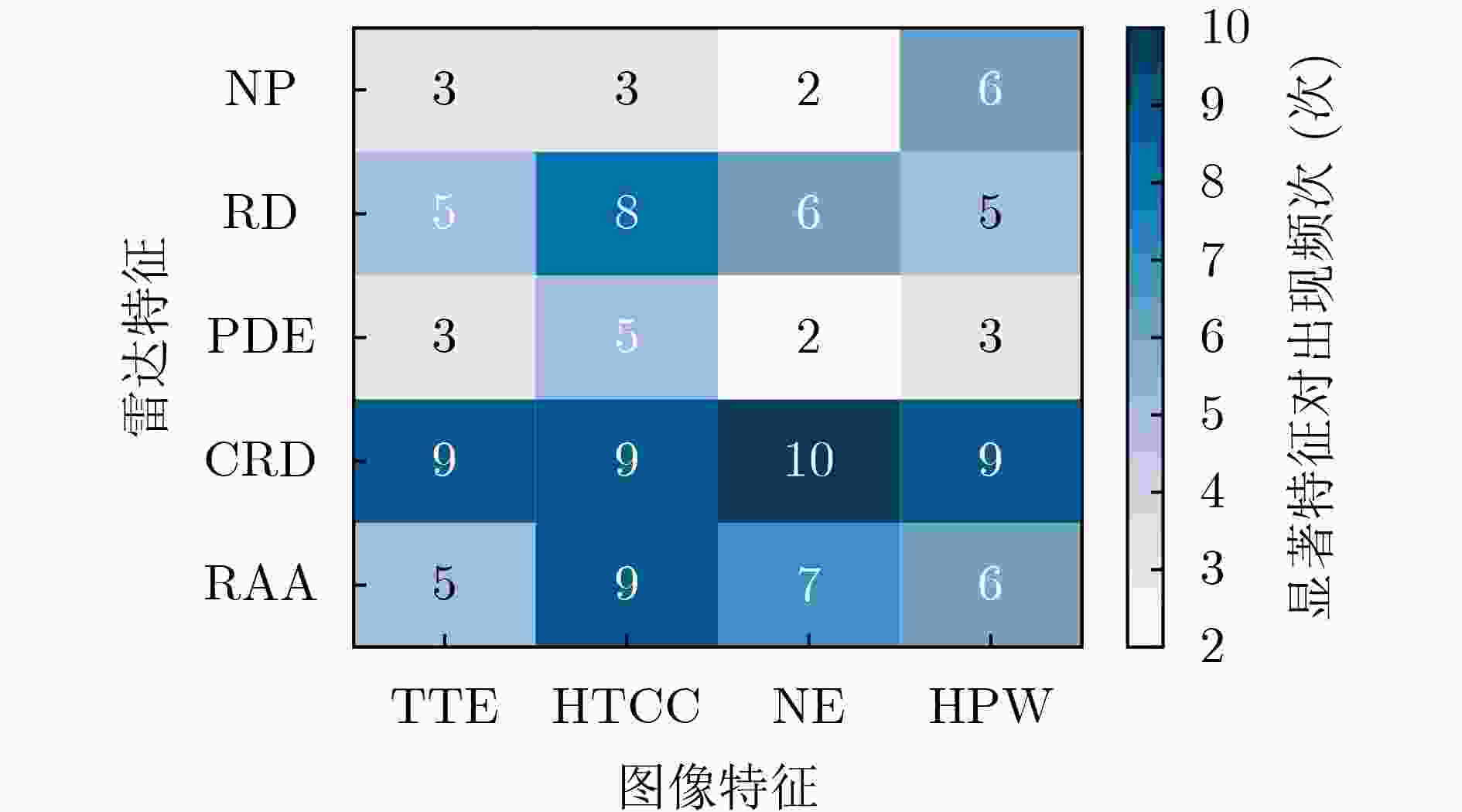 热纹理能量TTE 高温连通区域数HTCC 边缘点数NE 水平投影宽度HPW 413020540_HH 峰值个数NP –0.151 0.231 0.222 –0.097 径向尺寸RD 0.077 0.029 0.602 0.154 位置分布熵PDE –0.149 0.324 0.101 0.008 横向尺寸CRD –0.181 0.116 –0.563 –0.160 相对平均幅度RAA 0.027 0.131 –0.067 0.201 413020540_VV 峰值个数NP –0.297 –0.248 –0.111 0.228 径向尺寸RD –0.163 –0.272 –0.032 0.185 位置分布熵PDE –0.378 –0.304 0.015 0.270 横向尺寸CRD 0.419 0.060 –0.079 –0.075 相对平均幅度RAA –0.019 0.228 –0.057 0.064 表 6 搜救船相关系数表