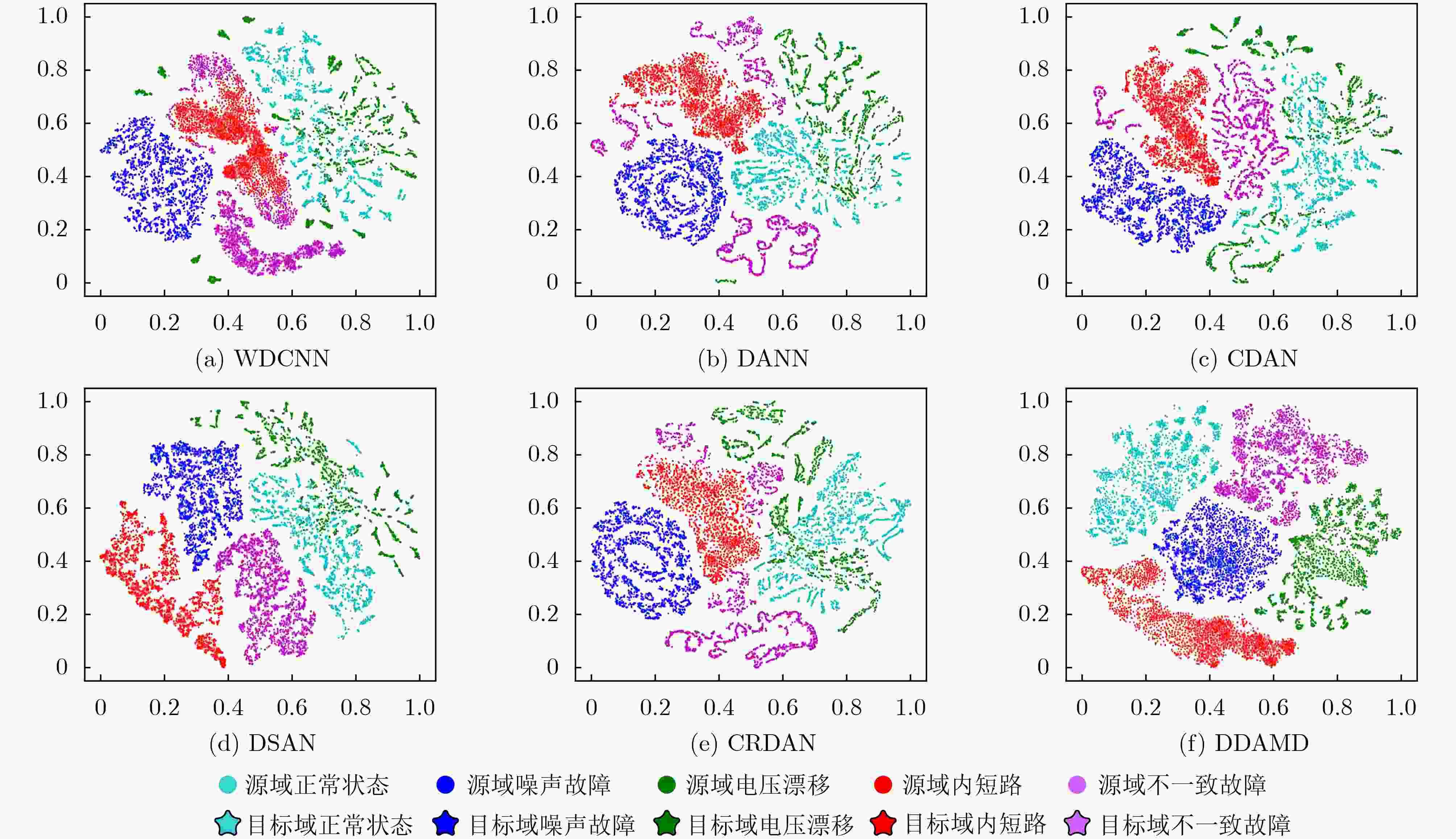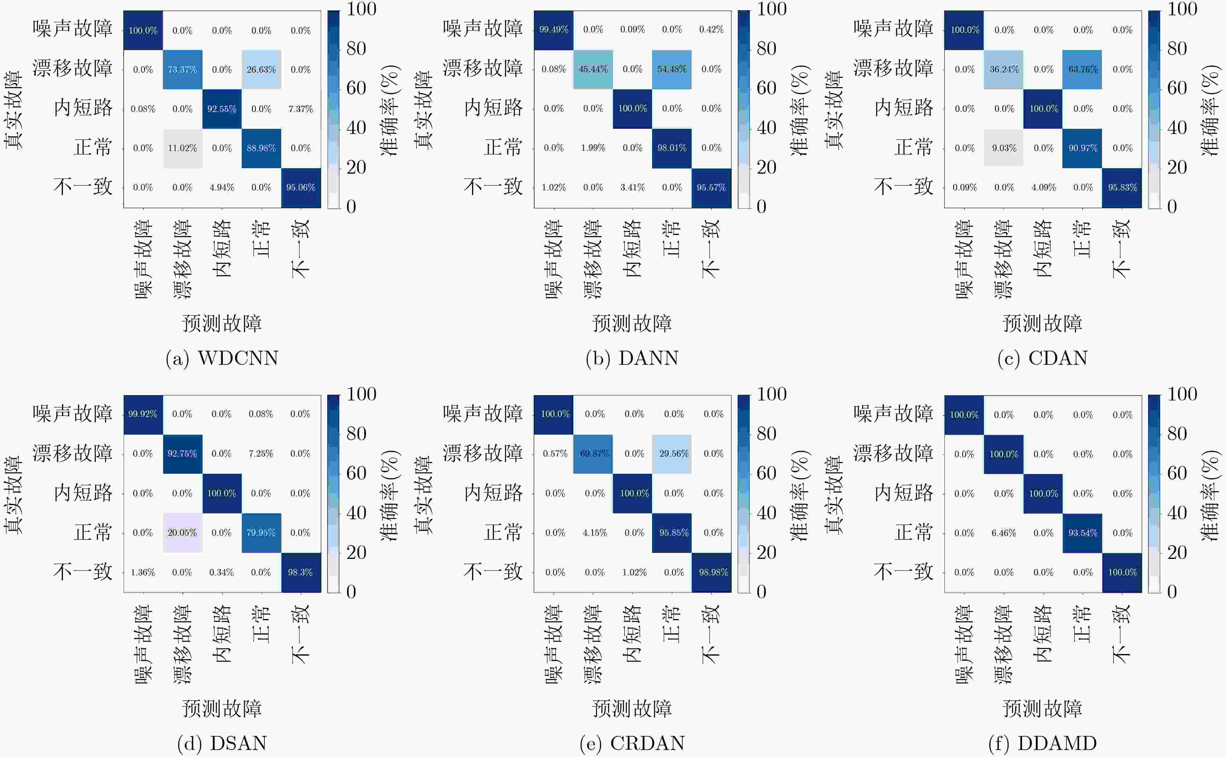 方法 UDDS→FUDS UDDS→US06 FUDS→US06 精度 召回率 F1分数 精度 召回率 F1分数 精度 召回率 F1分数 WDCNN 79.00 77.37 77.75 78.92 75.85 74.96 90.28 89.99 89.92 DANN 76.40 77.09 76.57 78.89 78.28 78.46 90.98 87.70 86.81 CDAN 73.67 72.44 70.99 77.33 76.66 74.06 86.95 84.61 83.38 DSAN 87.22 87.38 87.21 84.01 83.13 82.16 95.56 94.93 94.91 CRDAN 79.47 80.53 79.76 79.42 79.78 79.40 87.13 86.08 85.53 DDAMD 93.09 92.35 92.25 95.62 95.53 95.51 98.81 98.71 98.72 方法 FUDS→UDDS US06→UDDS US06→FUDS 精度 召回率 F1分数 精度 召回率 F1分数 精度 召回率 F1分数 WDCNN 79.65 69.68 67.06 68.60 63.60 64.25 93.20 92.31 92.28 DANN 68.61 68.02 65.36 84.19 77.56 76.43 94.80 94.58 94.57 CDAN 86.46 80.93 77.17 89.26 87.37 87.39 94.79 94.46 94.47 DSAN 85.48 75.78 74.73 79.14 60.47 54.43 96.09 96.05 96.04 CRDAN 87.10 77.56 75.18 79.17 77.84 74.55 90.34 88.17 87.89 DDAMD 90.43 88.54 87.96 94.74 94.65 94.66 99.89 99.88 99.88 表 4 所有模型的平均诊断时间(s)