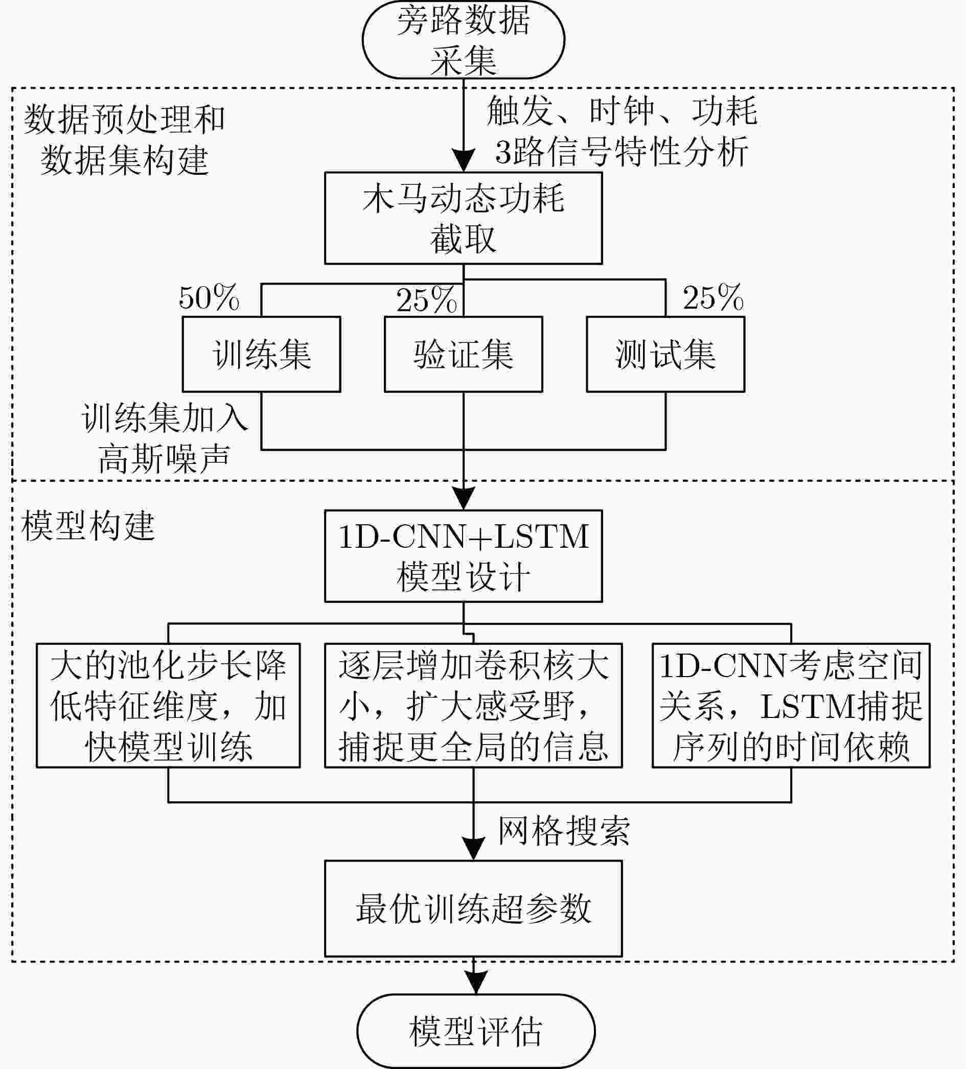 摘要: 随着集成电路设计与制造全球化,通过供应链植入硬件木马的潜在威胁日益显著。传统旁路检测方法依赖人工特征提取,易受噪声干扰且泛化能力不足,导致检测耗时且准确率不高。为此,该文提出一种基于一维卷积神经网络(CNN)及其与长短期记忆网络(LSTM)的组合架构(1D-CNN-LSTM)的硬件木马旁路检测方法,分别从局部空间特征与时序依赖关系两方面捕获硬件木马动态功耗信号特征,构建算法模型进行硬件木马检测。另外为了提高检测效率和算法鲁棒性,该文结合硬件木马特征对瞬态功耗原始数据进行预处理,并引入高斯噪声进行样本增强。以流片后的ASIC芯片为对象,开展硬件木马检测实验,结果显示经数据预处理后,1D-CNN-LSTM模型的训练效率提升近10倍,算法在4分类任务中的整体检测精度达到99.6%。该文所提出的方法可有效降低计算资源消耗、消除噪声干扰并实现高精度检测。Abstract: