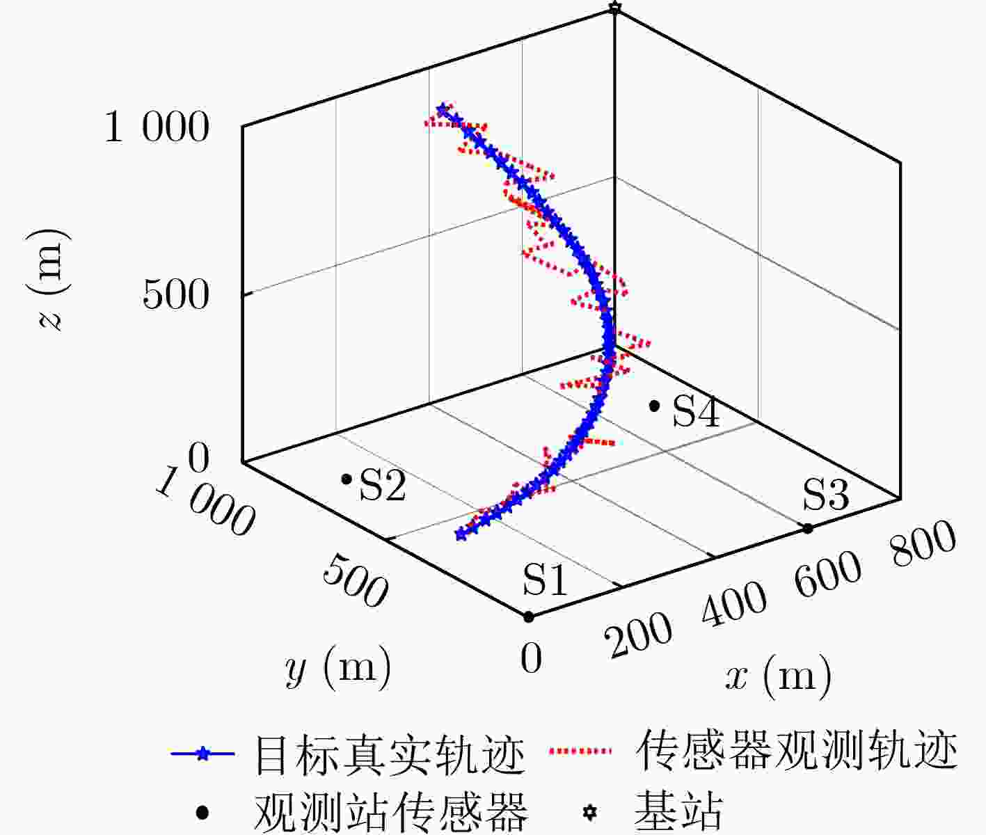 参数名 参数值 目标初始位置(m) (100,400,20) 目标初始速度(v) (60,9,12) 目标初始加速度(m/s2) (–4,1,2) 初始粒子数 200 过程噪声协方差阵 diag($1_3^2 $, $0.1_3^2 $, $0.01_3^2 $) 观测噪声协方差阵 diag(1002,0.12,0.12) 表 2 算法平均位置误差和单步计算时间
