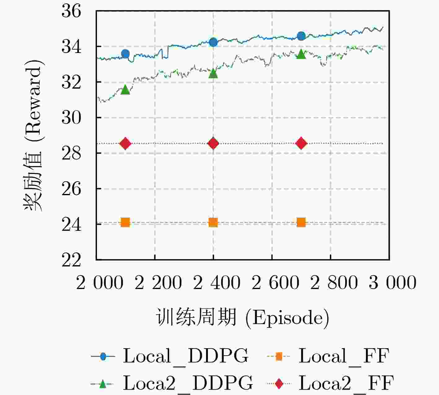 • 摘要: 针对无人机(UAV)携带智能反射面(RIS)与固定RIS共同辅助移动的用户车辆(UE)通信的场景,建立UAV飞行轨迹和双RIS相移联合优化问题,使UE在移动过程中始终保持通信速率最大。由于系统的复杂性和环境的动态性,该文提出一种基于深度确定性策略梯度算法和相移对齐方法来处理连续轨迹和RIS相移的优化问题。仿真结果验证了所提的联合优化算法在1 000个Episode以内便能得到较稳定的奖励值,通过与其它基准方法对比,表明了所提算法可在双RIS部署的环境中比使用随机轨迹和相移算法时通信速率至少可提高3 dB。最后给出了不同基站和RIS的部署位置下的UAV的最优轨迹,并对不同车速下算法的适用性进行了仿真分析。