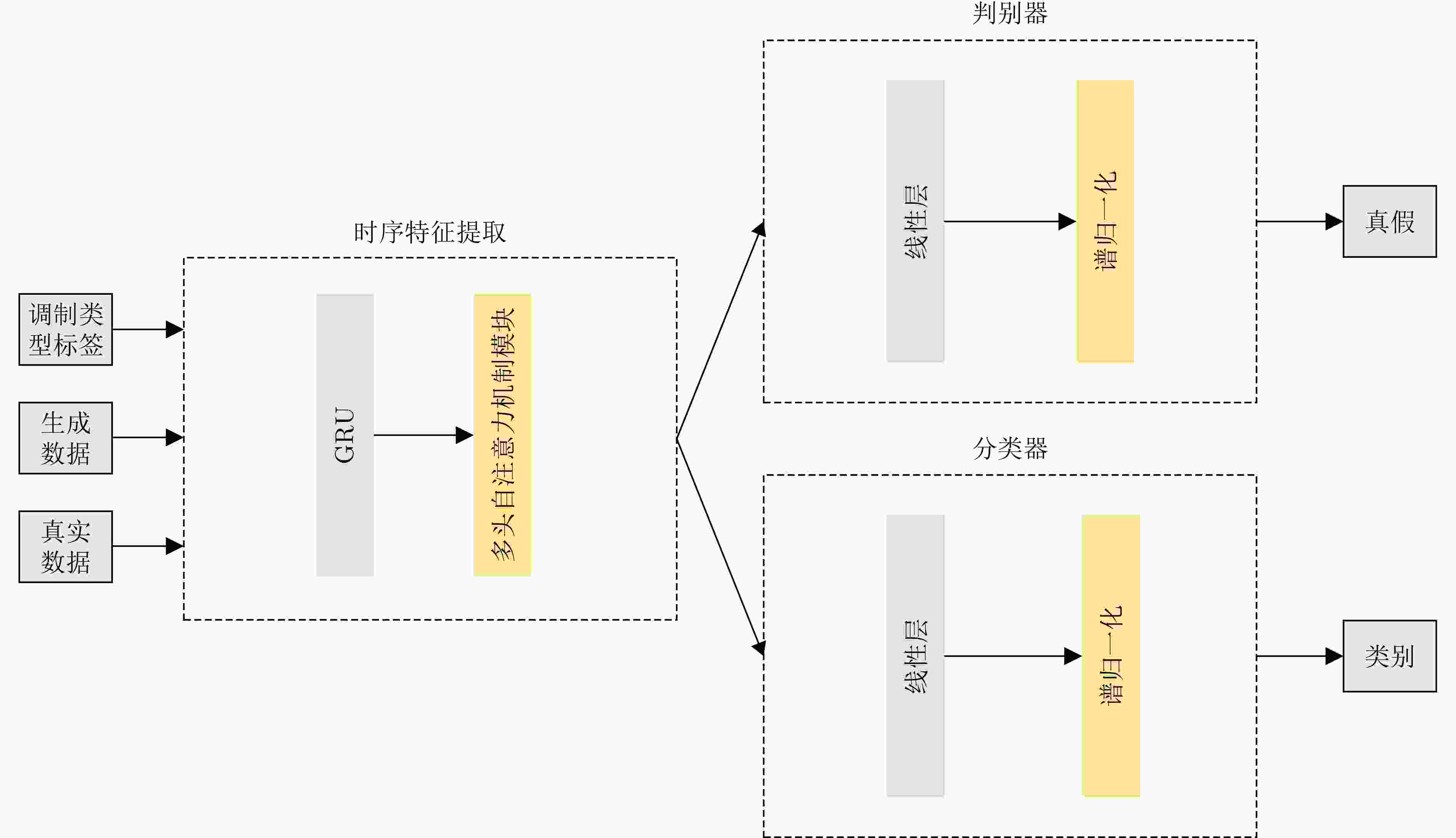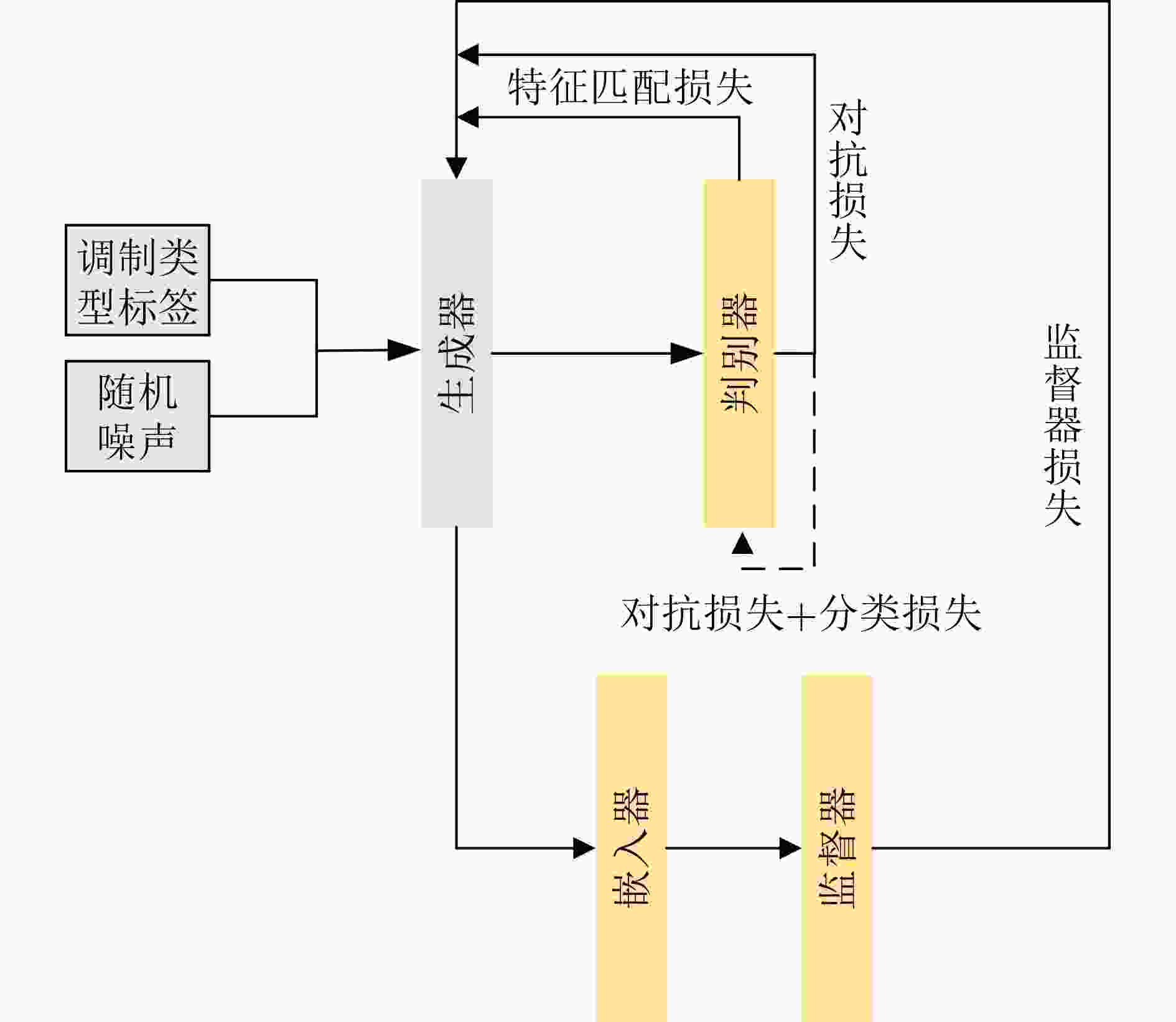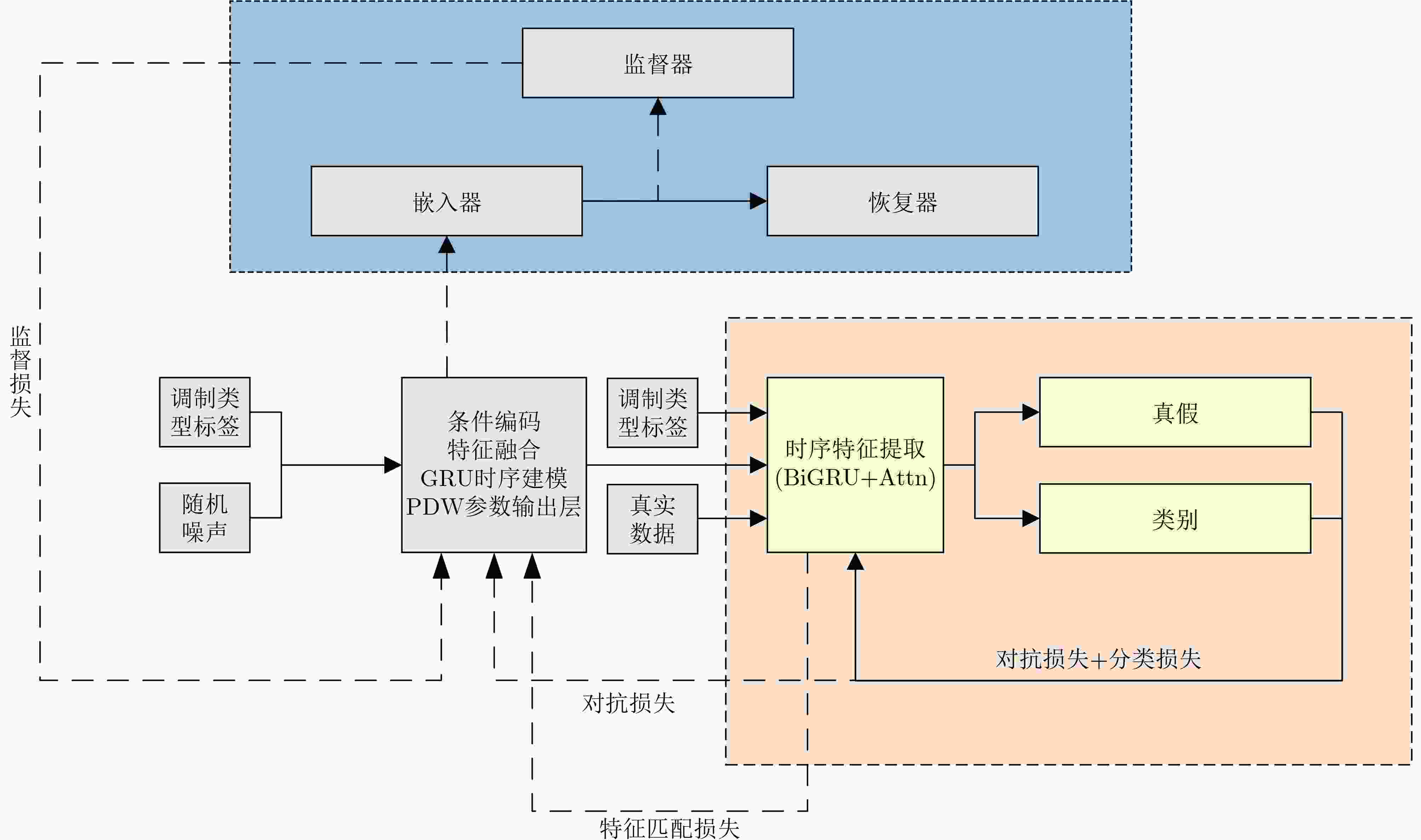 摘要: 针对雷达对抗侦察中脉冲描述字(PDW)数据稀缺及生成质量不足的问题,该文提出时序条件生成对抗网络(Time-CondGAN)。该方法通过多模态条件生成框架融合脉冲序列时域特征与辐射源分类信息,采用双向门控循环单元 (GRU)监督器与特征匹配损失实现时序连续性与统计分布的双重约束。网络架构包含3个核心模块:(1)条件编码网络将调制类型嵌入为128维特征向量,通过时序维度扩展与潜在噪声拼接,实现类别可控生成;(2)多任务判别器联合执行对抗判别与信号分类,通过共享双向GRU-注意力特征提取层捕捉长程依赖关系;(3)时序-统计联合优化器整合对抗损失、监督损失与特征匹配损失,在对抗训练阶段同步更新生成器与判别器参数。实验表明,Time-CondGAN生成的PDW数据在关键时序参数的KL散度较TimeGAN平均降低28.25%,显著提升物理合理性;可视化结果证明模型性能满足要求,消融实验证明改进模块的有效性。在下游任务验证中,生成数据使VGG16与LSTM分类器的识别准确率最高提升37.2%,较TimeGAN生成数据平均高8.25%(VGG16)与4.2%(LSTM)。Abstract: