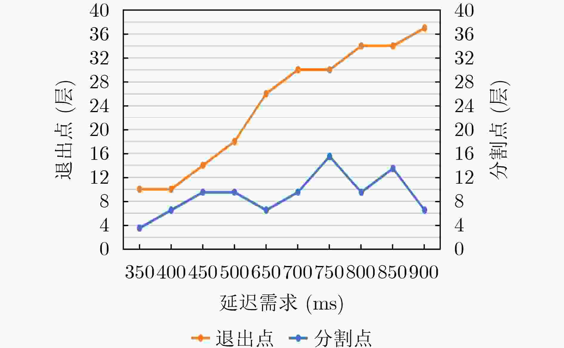 ${F}_{\mathrm{e}},{D}_{\mathrm{t}},B,T $, ${C}_{\mathrm{u}\mathrm{s}\mathrm{a}\mathrm{g}\mathrm{e}},{M}_{\mathrm{u}\mathrm{s}\mathrm{a}\mathrm{g}\mathrm{e}} $, ${B}_{\mathrm{u}\mathrm{p}},{D}_{\mathrm{n}\mathrm{e}\mathrm{t}},{E}_{\mathrm{b}\mathrm{a}\mathrm{t}\mathrm{t}\mathrm{e}\mathrm{r}\mathrm{y}},{P}_{\mathrm{t}\mathrm{a}\mathrm{s}\mathrm{k}},{T}_{\mathrm{d}\mathrm{e}\mathrm{a}\mathrm{d}\mathrm{l}\mathrm{i}\mathrm{n}\mathrm{e}} $输出:退出点$ n $和分区策略$ {S}_{n} $ (1) 初始化:实时采集系统指标 (2) 对于每个$ n $从$ N-1 $~1: (3) 选择退出点$ n $,构建的$ {G}_{n} $扩展图$ {G}_{n}{{'}} $ (4) 归一化各维度指标 (5) 动态分配权重 (6) 计算综合负载评分$ {L}_{\mathrm{s}\mathrm{c}\mathrm{o}\mathrm{r}\mathrm{e}}=\displaystyle\sum\nolimits_{i=1}^{k}{\omega }_{i}\cdot {\hat{X}}_{i} $ (7) 如果任一指标变化超过阈值$ \Delta X={\mu }_{X}+2{\sigma }_{X} $: (8) 触发权重更新并重新计算$ {L}_{\mathrm{s}\mathrm{c}\mathrm{o}\mathrm{r}\mathrm{e}} $ (9) 如果当前任务优先级$ {P}_{\mathrm{t}\mathrm{a}\mathrm{s}\mathrm{k}} $为高(=1.0): (10) 立即调用轻负载算法(算法1) (11) 如果$ {0\le L}_{\mathrm{s}\mathrm{c}\mathrm{o}\mathrm{r}\mathrm{e}} < 0.4 $: (12) 调用轻负载分区算法(算法1) (13) 如果$ {0.4\le L}_{\mathrm{s}\mathrm{c}\mathrm{o}\mathrm{r}e}\le 1 $: (14) 调用重负载分区算法(算法2) (15) 计算总时间:$ {T}_{n}=\mathrm{m}\mathrm{i}\mathrm{n}\mathrm{i}\mathrm{m}\mathrm{i}\mathrm{z}\mathrm{e}T\left({T}_{\mathrm{d}}+{T}_{\mathrm{t}}+{T}_{\mathrm{e}}\right) $ (16) 如果 $ {T}_{n}\le {T}_{\mathrm{d}\mathrm{e}\mathrm{a}\mathrm{d}\mathrm{l}\mathrm{i}\mathrm{n}\mathrm{e}} $: (17) 返回退出点$ n $和分区策略$ {S}_{n} $ (18) 否则: (19) 继续循环 (20) 根据实际推理延迟和精度数据,更新权重$ {\omega }_{i} $与动态阈值$ \Delta X $ (21) 返回退出点$ n $和分区策略$ {S}_{n} $ -