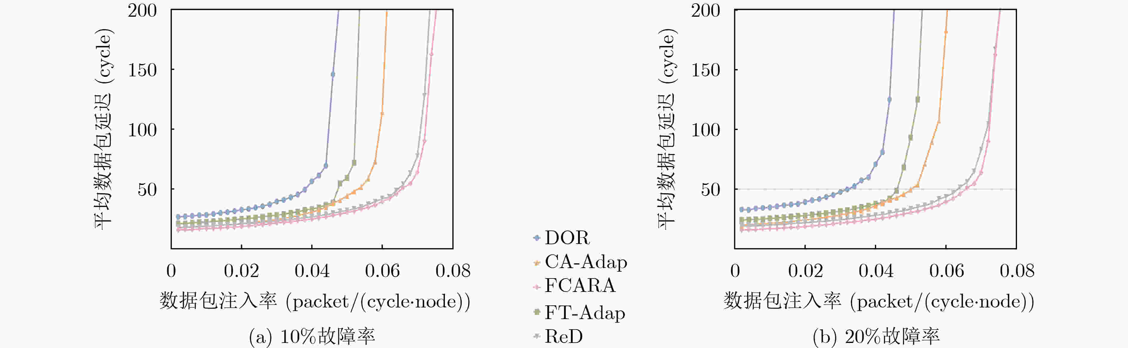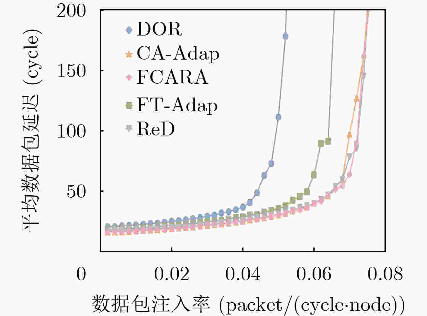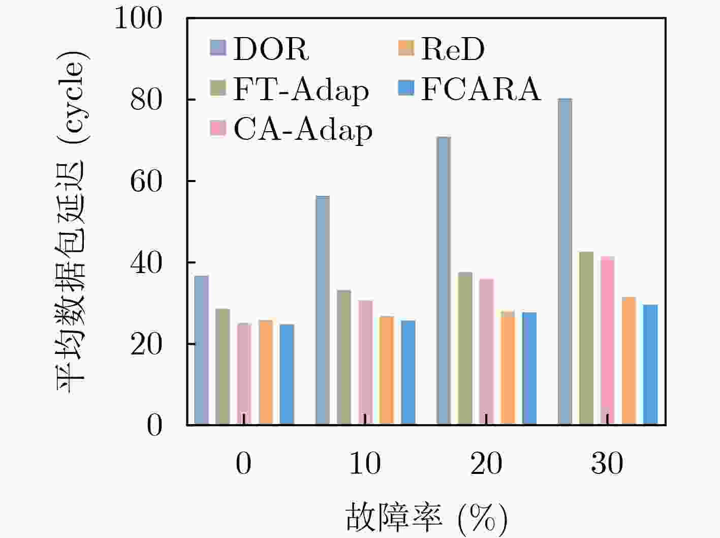 输入:c, d, p, $ {\mathit{F}}_{\rm{c}\rm{o}\rm{d}\rm{e}} $, $ {\mathit{C}}_{\rm{s}\rm{t}\rm{a}\rm{t}\rm{u}\rm{s}} $ 1. CandidateDirs = GetDirections(c, d); 2. MinWeight = INF; 3. for each dir in CandidateDirs do 4. if ! IsDeadlock(p.currentVC, dir) then 5. $ {W}_{\mathrm{f}} $ = FaultCost($ {F}_{\mathrm{c}\mathrm{o}\mathrm{d}\mathrm{e}} $(dir)); 6. if $ {W}_{\mathrm{f}} $ == INF then 7. continue; 8. $ {W}_{\mathrm{c}} $ = CongestionCost($ {C}_{\mathrm{s}\mathrm{t}\mathrm{a}\mathrm{t}\mathrm{u}\mathrm{s}}\left(\mathrm{d}\mathrm{i}\mathrm{r}\right) $); 9. $ {W}_{\mathrm{d}} $ = DistanceCost(c, d, dir); 10. $ W={\sigma }_{\mathrm{f}}\times {W}_{\mathrm{f}}+{\sigma }_{\mathrm{c}}\times {W}_{\mathrm{c}}+{\sigma }_{\mathrm{d}}\times {W}_{\mathrm{d}} $; 11. if $ W $ < MinWeight then 12. MinWeight = $ W $; 13. SelectedDir = dir; 14. $ {\mathrm{n}\mathrm{e}\mathrm{x}\mathrm{t}}_{\mathrm{d}\mathrm{i}\mathrm{r}} $ = SelectedDir; 输出:$ {\rm{n}\rm{e}\rm{x}\rm{t}}_{\rm{d}\rm{i}\rm{r}} $ 表 1 仿真参数配置
