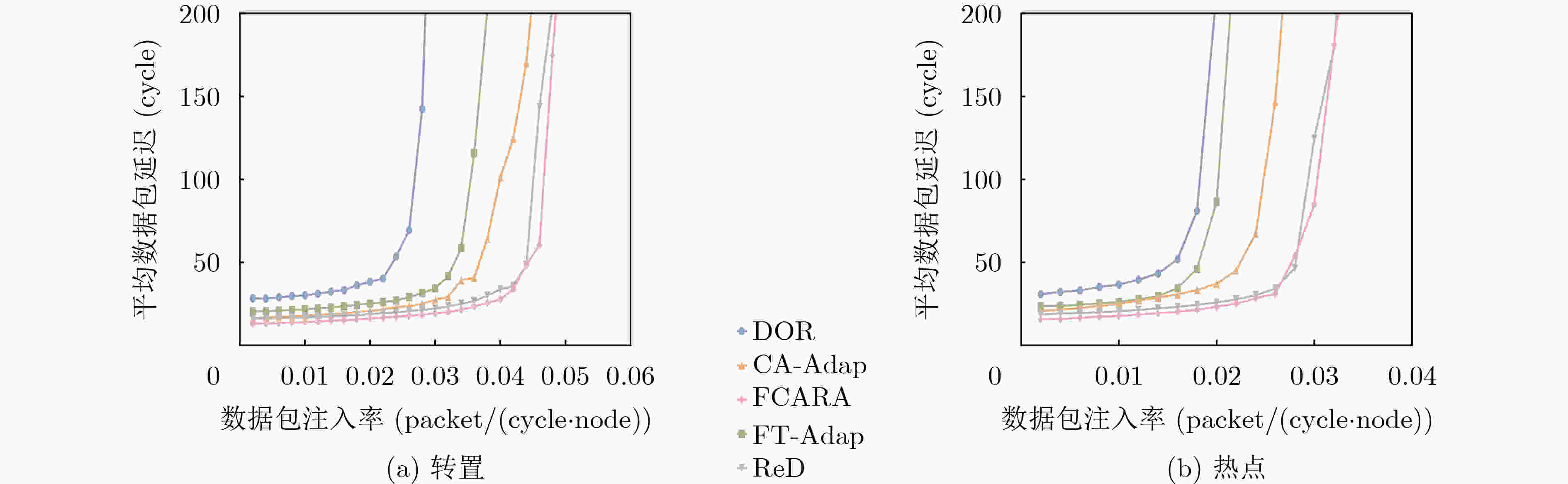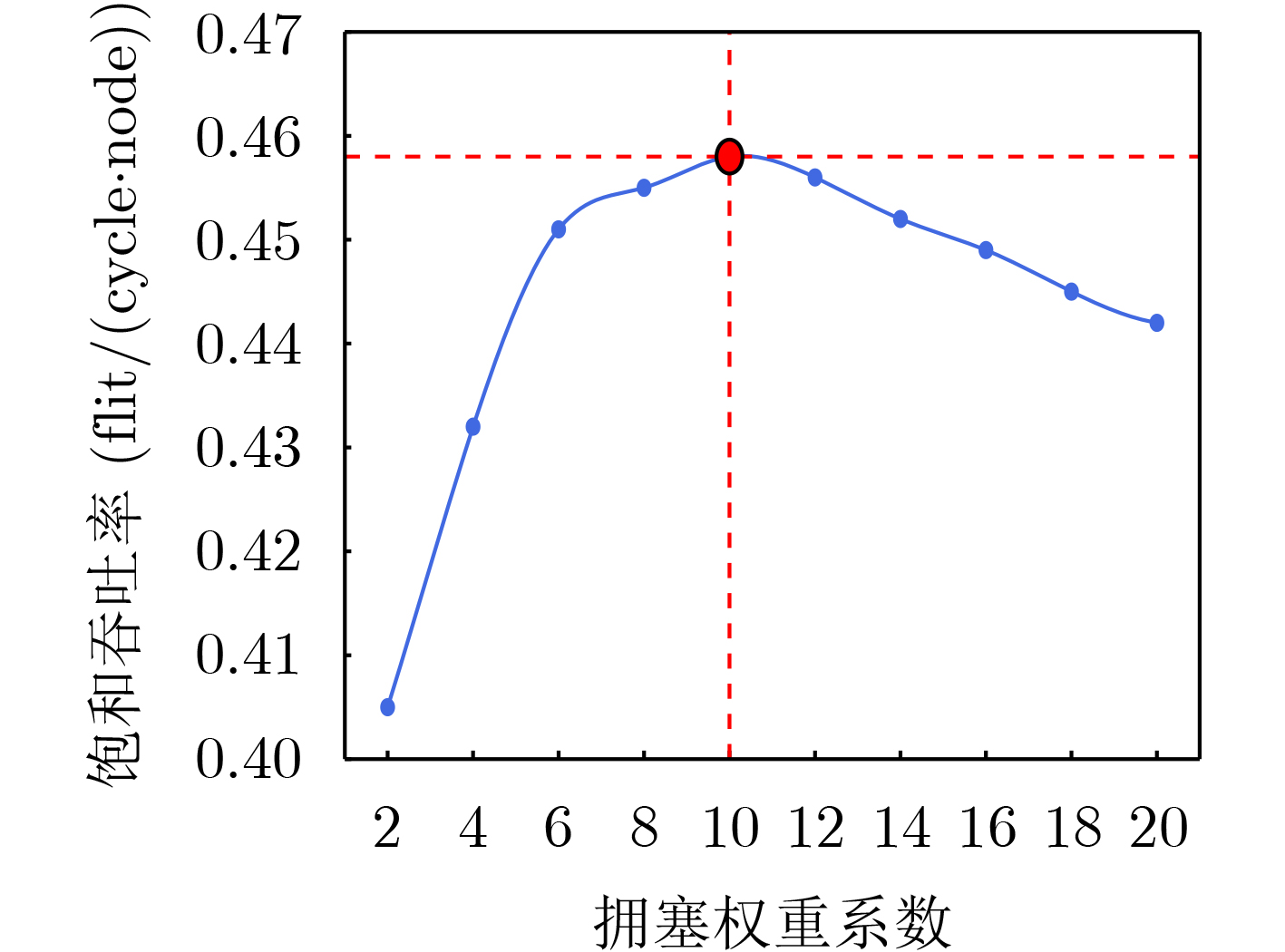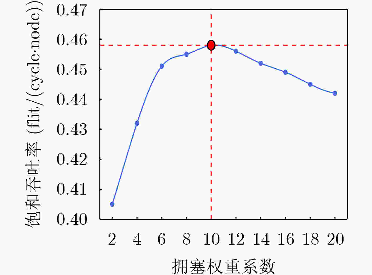 输入:c, d, p, $ {\mathit{F}}_{\rm{c}\rm{o}\rm{d}\rm{e}} $, $ {\mathit{C}}_{\rm{s}\rm{t}\rm{a}\rm{t}\rm{u}\rm{s}} $ 1. CandidateDirs = GetDirections(c, d); 2. MinWeight = INF; 3. for each dir in CandidateDirs do 4. if ! IsDeadlock(p.currentVC, dir) then 5. $ {W}_{\mathrm{f}} $ = FaultCost($ {F}_{\mathrm{c}\mathrm{o}\mathrm{d}\mathrm{e}} $(dir)); 6. if $ {W}_{\mathrm{f}} $ == INF then 7. continue; 8. $ {W}_{\mathrm{c}} $ = CongestionCost($ {C}_{\mathrm{s}\mathrm{t}\mathrm{a}\mathrm{t}\mathrm{u}\mathrm{s}}\left(\mathrm{d}\mathrm{i}\mathrm{r}\right) $); 9. $ {W}_{\mathrm{d}} $ = DistanceCost(c, d, dir); 10. $ W={\sigma }_{\mathrm{f}}\times {W}_{\mathrm{f}}+{\sigma }_{\mathrm{c}}\times {W}_{\mathrm{c}}+{\sigma }_{\mathrm{d}}\times {W}_{\mathrm{d}} $; 11. if $ W $ < MinWeight then 12. MinWeight = $ W $; 13. SelectedDir = dir; 14. $ {\mathrm{n}\mathrm{e}\mathrm{x}\mathrm{t}}_{\mathrm{d}\mathrm{i}\mathrm{r}} $ = SelectedDir; 输出:$ {\rm{n}\rm{e}\rm{x}\rm{t}}_{\rm{d}\rm{i}\rm{r}} $ 表 1 仿真参数配置
