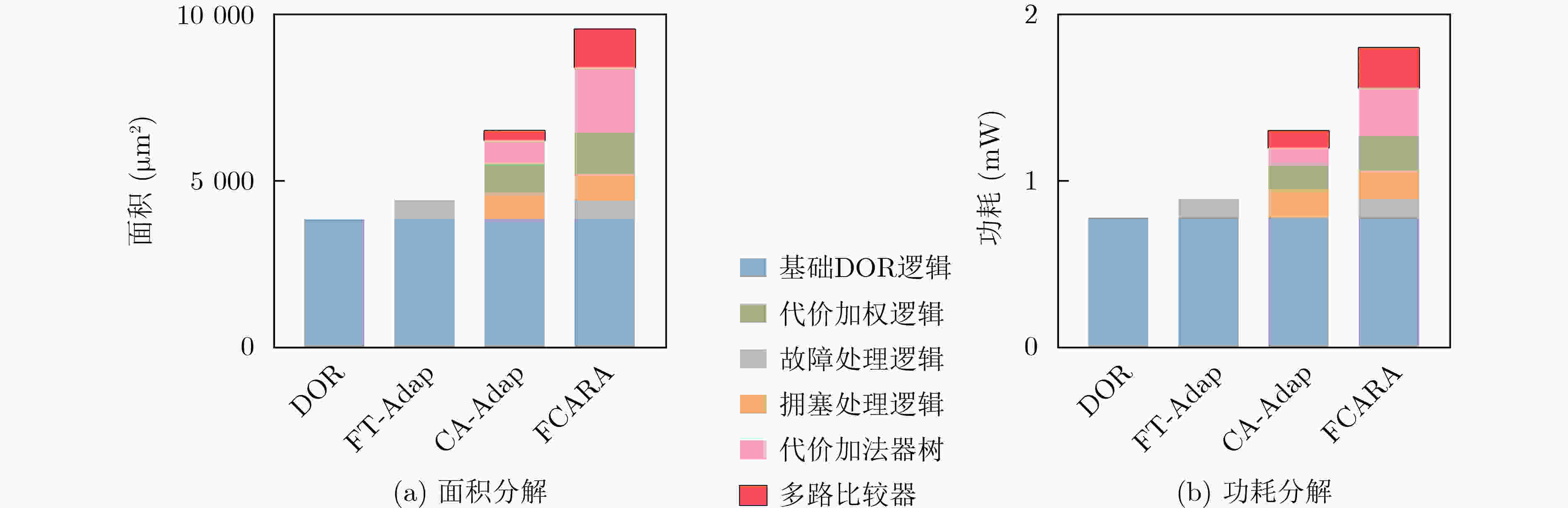 主要组件 DOR FT-Adap CA-Adap FCARA 相对值(vs. DOR)(%) 输入缓冲区 3.95 3.97 4.03 4.08 103.3 路由计算单元 0.78 0.89 1.30 1.80 230.8 虚通道分配器 0.88 0.90 0.95 0.99 112.5 交换仲裁器 0.88 0.90 0.95 0.99 112.5 交叉开关 2.95 2.96 2.98 3.01 102.0 其他控制逻辑 0.39 0.41 0.45 0.49 125.6 总功耗 9.83 10.03 10.66 11.36 115.6 -