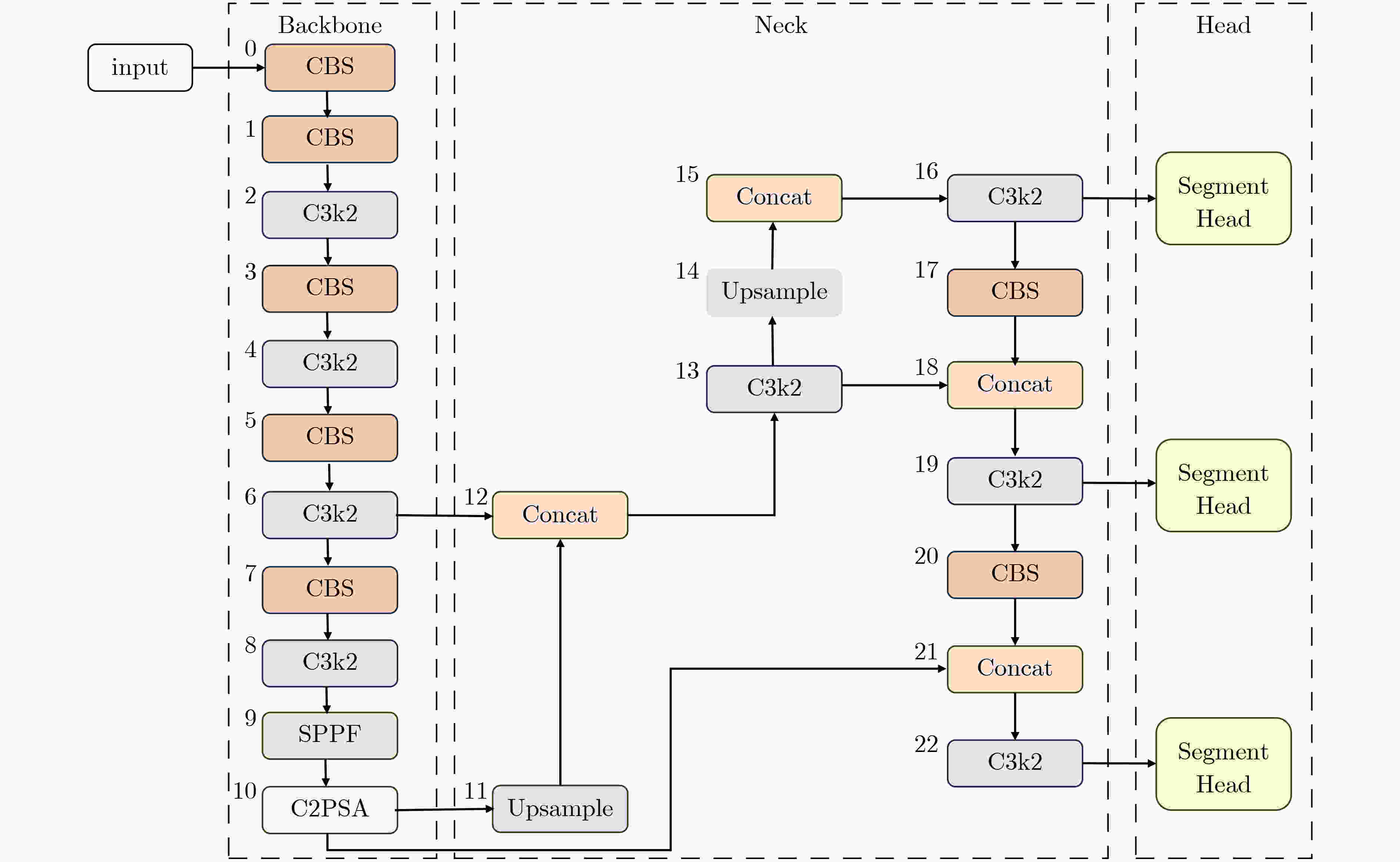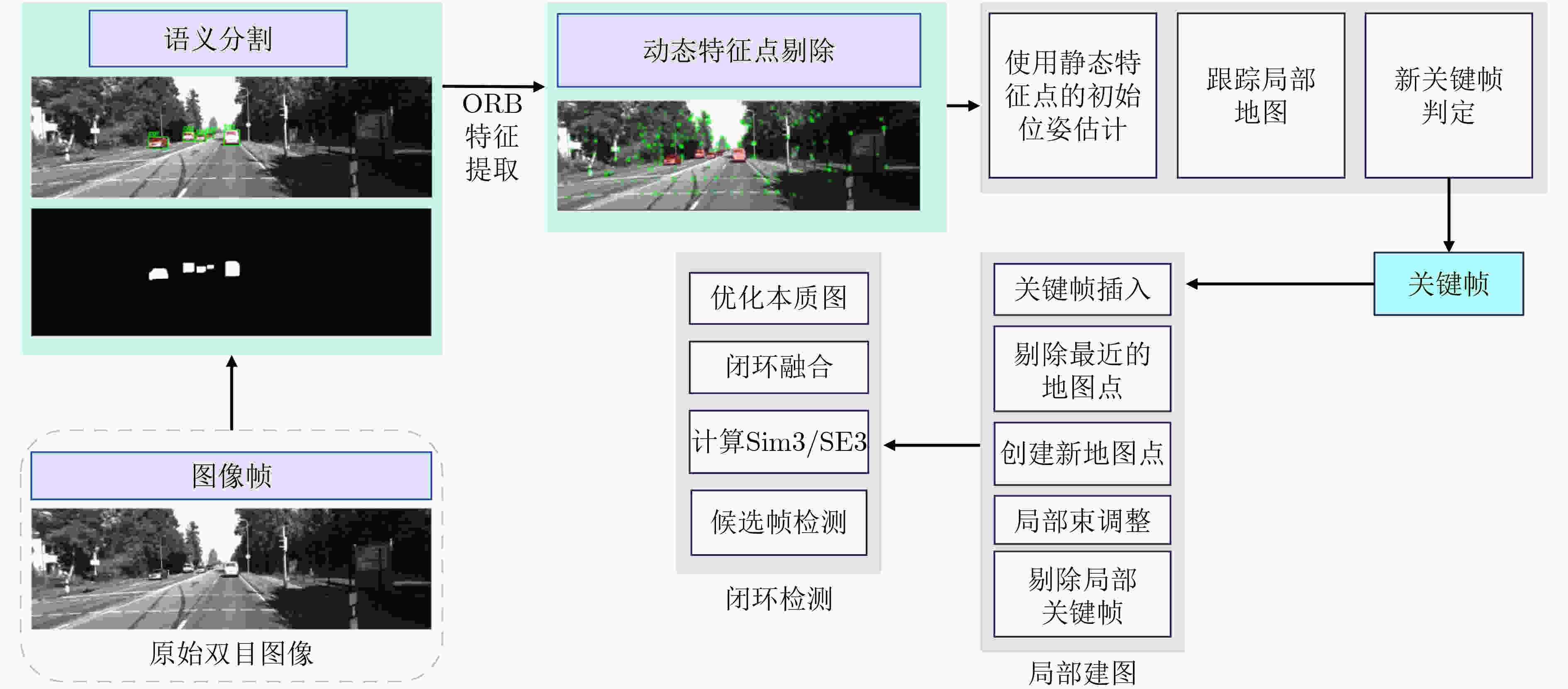 摘要: 为提升巡检机器人在城市动态环境中的定位精度与鲁棒性,该文提出一种基于第3代定向快速与旋转简要同步定位与建图系统 (ORB-SLAM3)的轻量级语义视觉同步定位与建图(SLAM)框架。该框架通过紧耦合所提出的轻量级语义分割模型(DHSR-YOLOSeg)输出的语义信息,实现动态特征点的精准剔除与稳健跟踪,从而有效缓解动态目标干扰带来的特征漂移与建图误差累积问题。DHSR-YOLOSeg基于YOLO第11代轻量级分割模型(YOLOv11n-seg)架构,融合动态卷积模块(C3k2_DynamicConv)、轻量特征融合模块(DyCANet)与复用共享卷积分割(RSCS)头,在分割精度小幅提升的同时,有效降低了计算资源开销,整体展现出良好的轻量化与高效性。在COCO数据集上,相较于基础模型,DHSR-YOLOSeg实现参数量减少13.8%、109次浮点运算(GFLOPs)降低23.1%、平均精度指标(mAP50)提升约2%;在KITTI数据集上,DHSR-YOLOSeg相比其他主流分割模型及YOLO系列不同版本,在保持较高分割精度的同时,进一步压缩了模型参数量与计算开销,系统整体帧率得到有效提升。同时,所提语义SLAM系统通过动态特征点剔除有效提升了定位精度,平均轨迹误差相比ORB-SLAM3降低8.78%;在此基础上,系统平均每帧处理时间较主流方法如DS-SLAM和DynaSLAM分别降低约18.55%与41.83%。研究结果表明,该语义视觉SLAM框架兼具实时性与部署效率,显著提升了动态环境下的定位稳定性与感知能力。Abstract: