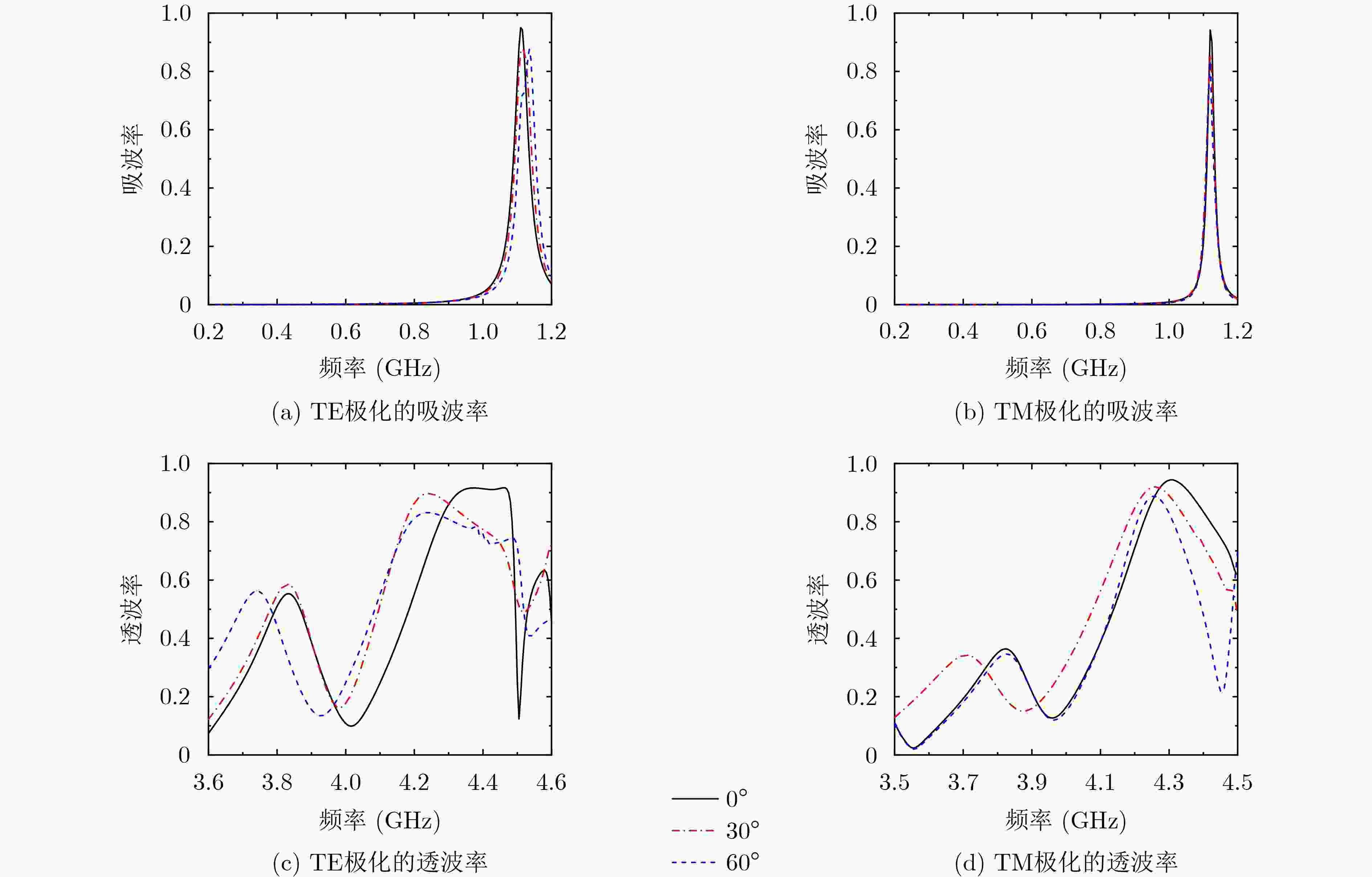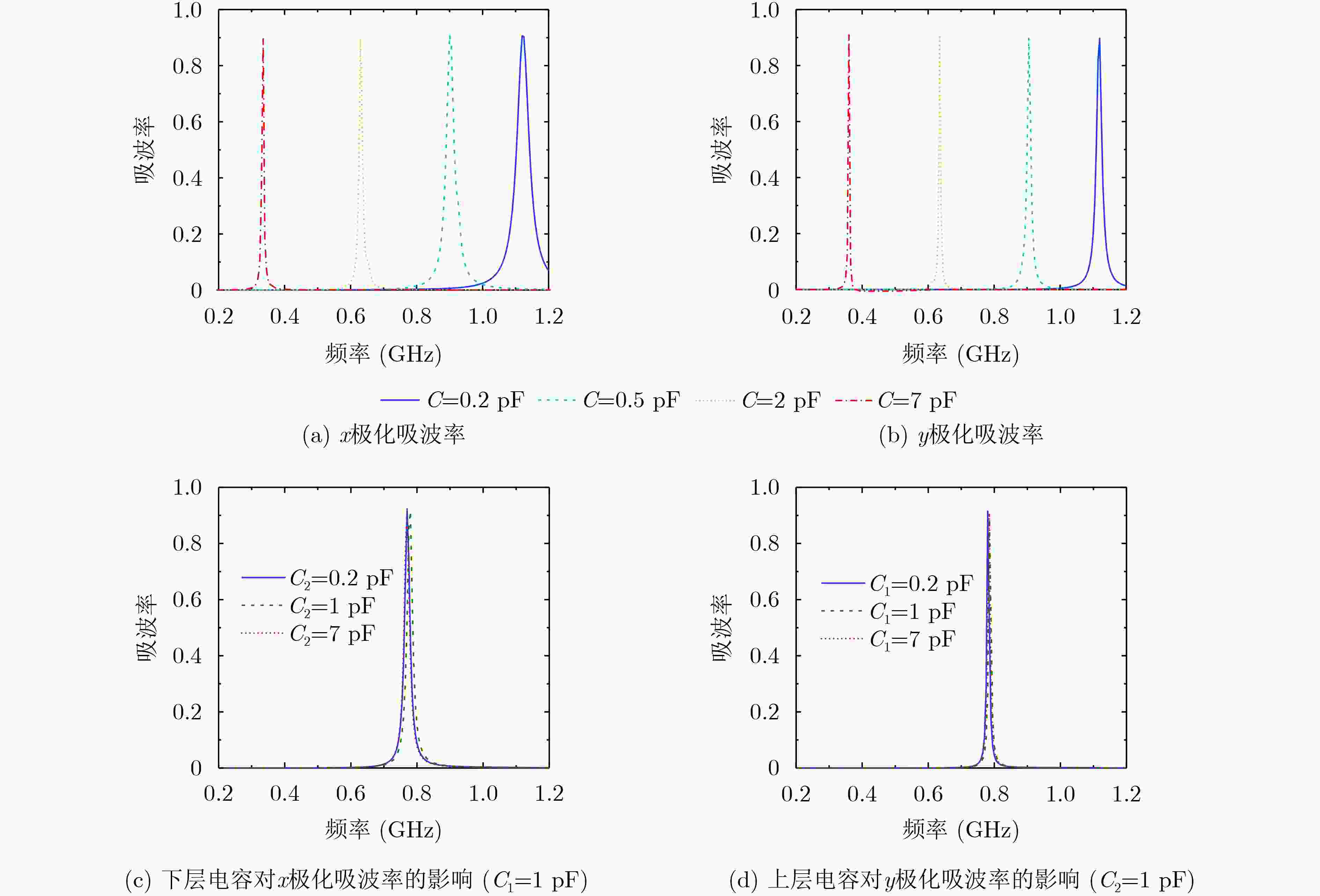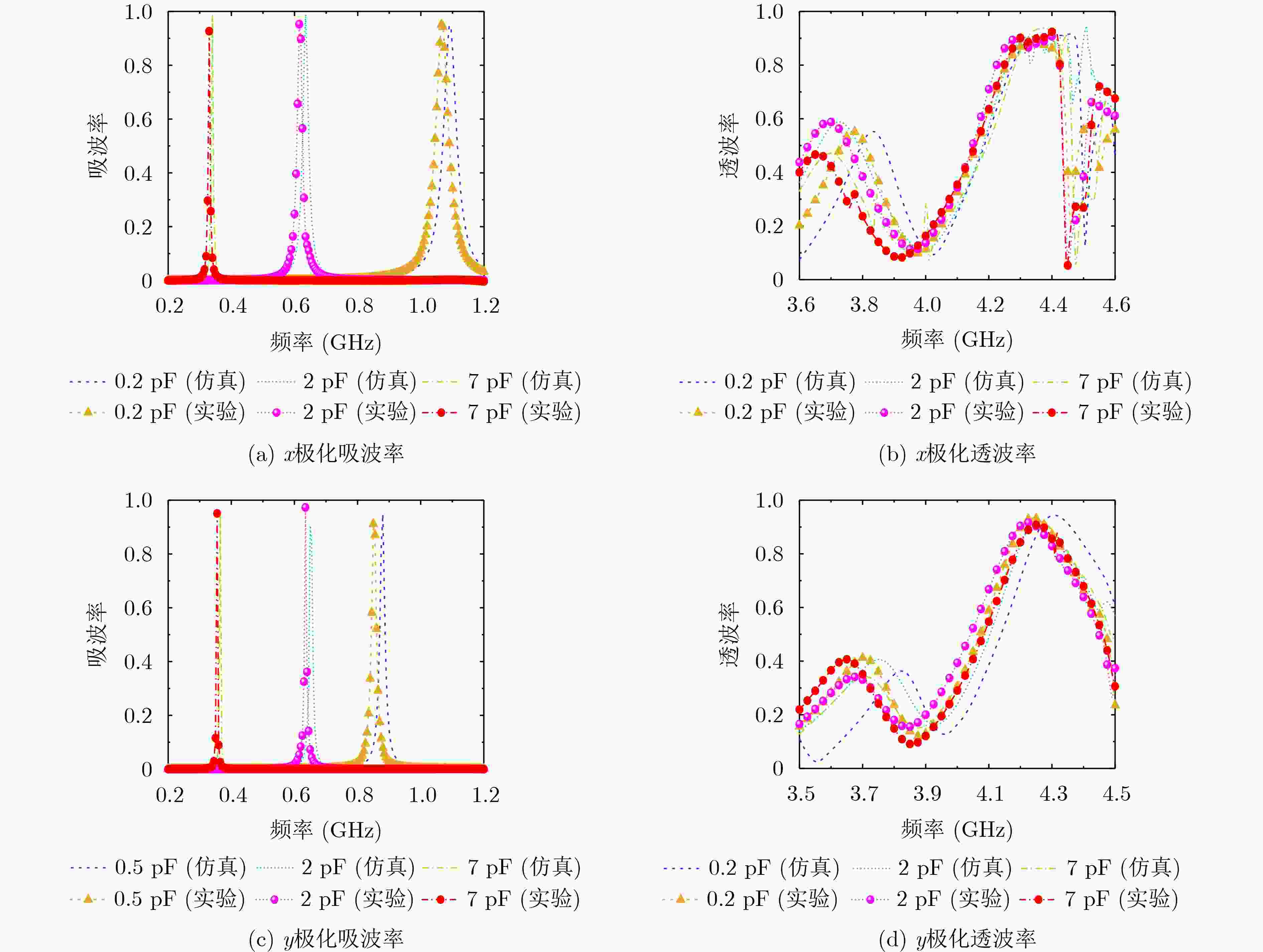 变容管数(个)极化不敏感 透波 [22] R+C 0.400~2.500 40.70 0.069 0×0.014 0 2/1 N N [23] R+C 0.415~0.822 92.30 0.100 0×0.018 0 2/1 N N [24] C 0.700~1.900 99.05 0.033 0×0.021 0 9/1 Y N [25] C 0.613~1.816 278.00 0.104 0×0.005 2 2/2 Y N [26] C 0.980~3.760 56.09 0.099 0×0.009 9 2/2 Y N [27] RIN+C 1.860~3.310 144.80 0.054 0×0.076 0 3/1 Y N 本文 R+C 0.340~1.100 105.60 0.046 0×0.007 9 2/1 Y Y -