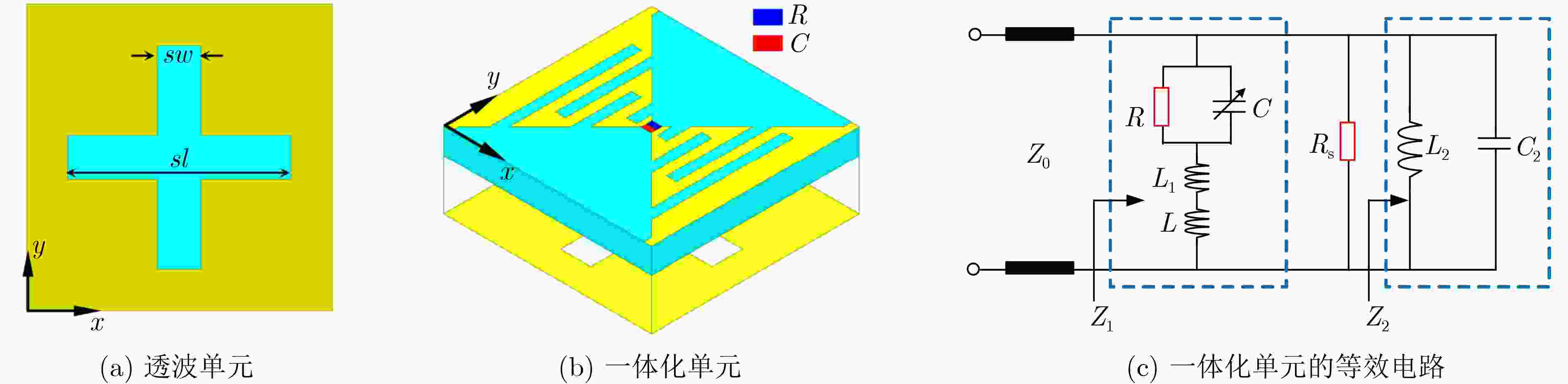 Objective Frequency Selective Surfaces (FSS), as artificial ElectroMagnetic (EM) periodic structures, regulate the transmission and reflection of EM waves. Radomes integrating FSS can protect antennas, preserve the aerodynamic profile of radio-frequency systems, shape spatial scattering field distributions, and suppress backward Radar Cross Section (RCS). However, when illuminated by multiple radars, such radomes often fail to maintain low detectability due to their inability to achieve bistatic low RCS. Recent efforts have focused on developing absorptive structures based on FSS, where active FSS-based absorbers offer adaptive tunability across frequency and time domains. Nonetheless, achieving absorption in the P-band remains challenging due to the inherent limitations of existing dielectric materials. While FSS bandpass properties are frequently employed in radomes and the tunability of active FSS supports the design of reconfigurable absorbers, the two functionalities have largely been pursued independently, resulting in limited multifunctional surface designs. This study proposes a P-band ultra-thin absorber using FSS composed of cascaded unit cells with gradually curved meander lines. By exploiting the distinct equivalent circuit characteristics of absorbing and transmitting FSS structures, an integrated system is developed that enables both EM wave transmission and tunable wideband absorption in the P-band. Methods This paper proposes a novel design method for a dual-polarized, ultra-thin absorptive-transmissive EM surface element operating in the P-band, based on the FSS technique. The method uses cascaded elements with a gradient-bending structure to increase the effective current path length and incorporates lumped components to achieve wideband tunable absorption at low frequencies. By analyzing the equivalent circuit characteristics of both absorptive and transmissive FSS-based elements, an integrated absorptive-transmissive structure is developed. The difference in their equivalent circuits effectively suppresses mutual coupling, enabling the relatively independent design of absorptive and transmissive functions. To demonstrate this approach, a dual-polarized ultra-thin EM surface element is designed that simultaneously exhibits high transmittance and tunable wideband absorptivity. The step-by-step design process is presented, and the operating mechanism of the proposed element is thoroughly analyzed. Results and Discussions Both simulation and experimental results confirm that the proposed integrated element achieves dual-polarized absorptive performance in the P-band and dual-polarized transmissive performance in the C-band. The element features an ultra-thin profile, requires few lumped components, and exhibits a broad operational bandwidth. Notably, the proposed method combines equivalent circuit modeling with field-based analysis to facilitate the design of multifunctional EM surfaces, thereby streamlining the integration of absorptive and transmissive functionalities within a single structure. Conclusions Structural absorbers face a fundamental trade-off between achieving efficient low-frequency absorption and maintaining a low profile or lightweight design, making the development of P-band absorbing surfaces particularly challenging. FSS, commonly used in radomes, also offer potential for tunable absorber design. This study integrates both functionalities to develop a multifunctional EM surface capable of simultaneous wave absorption and transmission, based on an FSS architecture. When irradiated from one direction, the surface achieves absorptivity above 0.9 across 0.34~1.1 GHz. When irradiated from the opposite direction, it exhibits transmittivity exceeding 0.8 over 4.26~4.48 GHz. These two functions operate with relative independence. The proposed structure features a wide operational bandwidth, ultra-thin profile, and minimal reliance on electronic components. The method enables not only effective P-band absorption but also the integrated design of multifunctional EM surfaces. It offers strong scalability and holds significant potential for future applications. -