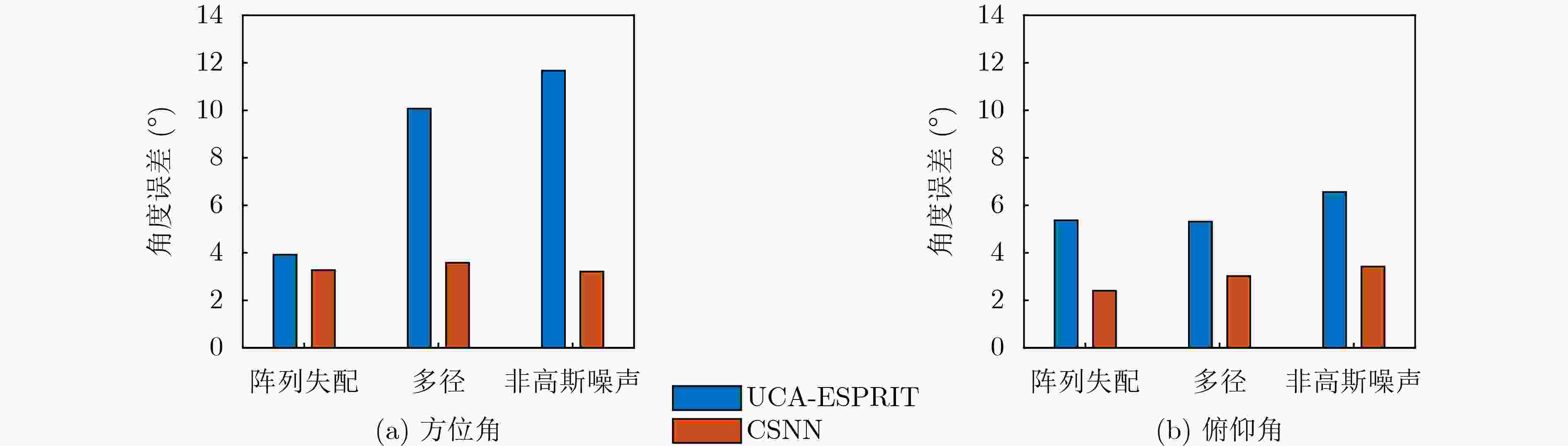 图  8  CSNN与UCA-ESPRIT在不同干扰下的角度估计误差