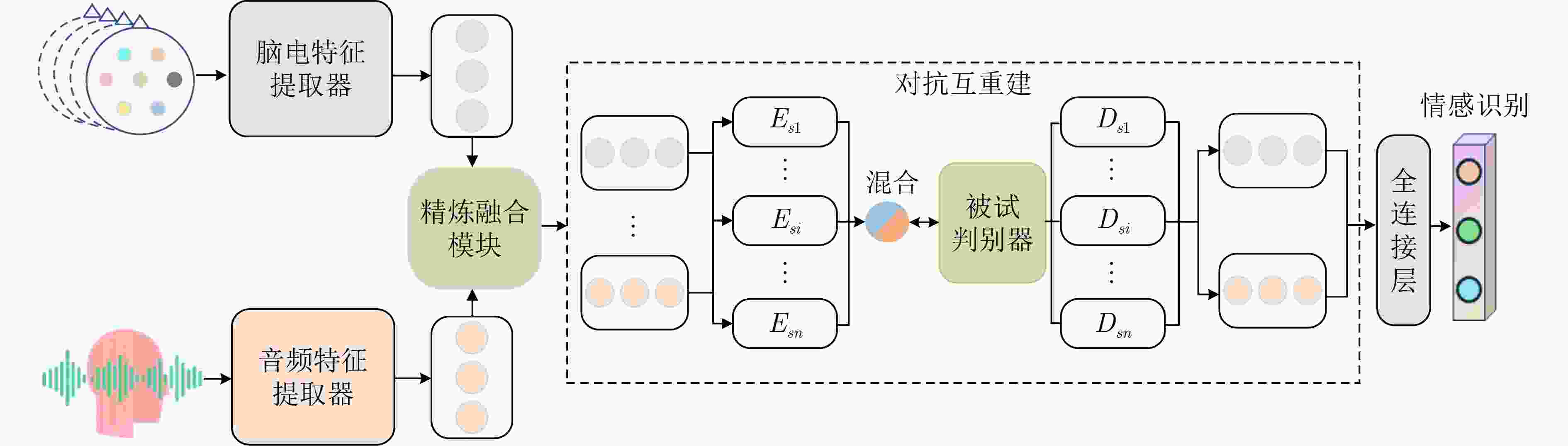 摘要: 随着情感计算的不断发展,基于多模态信号的情绪识别方法得到了广泛关注。脑电情感信号因受试个体的不同存在较大的分布差异,导致分类识别率不高。为了解决现有情绪识别方法中单一模态存在的噪声大、个体差异明显等问题,该文结合脑电信号(EEG)与语音信号提出一种基于双流注意力与对抗互重建的双模态情绪识别方法。在脑电模态方面,设计集成时间帧-通道联合注意力与Mamba网络的双重特征提取器,实现对关键时序片段与频谱特征的深度建模。在语音模态方面,引入帧级随机掩码机制与双向长短时记忆网络结构,增强模型对语音情绪变化的建模能力及抗干扰能力。通过模态精炼融合模块引入梯度反转层与正交投影机制,提升模态对齐与判别能力;进一步地,结合对抗互重建机制,在共享隐空间中重建同类情绪特征,实现跨被试的一致性建模。实验在MAHNOB-HCI, EAV与SEED等多个基准数据集上验证了所提方法的有效性,结果表明该模型在跨个体情绪识别与模态信息融合方面具有显著优势,为多模态情感计算提供了一种有效解决方案。Abstract: