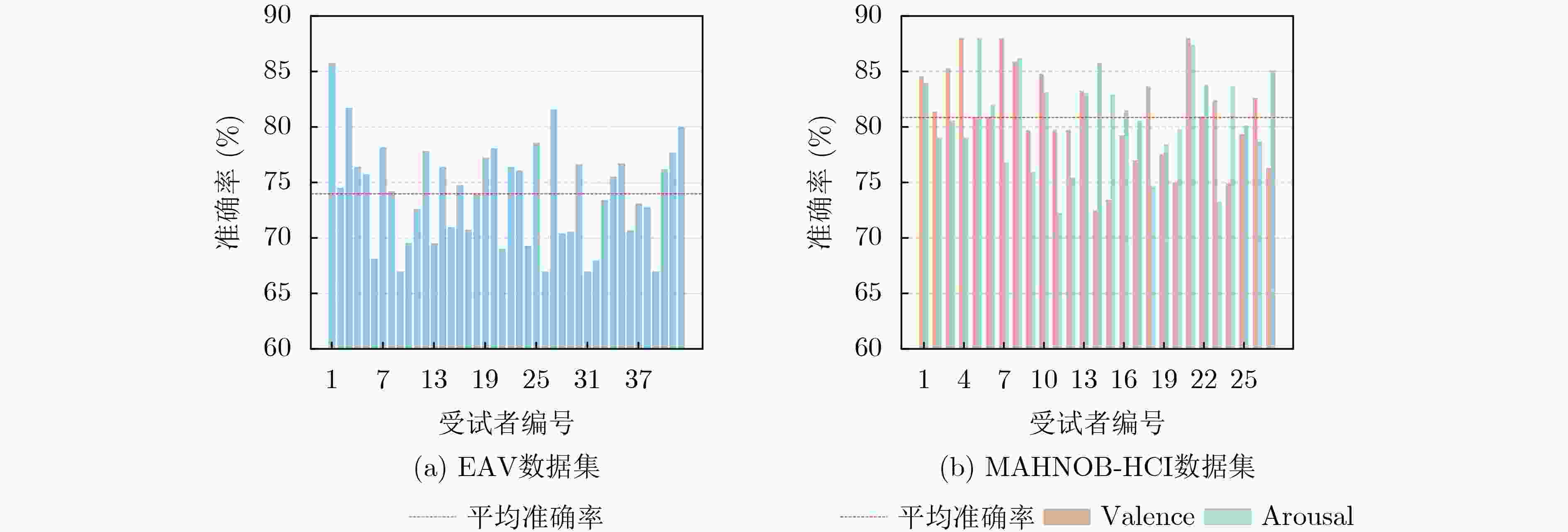 验证方法 模型 准确率 (%) Valence Arousal 跨被试验证 SVM[29] 59.63 61.82 KNN[30] 60.27 63.71 Huang等人[31] 75.63 74.17 Li等人[32] 70.04 72.14 Zhang等人[33] 73.55 74.34 孙强等人[12] 79.99 78.59 本文方法 81.09 80.11 被试依赖交叉验证 SVM[29] 73.19 73.94 KNN[30] 76.64 77.24 Salama等人[34] 96.13 96.79 Zhang等人[33] 96.82 97.79 Chen等人[35] 89.96 90.37 Wang等人[36] 96.69 96.26 孙强等人[12] 97.02 97.36 本文方法 98.14 98.37 表 2 EAV数据集实验结果
