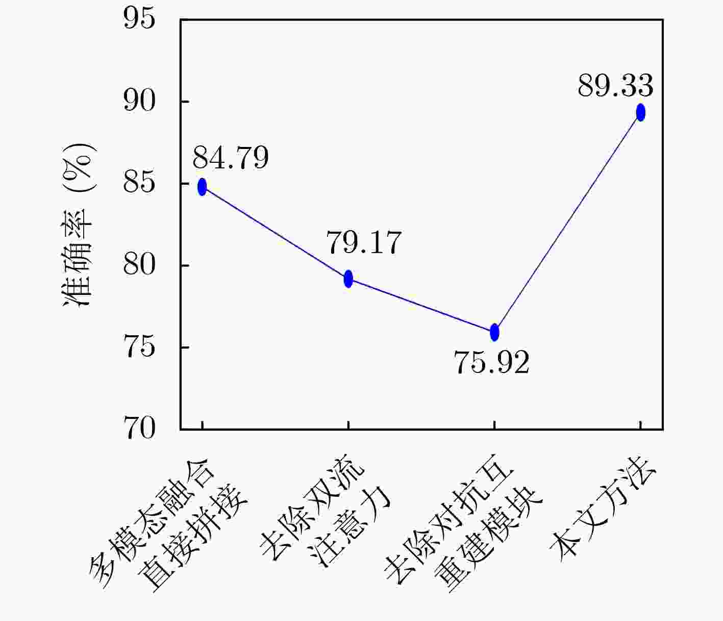 消融设置 保留损失项 准确率(%) 移除模态对齐损失 $ L\mathrm{_{adv}} $,$ L\mathrm{_{rec}} $ 86.16 移除互重建损失 $ L\mathrm{_{adv}} $,$ L\mathrm{_{ali}} $ 87.02 移除被试对抗损失 $ L\mathrm{_{ali}} $,$ L\mathrm{_{rec}} $ 86.29 完整模型 $ L\mathrm{_{adv}} $,$ L\mathrm{_{ali}} $,$ L\mathrm{_{rec}} $ 89.33 -