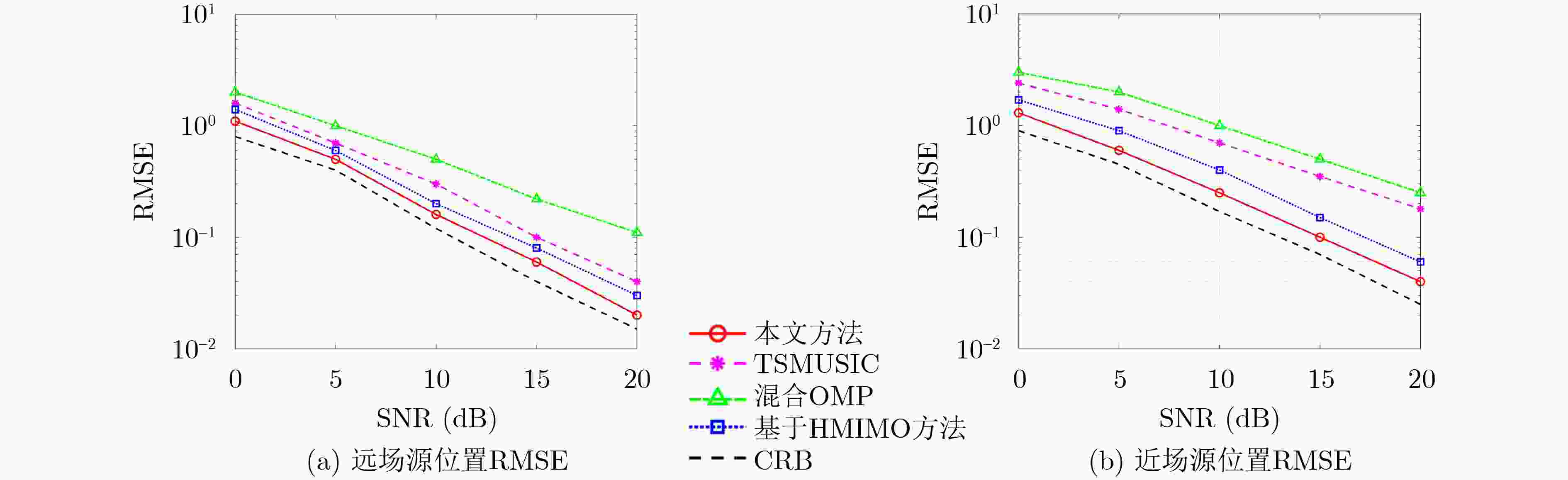 仿真参数/单位 取值 近场源${K_1}$(个) 2 远场源${K_2}$(个) 2 天线数量$N$(根) 64 反射单元数${N_R}$(个) 16×16 噪声功率${\sigma ^2}$(dBm) −174 最大层数${L_{\max }}$(层) 3 初始角度步长$\Delta _0^\theta $,$\Delta _0^\phi $(°) 10 初始距离步长$\Delta _0^d$(m) 0.5 步长缩减因子${\delta _\Delta }$ 0.5 正则化衰减率${\delta _\varepsilon }$ 0.5 初始调谐因子${\varepsilon _0}$ 0.1 -