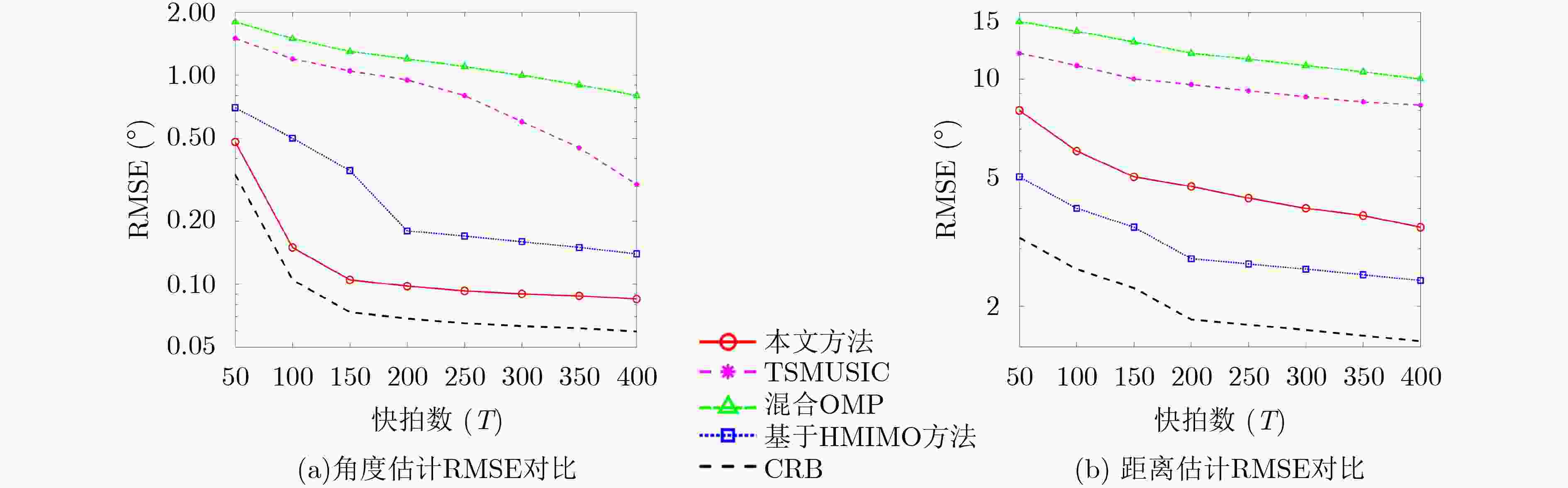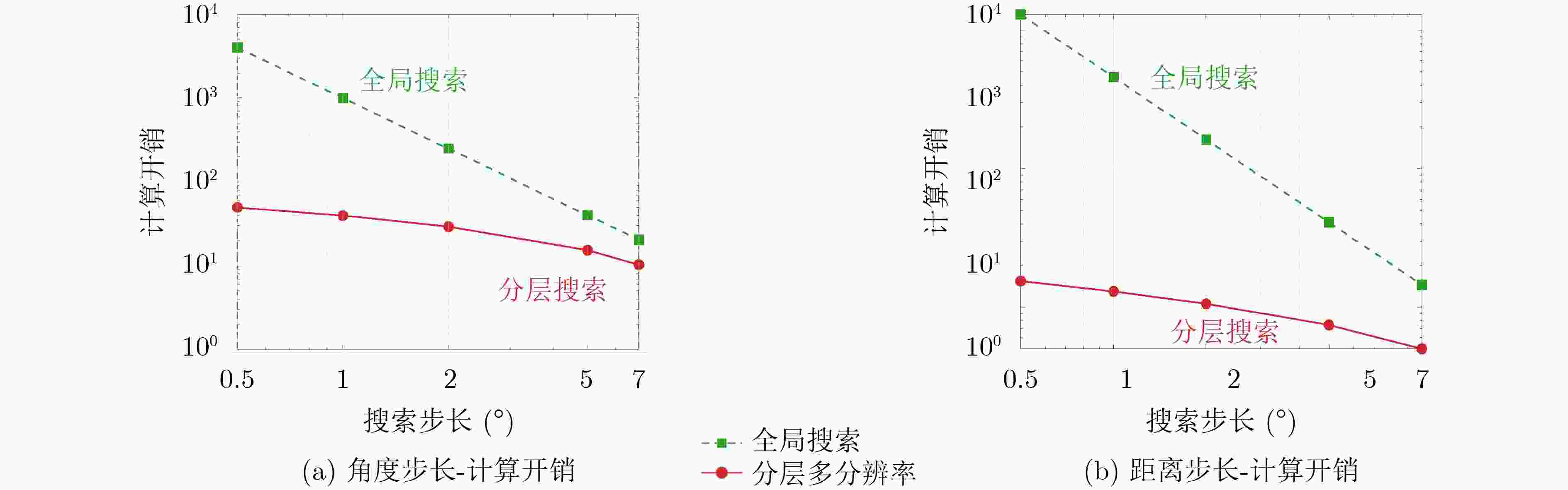 (1) 输入参数:$\Delta _0^\theta $; $\varepsilon _0^\theta $; $\delta _\Delta ^\theta $;$\delta _\varepsilon ^\theta $;码字索引$I = 0$;最大迭代层数$L_{\max }^\theta $;最小步长精度$\Delta _{\min }^\theta $; (2) 初始化参数:4阶累积量矩阵${{\boldsymbol{C}}_1}$,奇异值分解(SVD),获取信号子空间和噪声子空间;获取仰角范围${\varTheta ^1}$; (3) ${\text{while }}l \le {L_{\max }}{\text{ \& \& }}{\Delta ^{l + 1}} < \Delta _{\min }^\theta {\text{ do}}$ (4) $ {\boldsymbol{B}}_l^\theta = \left\{ {{\boldsymbol{b}}(\theta _{\min }^l),{\boldsymbol{b}}(\theta _{\min }^l + \Delta {\theta ^l}),} \right.\left. { \cdots ,{\boldsymbol{b}}(\theta _{\max }^l)} \right\} $,权重矩阵${\boldsymbol{W}}_l^\theta $ (5) $ {\text{if }}\left\| {{{{{\hat {\boldsymbol{C}}}}}_{{S_1}}} - {\boldsymbol{B}}_l^\theta {\boldsymbol{T}}_l^\theta } \right\| \le \sqrt {\varepsilon _l^\theta } {\text{ then}} $ (6) $ \mathop {\min }\limits_{{\boldsymbol{T}}_\theta ^{{l_2}}} {\left\| {{\boldsymbol{W}}_l^\theta {\boldsymbol{T}}_l^\theta } \right\|_1} $ (7) 计算码字能量:$ {\boldsymbol{E}}(q) = \sum\limits_{k = 1}^K {{{\left| {{\boldsymbol{T}}_l^\theta (q,k)} \right|}^2}} = \left\| {{\boldsymbol{T}}_l^\theta (q,:)} \right\|_2^2 $ (8) 能量升序排列返回索引:$[V,{\text{opt}}] = Sort[E({q_1}),E({q_2}), \cdots ,E({q_Q})]$ (9) 选择前$K$个能量构建信任区间:$ {\varTheta ^{l + 1}} = \mathop \cup \limits_{k = 1}^K {\left\{ {b({\theta _k} \pm {{\Delta _l^\theta } \mathord{\left/ {\vphantom {{\Delta _l^\theta } 2}} \right. } 2})} \right\}_{k \in \kappa }} $ (10) 更新调谐因子、步长、层数:$\varepsilon _{l + 1}^\theta = {\delta _\varepsilon } \cdot \varepsilon _l^\theta $,$\Delta _{l + 1}^\theta = {\delta _\Delta } \cdot \Delta _l^\theta $,$l = l + 1$ (11) ${\text{end while}}$ (12) 输出参数:$\stackrel \frown{\theta } $ 表 1 实验仿真参数设置