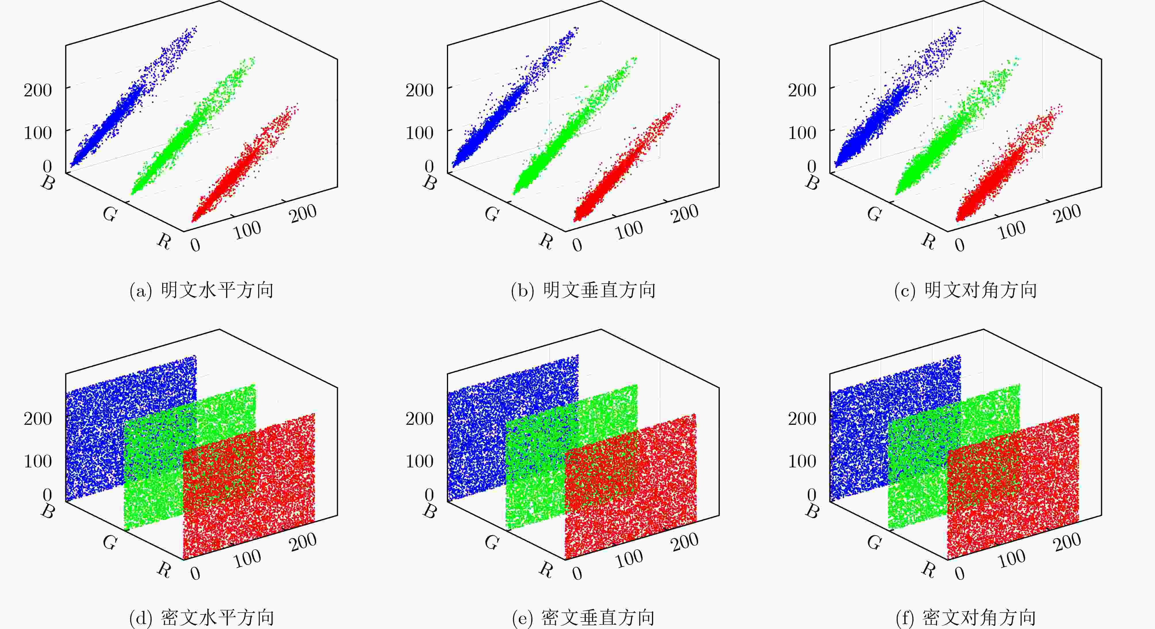 图像 方向 明文图像 密文图像 R G B R G B 图像01 水平 0.9914 0.9898 0.9888 – 0.0002 – 0.0018 – 0.0021 垂直 0.9934 0.9920 0.9914 – 0.0032 0.0012 – 0.0001 对角 0.9855 0.9827 0.9812 0.0018 0.0014 – 0.0034 图像02 水平 0.9953 0.9897 0.9801 – 0.0003 0.0023 – 0.0005 垂直 0.9922 0.9834 0.9692 – 0.0006 0.0040 – 0.0014 对角 0.9886 0.9760 0.9552 0.0009 0.0011 0.0006 图像03 水平 0.9793 0.9869 0.9888 – 0.0005 0.0028 0.0037 垂直 0.9774 0.9840 0.9869 0.0015 0.0030 0.0017 对角 0.9632 0.9746 0.9790 0.0038 0.0003 0.0012 表 3 密文图像相关系数比较结果