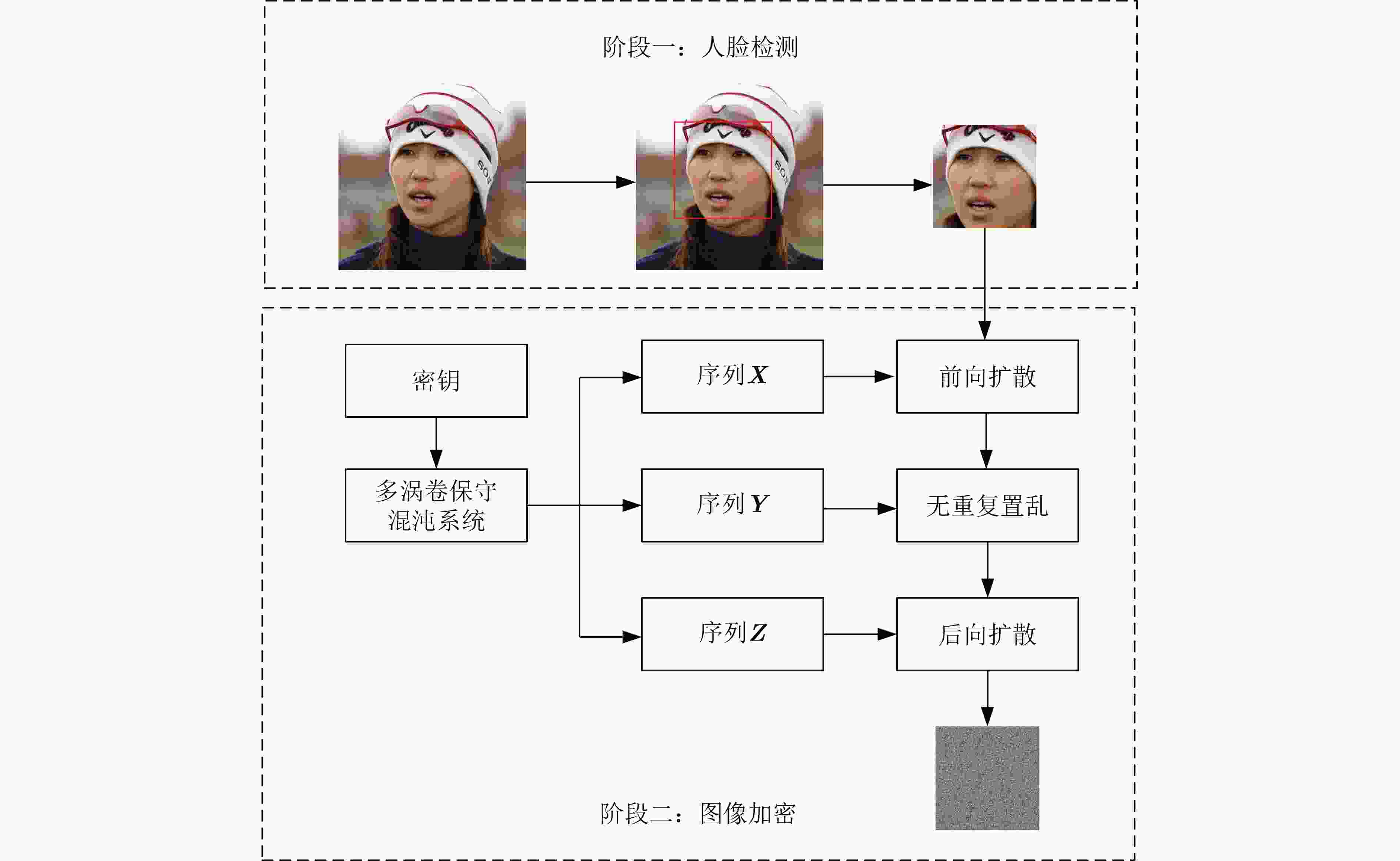 Objective Existing conservative chaotic systems often suffer from structural simplicity and weak nonlinear characteristics, and research on complex dynamical behaviors such as multi-scroll structures remains limited, constraining their potential in engineering applications. To address security risks in face image transmission and the inefficiency of traditional global encryption methods, this study constructs a conservative chaotic system with multi-scroll characteristics, investigates its complex dynamical behavior, and designs a face-detection-based selective image encryption algorithm targeting sensitive regions. The work explores the practical application of conservative chaotic systems in image encryption. Methods A five-dimensional conservative hyperchaotic system is constructed on the basis of the generalized Hamiltonian system, and the controlled generation of multi-scroll chaotic flows is achieved through modulation of the Hamiltonian energy function. The Hessian matrix is used to analyze the stationary points of the Hamiltonian energy function, thereby revealing the relationship between scroll structures and stationary points. The spatial distribution of multi-scroll chaotic flows is further characterized by energy isosurfaces. The complex dynamical behaviors of the proposed system are investigated using Lyapunov exponent spectra and phase diagrams, while the sequence complexity is evaluated with the SE complexity algorithm. On this basis, an image encryption algorithm integrated with face detection technology is designed. The algorithm applies a diffusion–scrambling strategy to selectively encrypt facial regions. The security performance is evaluated through multiple indicators, including key space, pixel correlation, and information entropy. Results and Discussions Analysis of stationary points in the Hamiltonian energy function revealed a positive correlation between their number and scroll generation. Extreme points primarily drive scroll formation, whereas saddle points define transition zones, indicating that the scroll structure can be effectively regulated through the Hamiltonian energy function. The Lyapunov exponent spectrum of the multi-scroll conservative chaotic system is distributed symmetrically about the x-axis and exhibits an integer Lyapunov dimension, fully confirming the system’s volume-conserving property. Under different initial conditions, the system demonstrates diverse coexistence behaviors, including phase trajectories of varying types and scales. Complexity evaluation further showed that the multi-scroll conservative chaotic system achieves markedly higher spectral entropy complexity, supporting its potential for image encryption applications. Experimental validation demonstrated that the proposed algorithm can accurately detect faces and selectively encrypt sensitive regions, thereby avoiding the computational inefficiency of indiscriminate global encryption. Moreover, the algorithm exhibited strong performance across multiple security metrics. Conclusions A conservative chaotic system is constructed on the basis of the generalized Hamiltonian system, and its complex dynamical behavior and application in image encryption are investigated. The study provides theoretical references for the generation of multi-scroll conservative chaotic flows and offers practical guidance for the application of image encryption technology. -