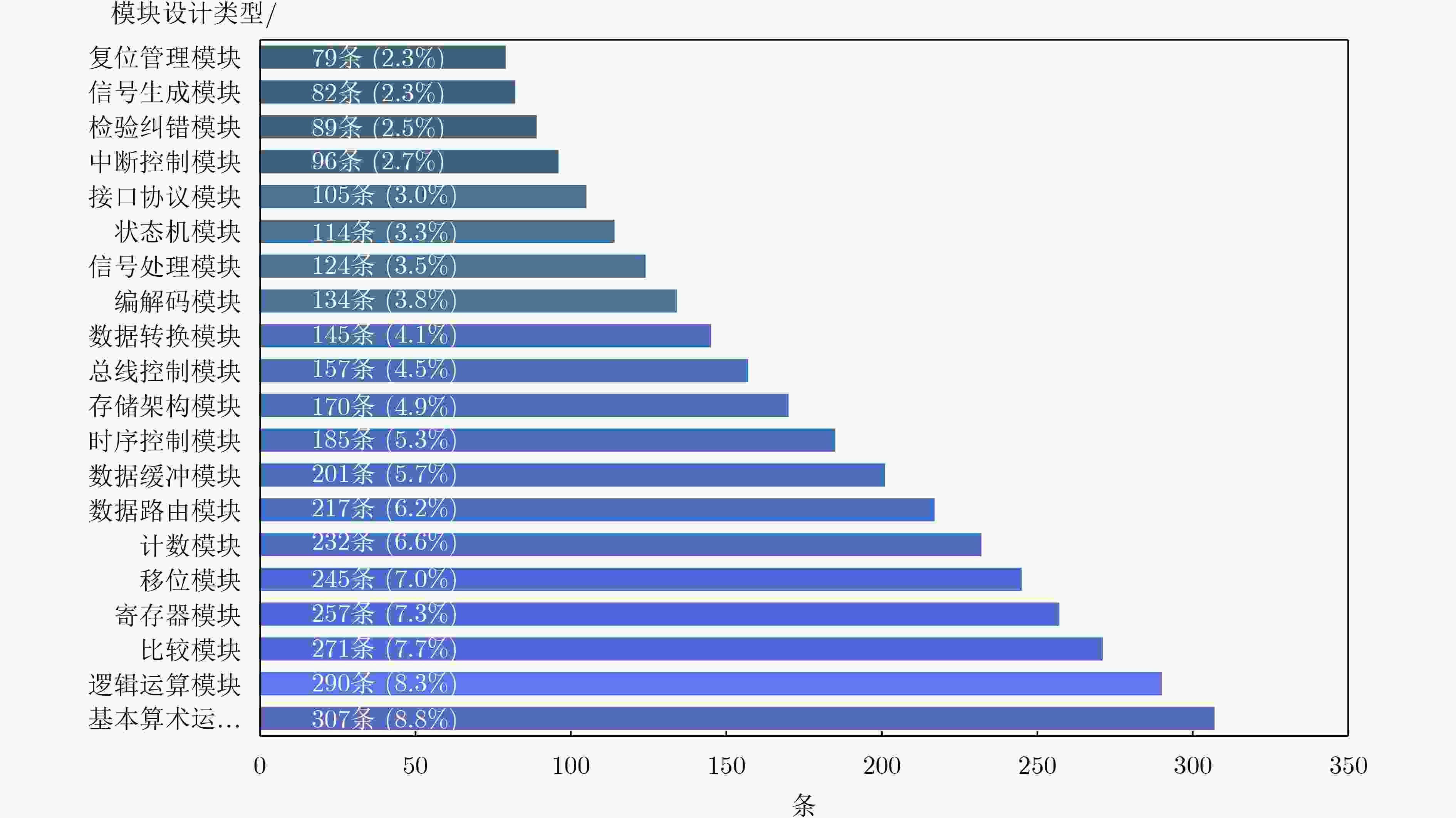 path, Register retuning, Pipeline}(3) AugmentedDataset ← Ø; (4) foreach seed code seed in Seeds do: (5) BasePPA ← EvaluatePPA(seed) (6) VariantSet ← ParallelNGTSSearch(seed, BasePPA, TargetCount) (7) foreach variant i in VariantSet do: (8) Δ$ {PPA}_{i} $ ← $ \frac{|{PPA}_{i}-BasePPA|}{BasePPA} $; (9) if Δ$ {PPA}_{i} $ > threshold then (10) AugmentedDataset ← AugmentedDataset ∪ {(variant.code, $ {PPA}_{i} $)} (11) end (12) end (13) end (14) Function ParallelNGTSSearch(seed, BasePPA, TargetCount): (15) while |VariantSet| < TargetCount do: (16) Execute multiple search paths in parallel:; (17) path ← ExplorePath(seed, random_depth(1,2,3)); (18) Batch PPA evaluation of valid paths; (19) Filter variants with significant PPA changes into VariantSet; (20) end (21) return VariantSet; (22) end (23) Function ExplorePath(current_code, max_depth): (24) for path = 1 to max_depth do: (25) AvailableTransforms ← GetApplicableTransforms(current_code, T) (26) selected_T ← RandomChoice(AvailableTransforms) (27) new_code ← selected_T.transform(current_code) (28) if VerifyEquivalence(current_code, new_code) then: (29) current_code ← new_code (30) end (31) else (32) break; (33) end (34) end (35) return current_code; (36) end (37) Function EvaluatePPA(code): (38) Obtain through Vivado toolchain synthesis: (39) return {LUT count, FF count, Max frequency, Total power, Critical path delay}; (40) end (41) return AugmentedDataset; 表 2 不同模型在典型硬件模块上的详细PPA指标对比